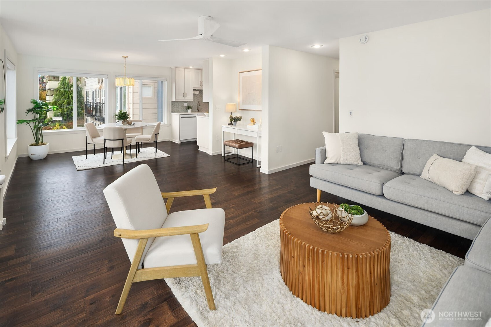 Spectacular, light-filled corner unit with sweeping downtown views in vibrant Lower Queen Anne. Large south-facing windows provide abundant natural light. Features two spacious bedrooms; the primary includes an ensuite bath and built-in closets. Both bathrooms have been tastefully updated. Enjoy heated floors throughout, new Low-E glass, and a full-size washer/dryer. Includes two secure parking spaces, bike storage, and a private storage unit. Steps to cafes, restaurants, grocery stores, Seattle Center, and Lake Union. Close to SLU and offices for Amazon, Google & Meta. Well-funded HOA.