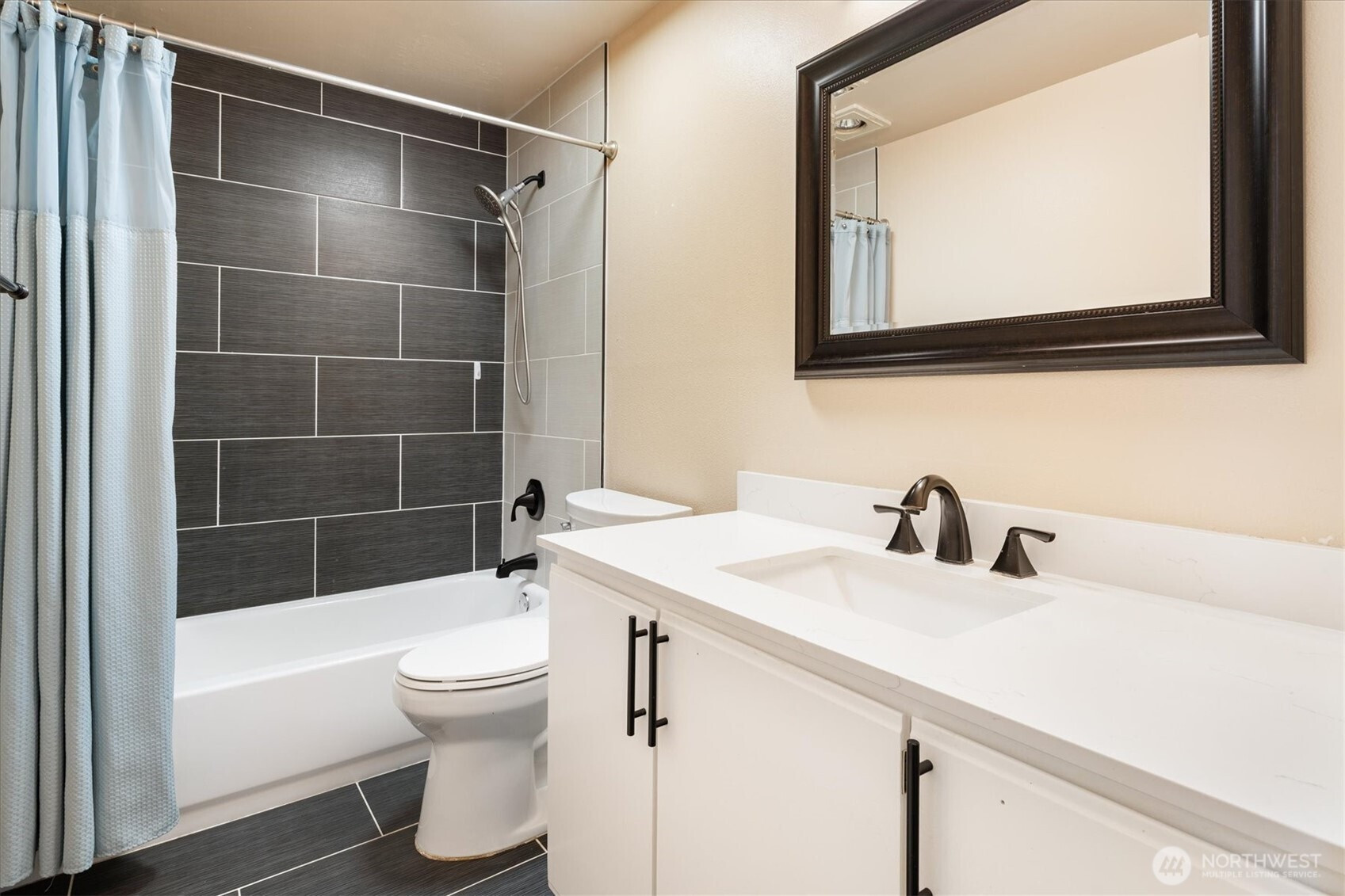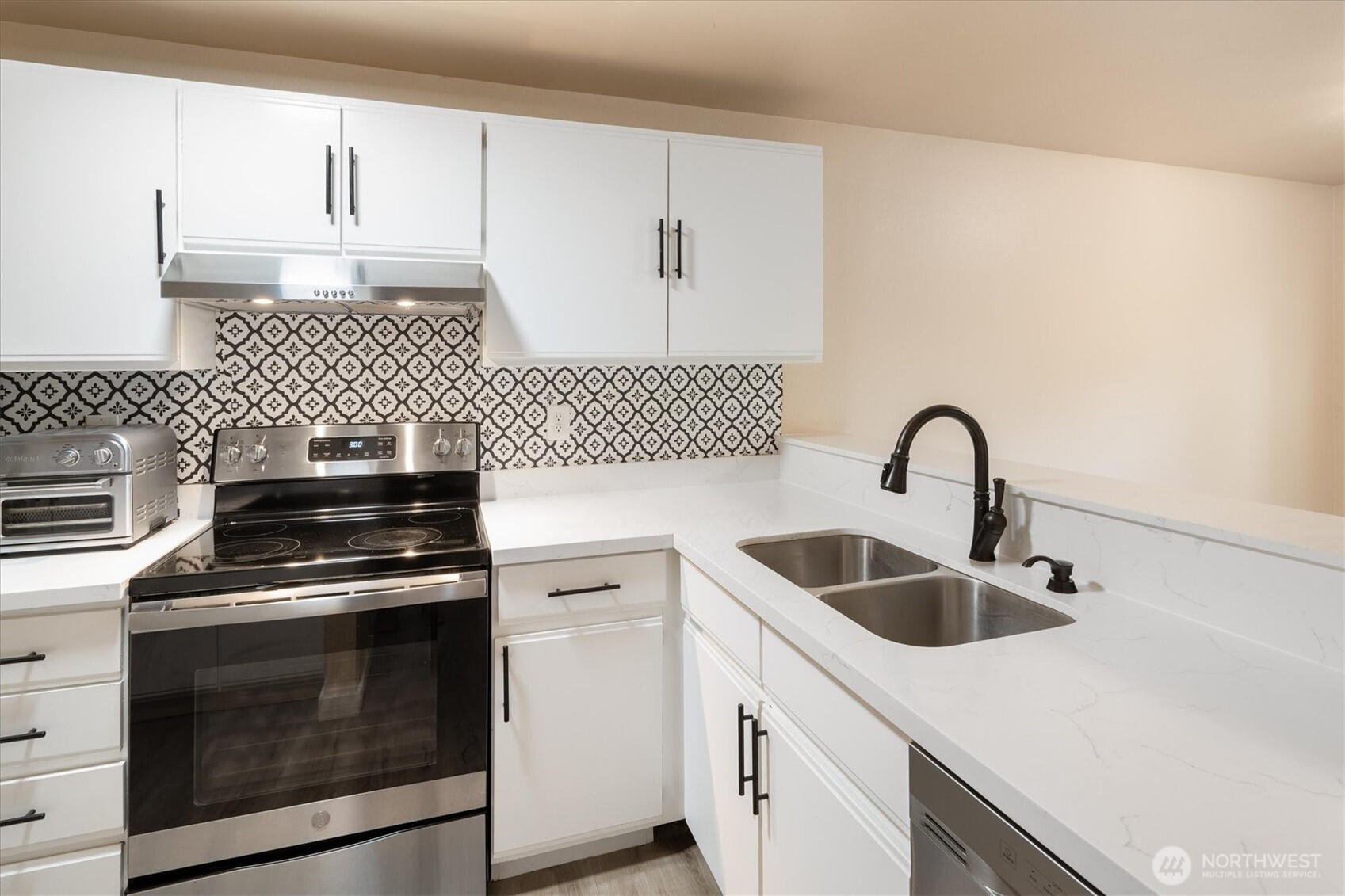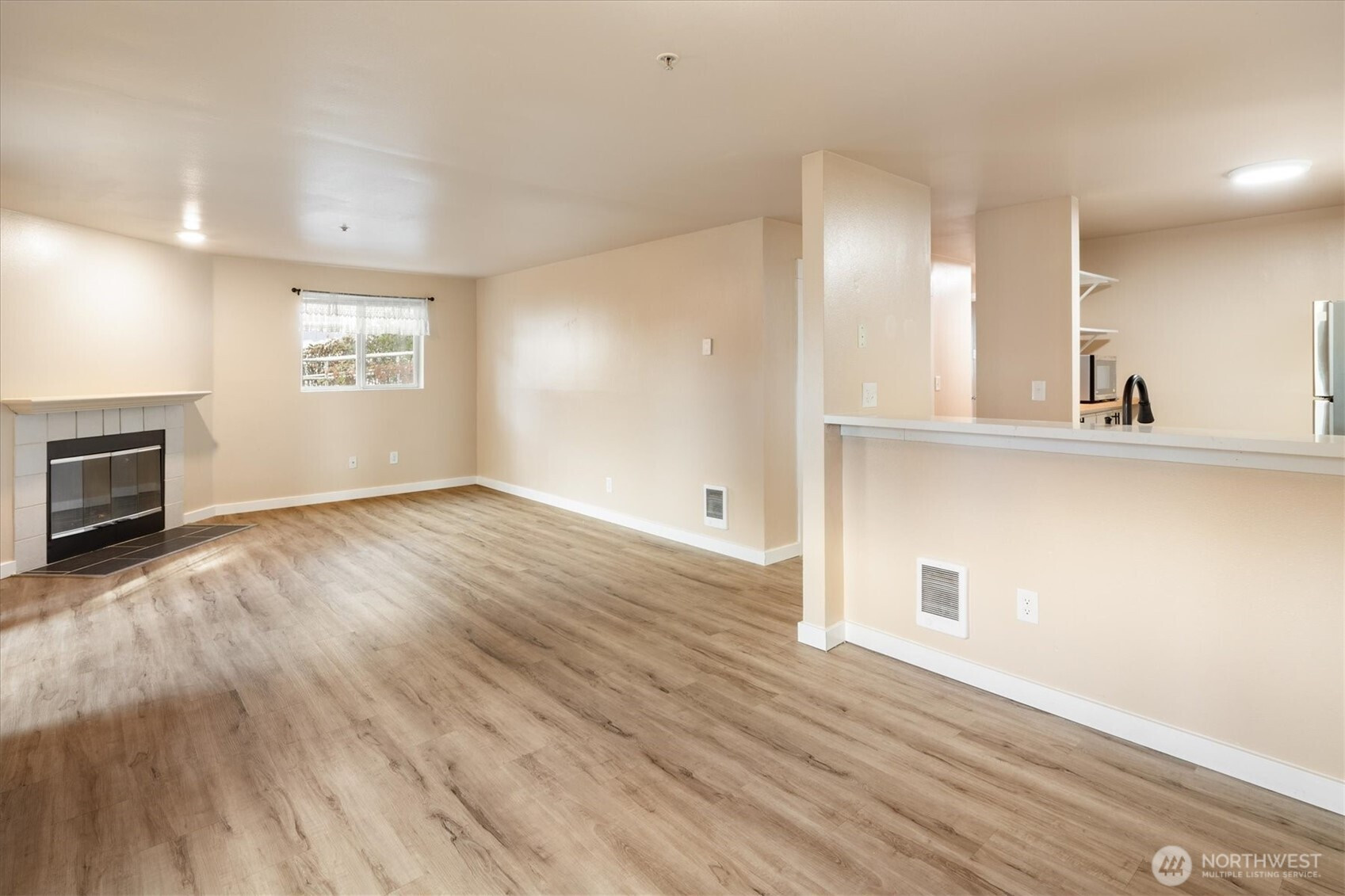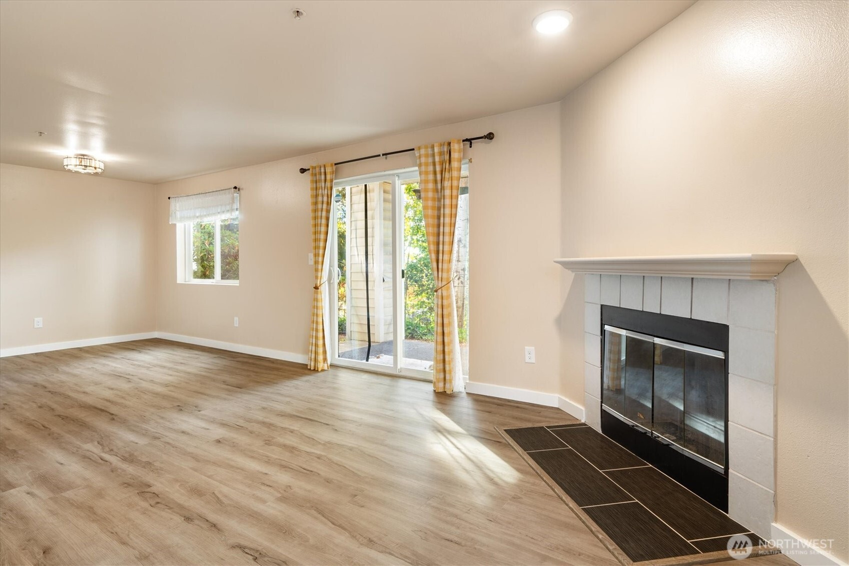 Well-designed 2-bdrm/2-bth unit with very private west facing covered deck with access to the shared green space. This home features beautiful/durable luxury vinyl throughout the home. The kitchen, with its lovely patterned backsplash, is open to the dining area/living room w/ wood burning fireplace. Both bthrms have been remodeled with a contemporary feel using high quality finishes. Range, fridge & washer/dryer all come with the home. Enjoy community outdoor pool, hot tub & clubhouse. Unbeatable convenience. Only 2 blocks to I-405 on-ramps & so close to the Seahawks training facility, Downtown Bellevue, Newcastle, The Landing, Southcenter and SeaTac Airport. Pet friendly. No rental cap. Great investment for a low maintenance home!