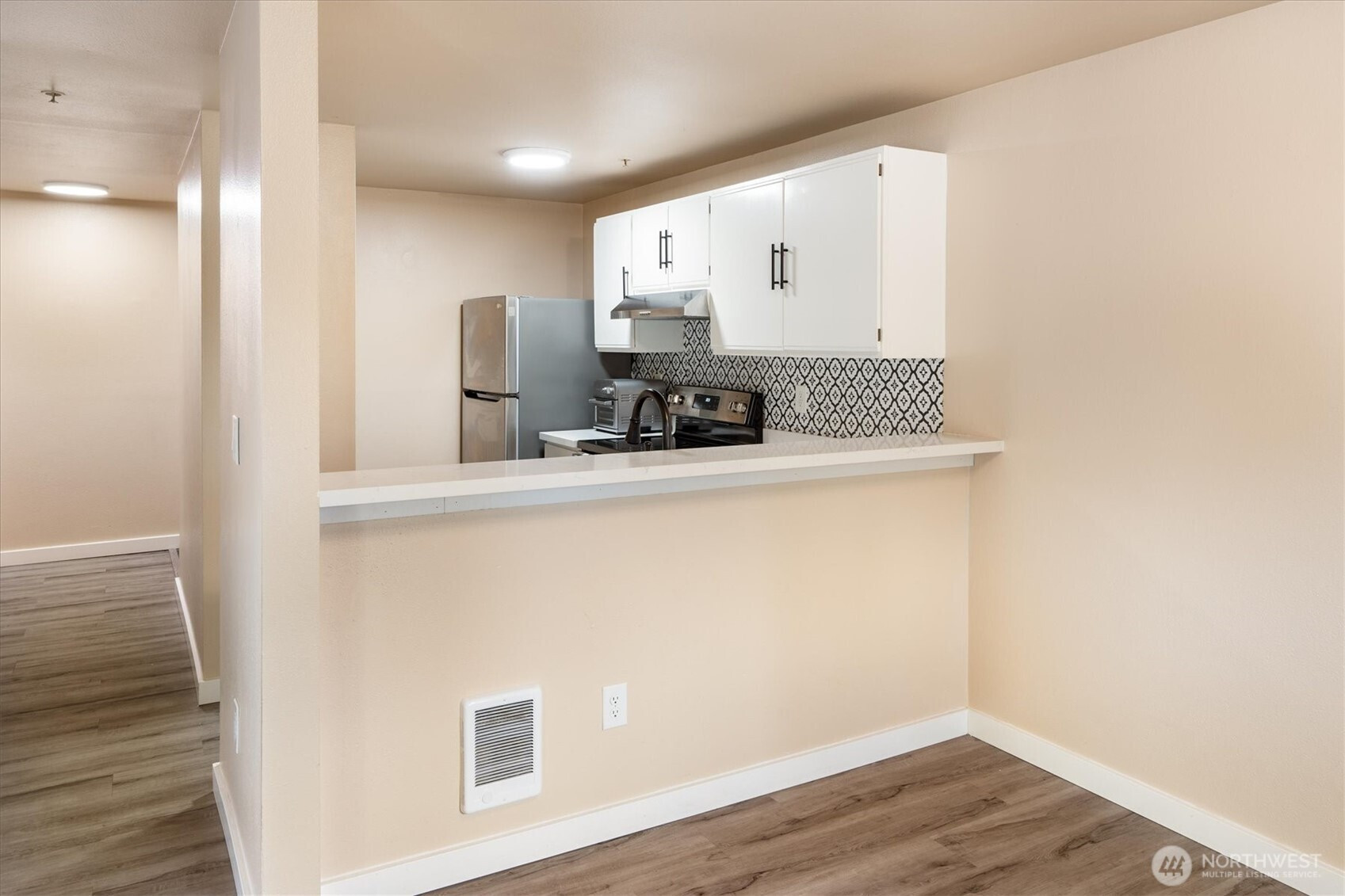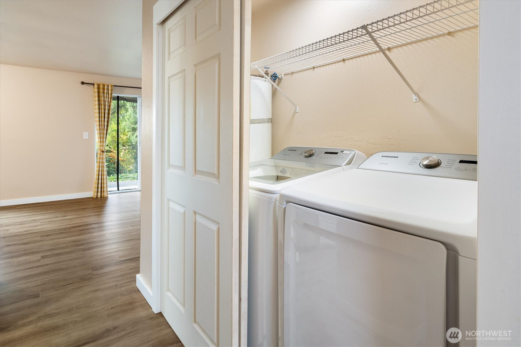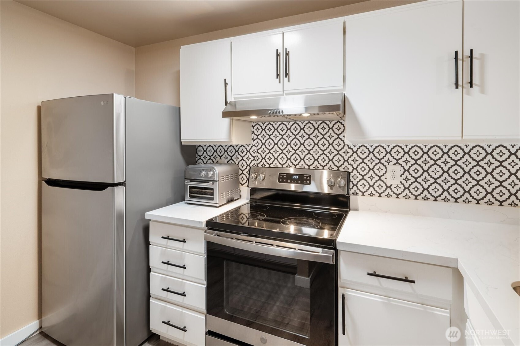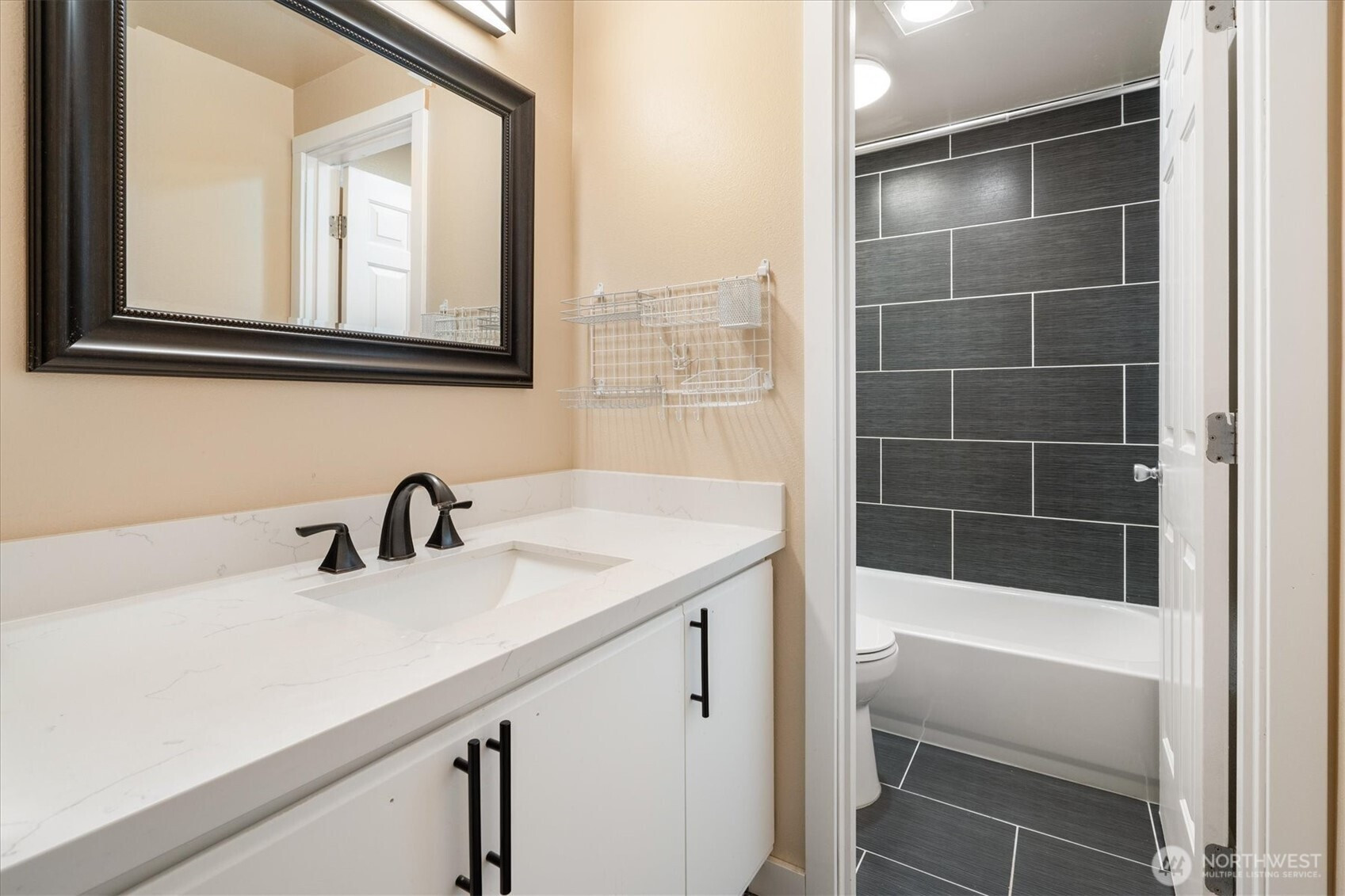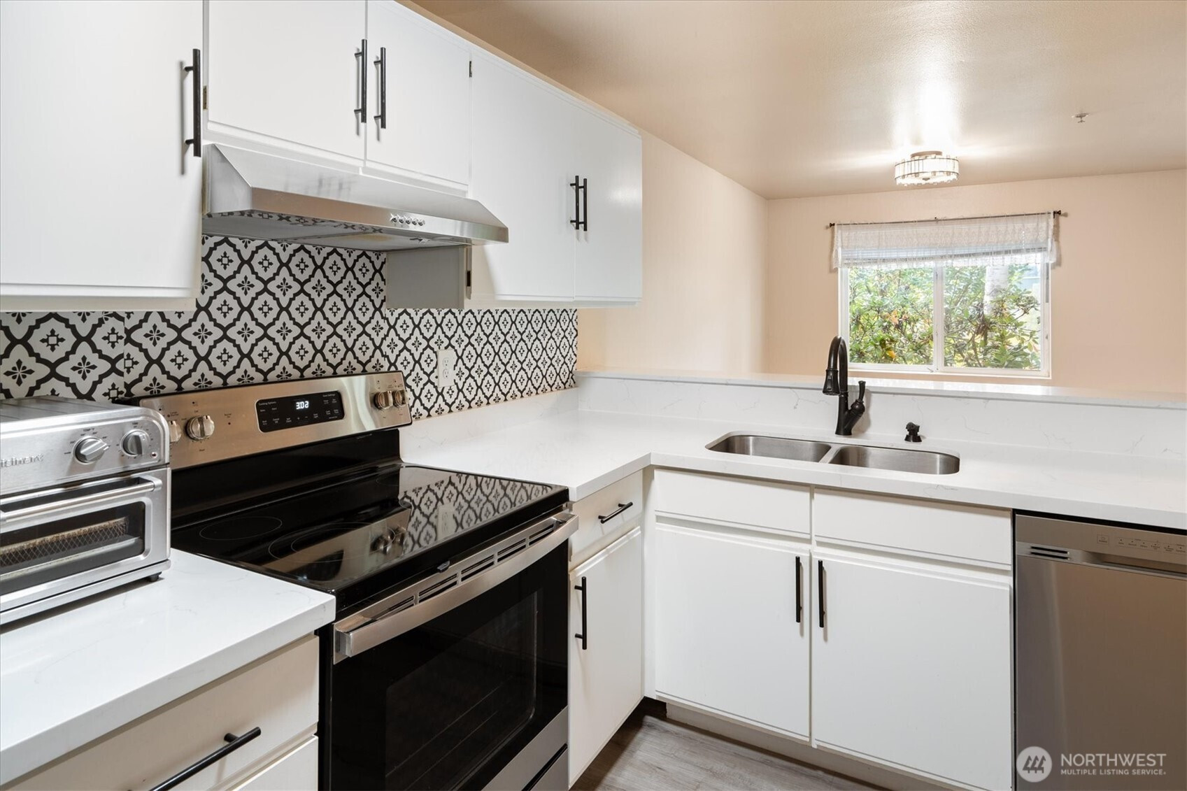 Well-designed 2-bdrm/2-bth unit with very private west facing covered deck with access to the shared green space. This home features beautiful/durable luxury vinyl throughout the home. The kitchen, with its lovely patterned backsplash, is open to the dining area/living room w/ wood burning fireplace. Both bthrms have been remodeled with a contemporary feel using high quality finishes. Range, fridge & washer/dryer all come with the home. Enjoy community outdoor pool, hot tub & clubhouse. Unbeatable convenience. Only 2 blocks to I-405 on-ramps & so close to the Seahawks training facility, Downtown Bellevue, Newcastle, The Landing, Southcenter and SeaTac Airport. Pet friendly. No rental cap. Great investment for a low maintenance home!