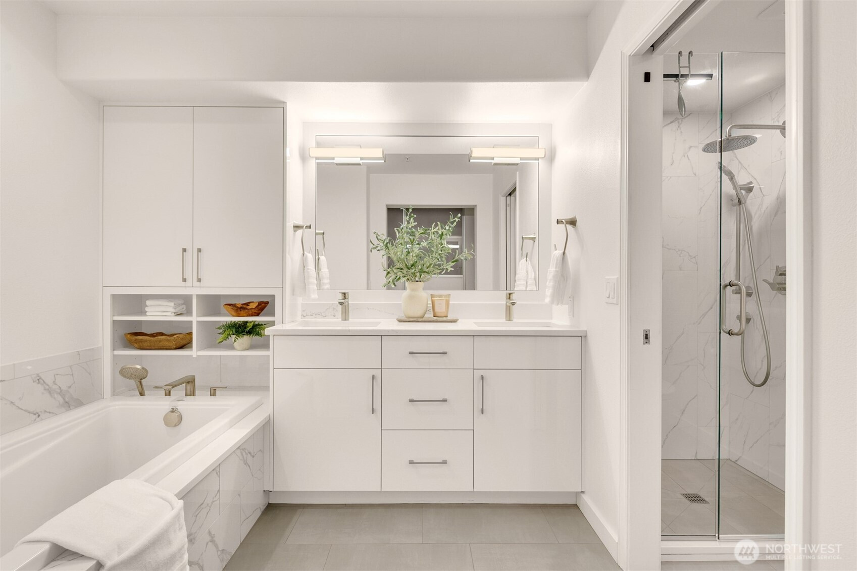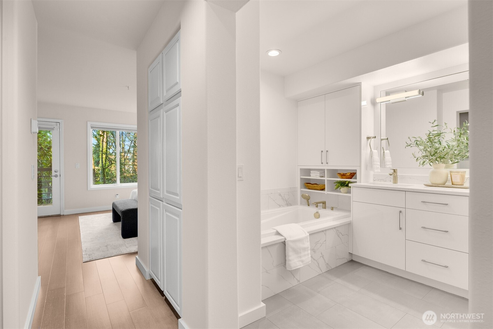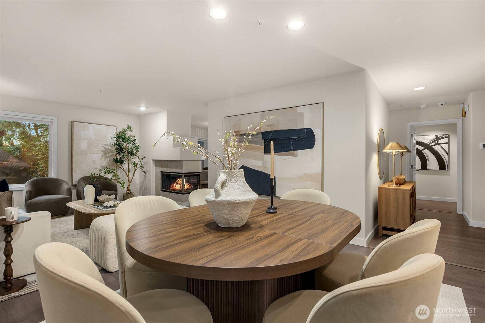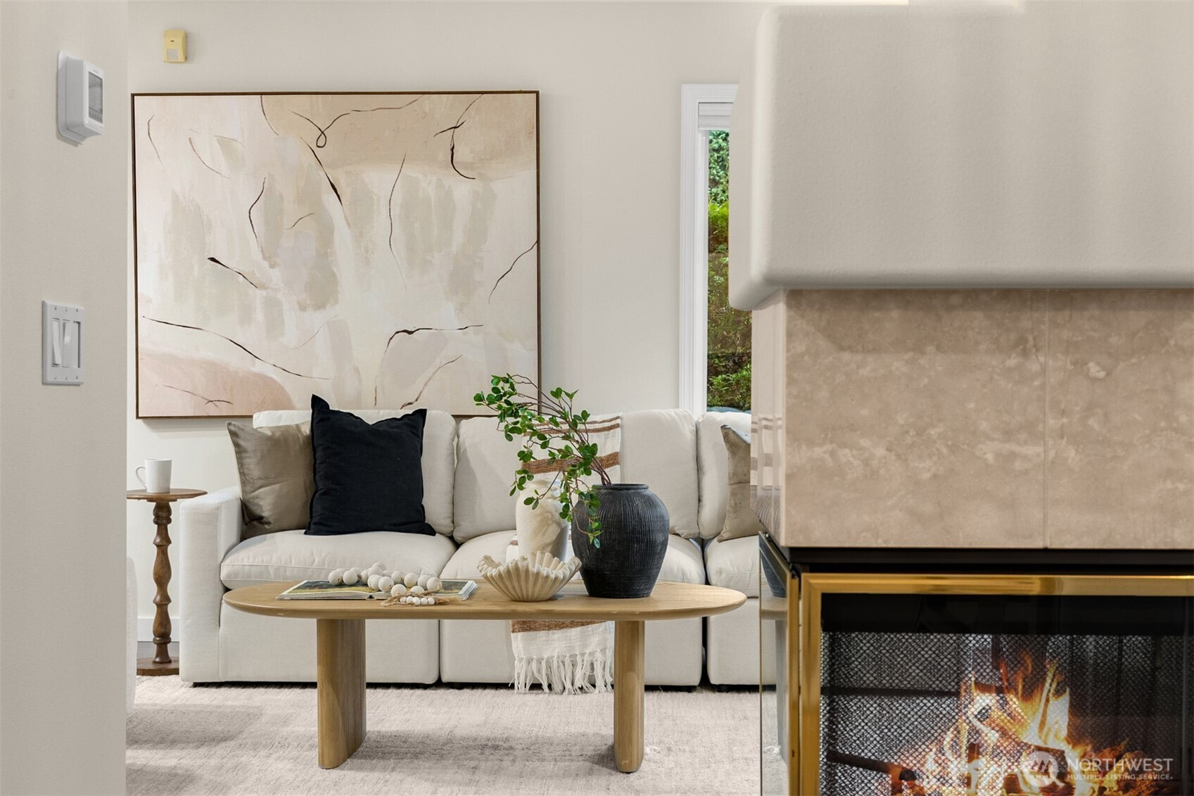 Brightwater Condos - Luxury Corner Unit. Experience effortless living at Brightwater. This premier corner residence offers the ultimate in privacy and convenience with rare, level-entry access—no elevators or stairs required from the garage or guest parking. 3 bedrooms! The expansive formal living and dining rooms flow seamlessly together, creating an ideal layout for entertaining. At the heart of the home, a unique wraparound fireplace provides warmth and ambiance to both the living area and the gourmet kitchen, which features sleek stainless appliances and custom designer tile. Retreat to the primary suite, complete with a private deck overlooking a lush, serene greenbelt. The secondary bedroom is equally impressive with its own ensuite bath, perfect for guests or a home office. Situated just a short, scenic stroll from the vibrant shops, waterfront parks, and world-class dining of Downtown Kirkland, this home perfectly balances secluded tranquility with an urban lifestyle. Updated through out!