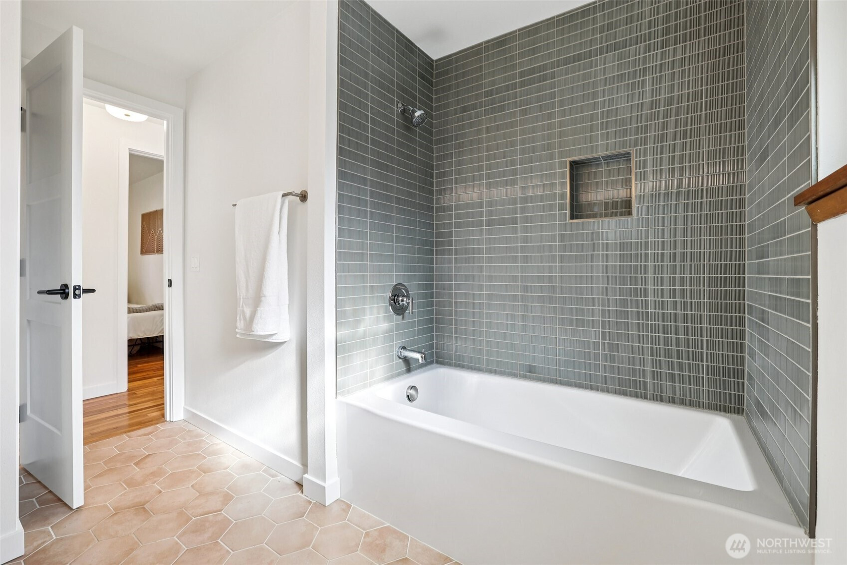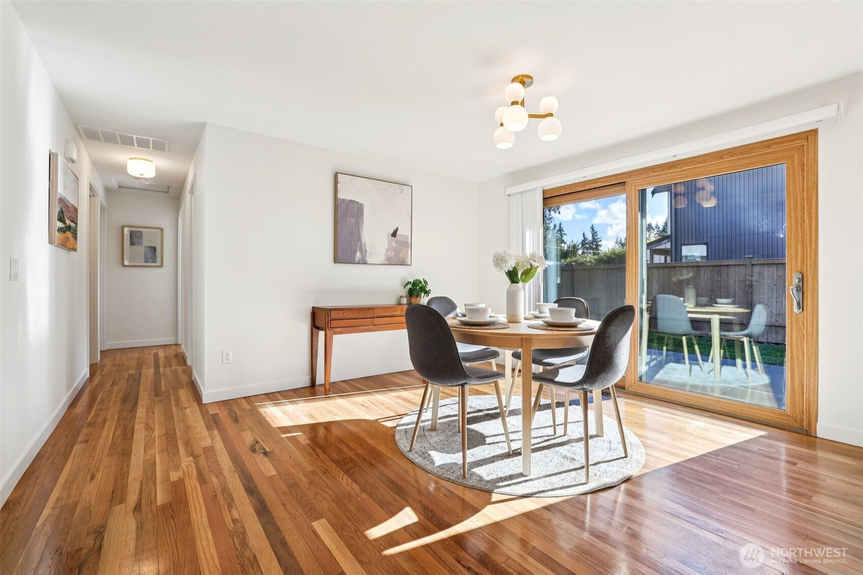 This charming midcentury rambler has been thoughtfully updated. You will love the stylish, refreshed kitchen with subtle color and elegant fixtures, along with striking new cabinets, counters, and appliances. The spacious living and dining areas feature a double-sided fireplace, refinished hardwoods, and large windows that bring in abundant natural light. Enjoy the generous bedrooms and beautifully tiled bathrooms. An oversized laundry room with a wall of cabinets provides flexible space for projects, working from home, or a mudroom drop zone. A newly installed heat pump delivers efficient electric heat and air conditioning for year-round comfort. Additional updates include a new roof, sewer liner, and upgraded electrical panel and service. The fully fenced, level backyard and attached two-car garage offer added convenience and storage. All this on one level! Move-in ready, this home blends classic charm with modern upgrades. Located near excellent Shoreline and Kings schools. Welcome home!