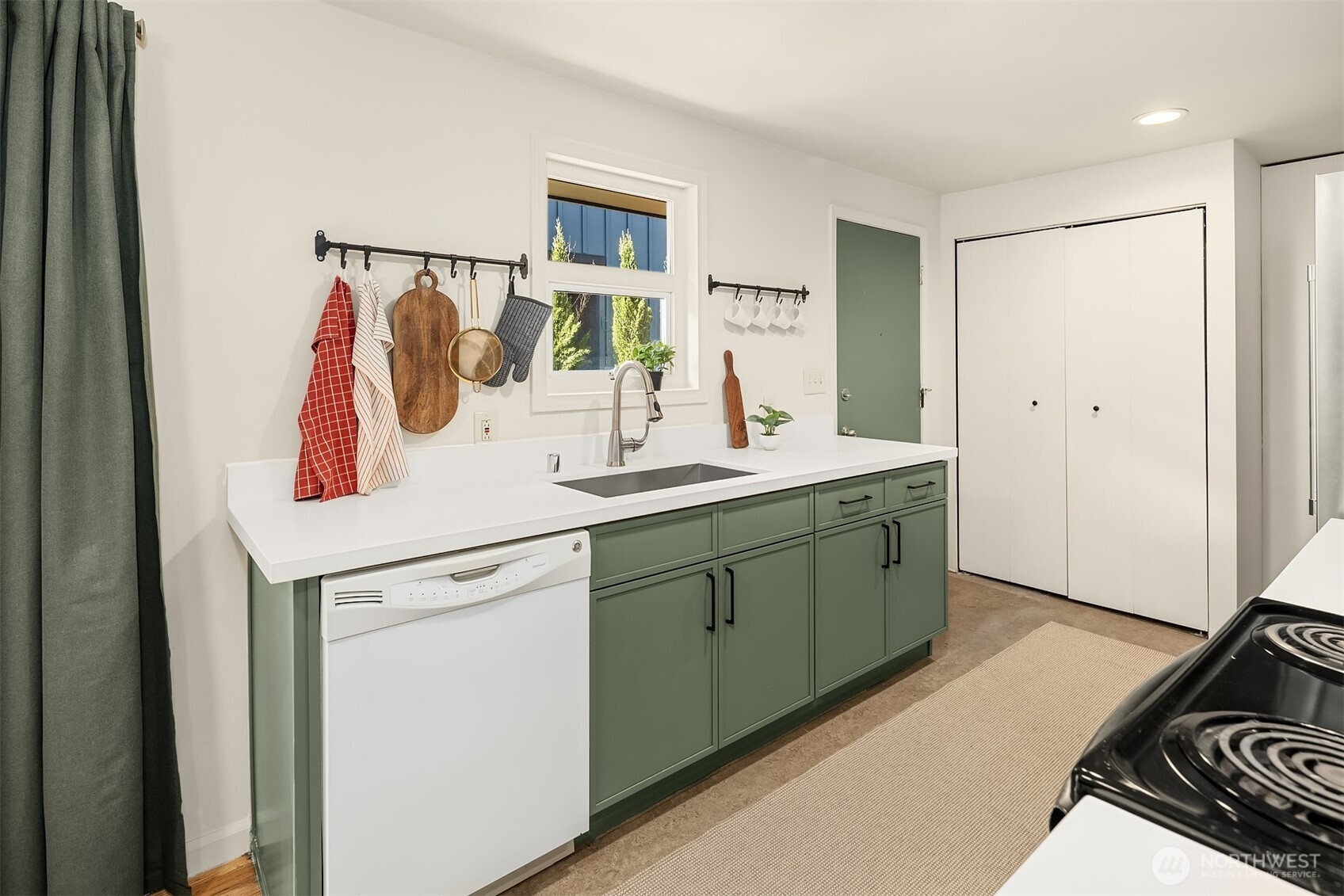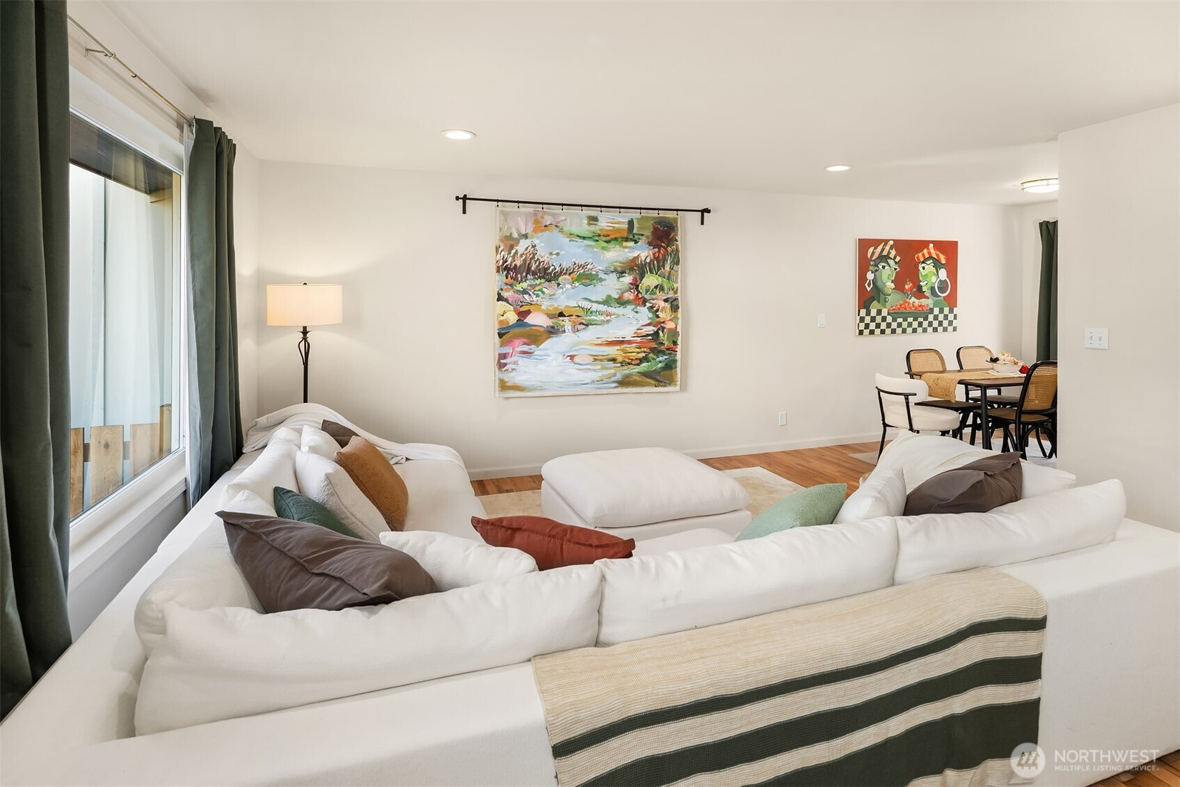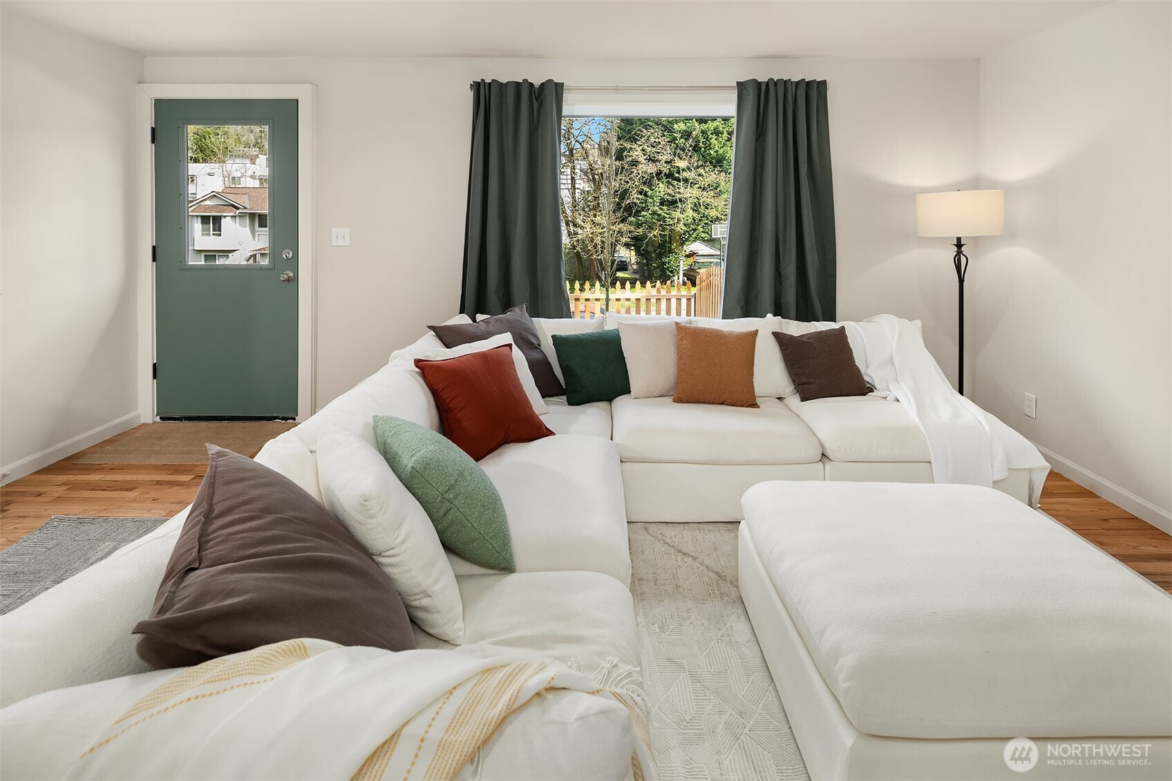 Thoughtfully updated and beautifully staged home offering easy one-level living in the heart of Delridge in West Seattle. A fully fenced front yard and welcoming entry path create a charming first impression, while the newly built deck and private patio provide ideal spaces for relaxing or entertaining. Inside, the light-filled living room features warm hardwood floors and an open layout that flows seamlessly into the dining area. The updated kitchen showcases quartz countertops, stainless steel appliances, custom green cabinetry, and generous workspace, creating a functional and stylish hub for everyday living. Two spacious bedrooms offer comfortable retreats with large windows and hardwood floors. Outdoor living is a highlight with multiple seating areas, landscaped plantings, and a private deck surrounded by greenery, creating a peaceful setting for everyday living or hosting guests. Enjoy the perfect balance of residential calm and city accessibility.