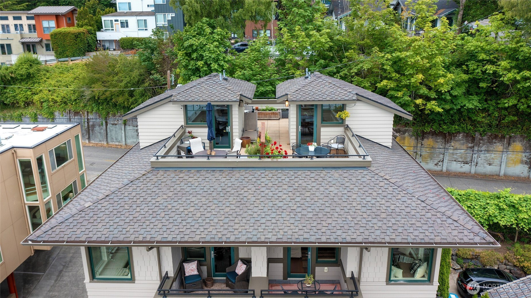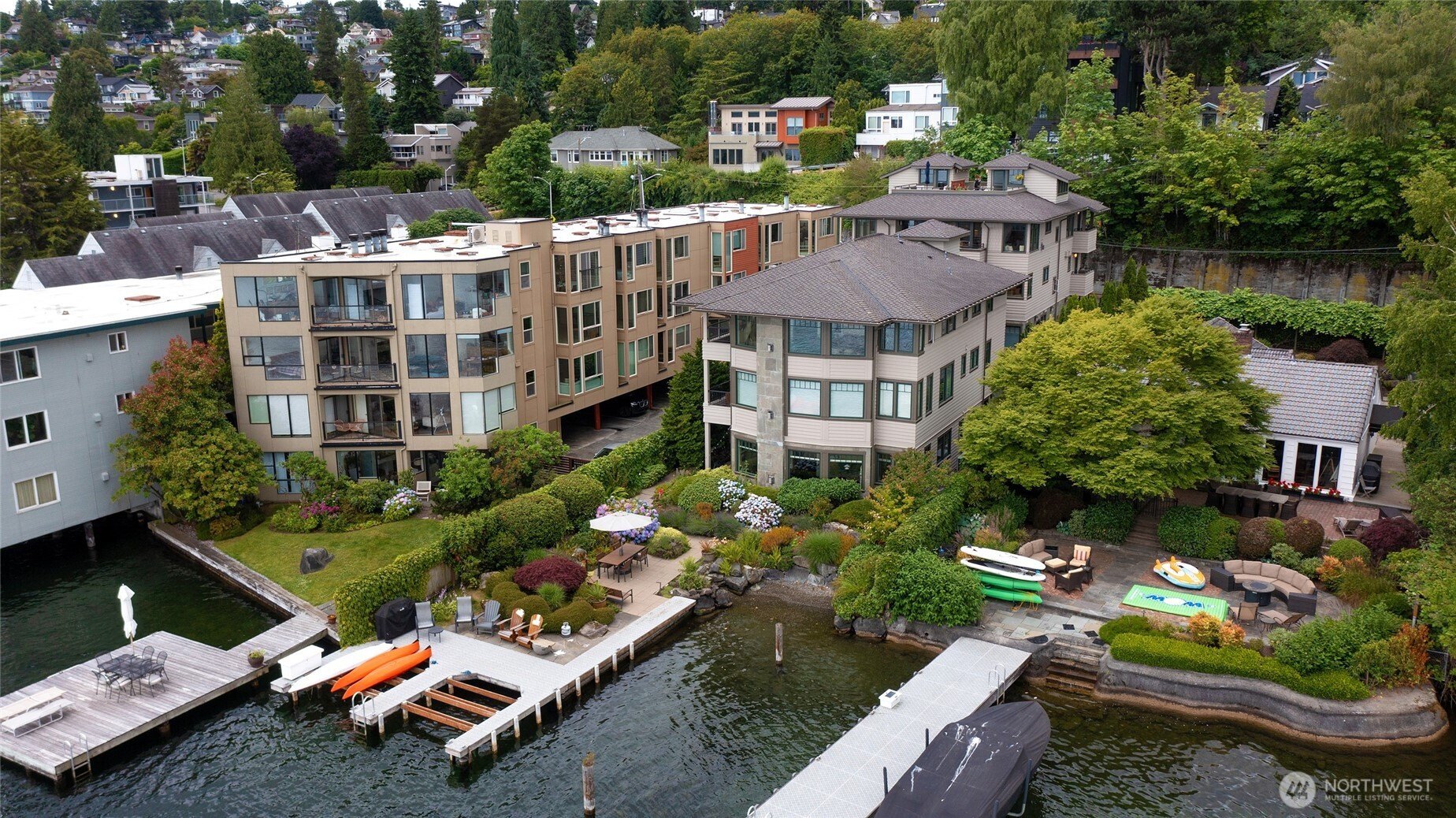 Ready for summer fun! Dine lakeside, relax on your rooftop deck, and store your SUP with ease – all you desire for your waterfront lifestyle. All main rooms have city and lake vistas, and the rare rooftop deck offers 180° views from Mt. Baker to Mt. Rainier, with the lake, gorgeous Bellevue Skyline, and the Cascade Mountains in between! Inside, warm mahogany and cherry accents enhance the quality ambiance. The well-designed floor plan makes this townhome live large, like a stand-alone home. Without fussy elevators and common hallways, this exceptional townhome is a rarity, combining everything you love – location, luxury, and an easy lock-n-leave lifestyle. Super private with outlooks to nature and views. Don't miss the Vinotemp dual-zone 300-bottle wine cooler/refrigerator in the attached garage with uncommonly easy parking and storage. Additional shared garage offers parking for 2nd car + gear. Ample off-street parking. Just 3 blocks to vibrant Leschi's charming market, fantastic restaurants, Starbucks, parks. Minutes to Madrona, Madison Pk. Comparatively low HODs. They cover many items including common area maintenance, landscaping, earthquake insurance, quarterly ext window washing, gutter cleaning, bug spraying, exterior light bulb replacement and some utilities.