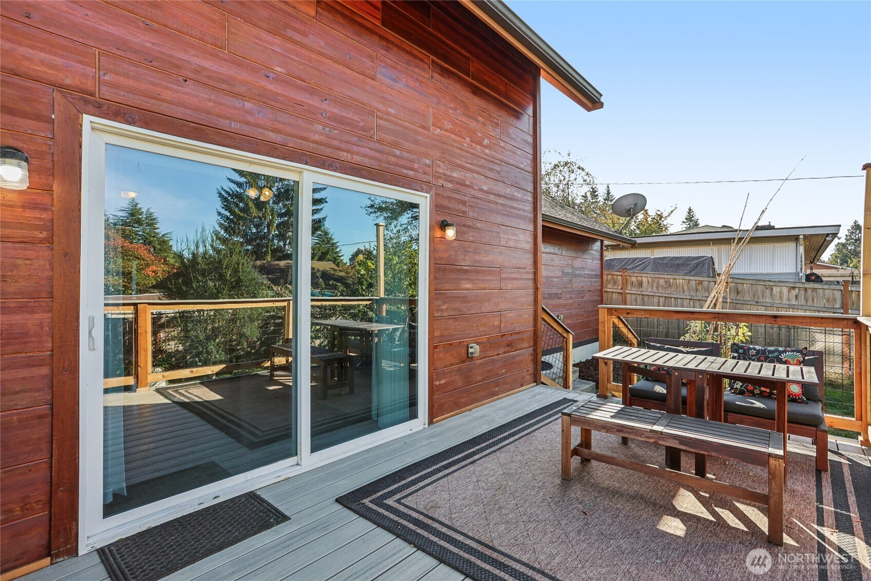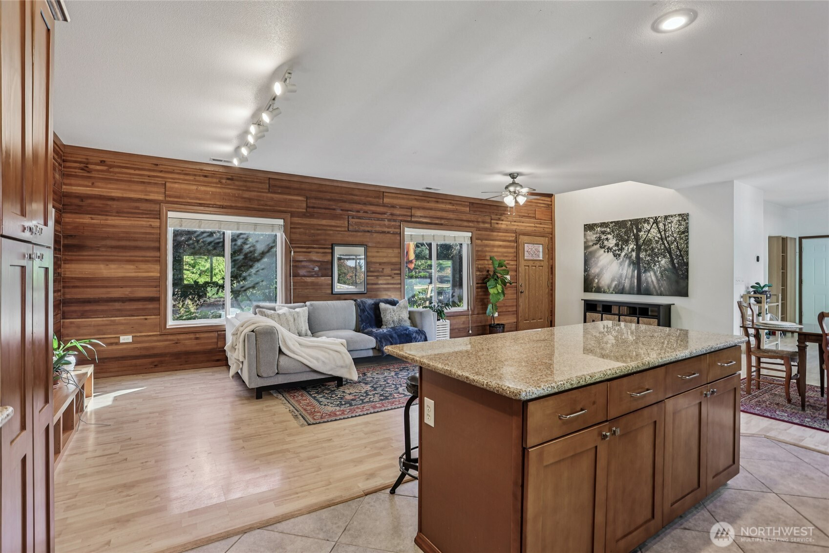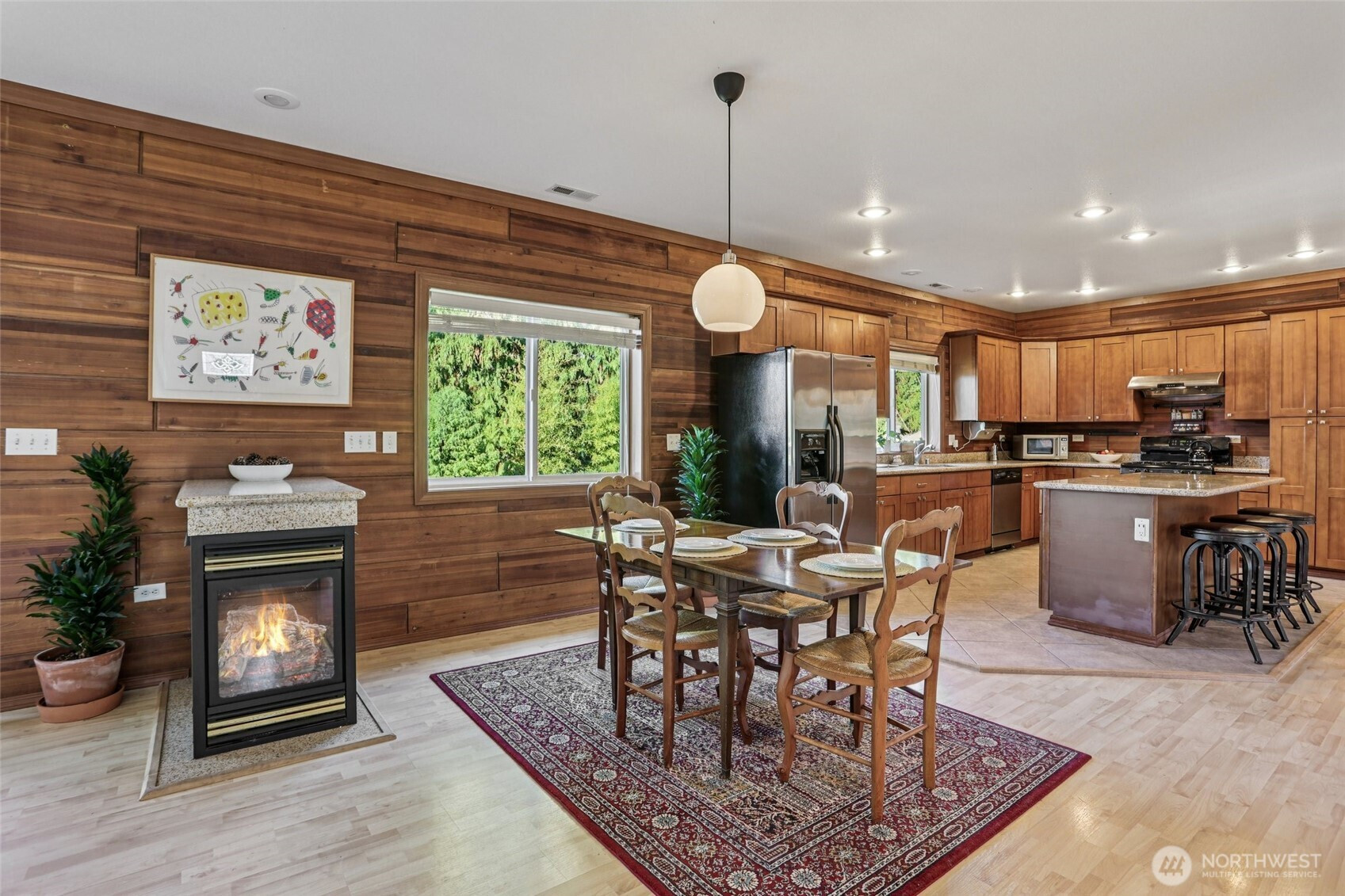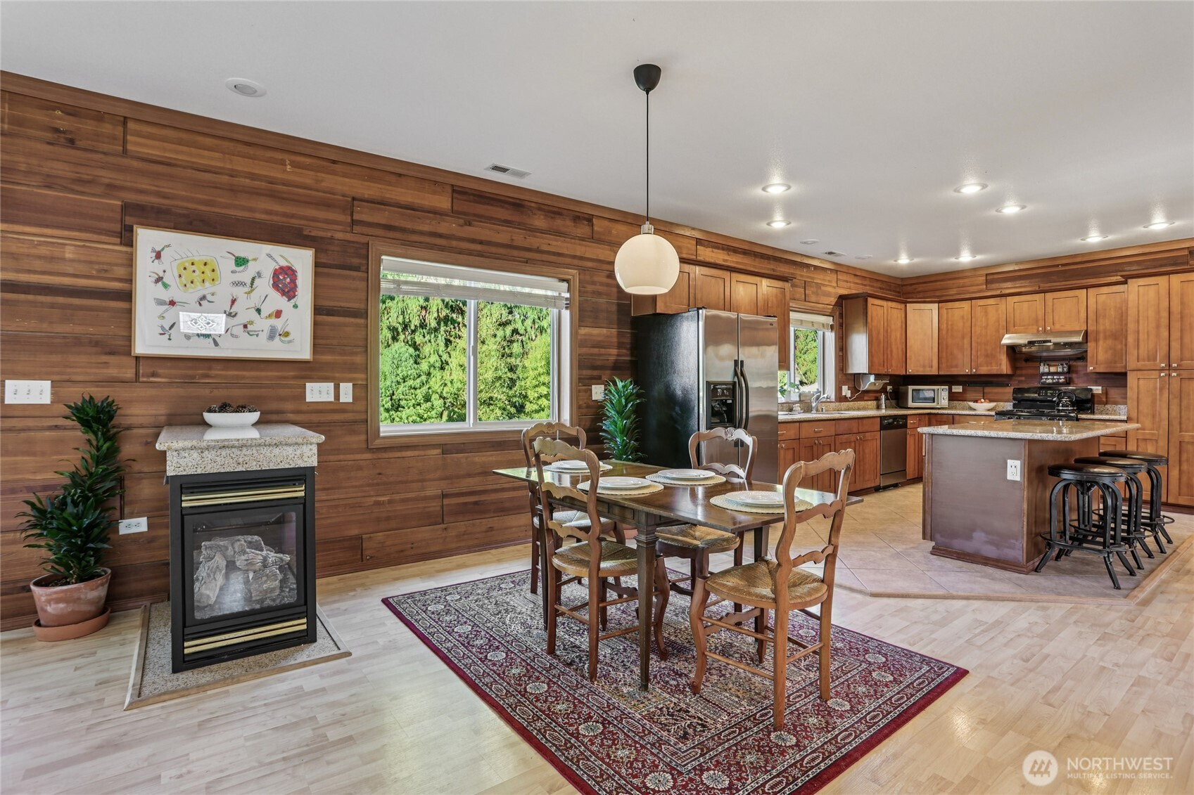 Welcome to this unique Scenic Hill 4 bedroom, 3 bathroom house where cabin charm meets modern day living. Warm and inviting details with exposed cedar walls, gas fireplace, wood trim, and engineered hardwood in the expansive living area. Kitchen is equipped with a large island, custom cabinetry & slab granite countertops. Sliding doors in the living area lead to a spacious deck & fully fenced back yard. Guest bedroom & full bathroom on main level. The second floor has a primary bedroom with a walk in closet & en suite bathroom, plus two additional bedrooms & another bathroom. Spacious 2 car garage with additional room for storage. Close to Kent Station shops, restaurants, trails, parks, & playground. Easy access to highways for commuters.