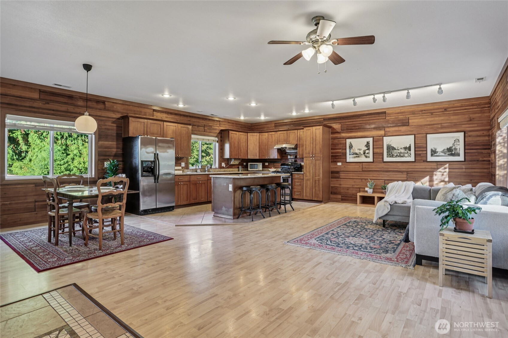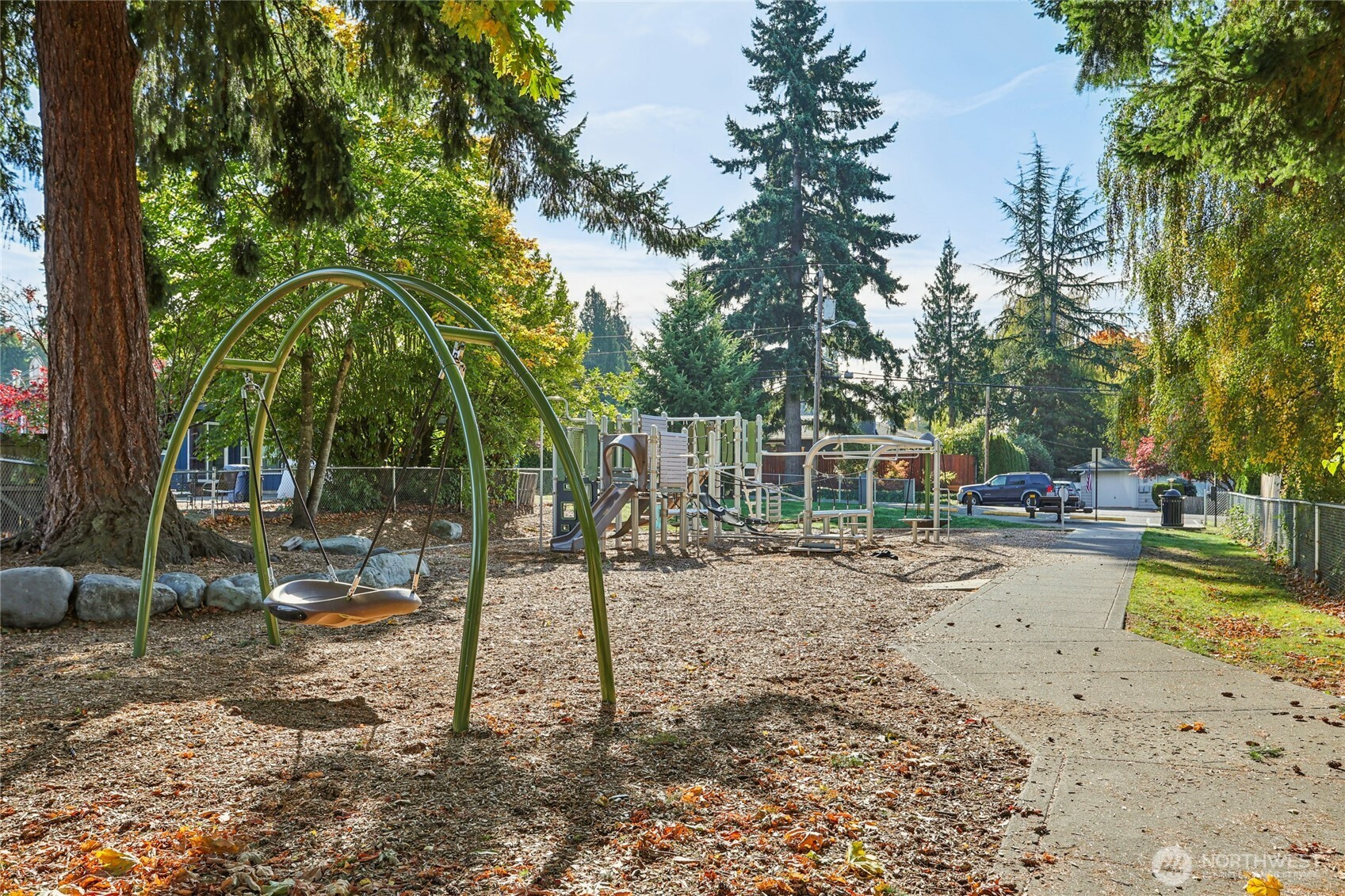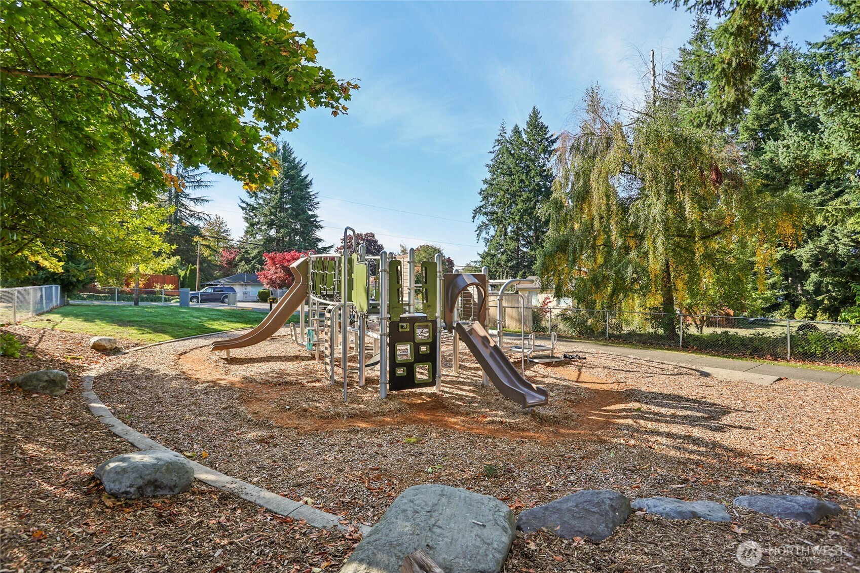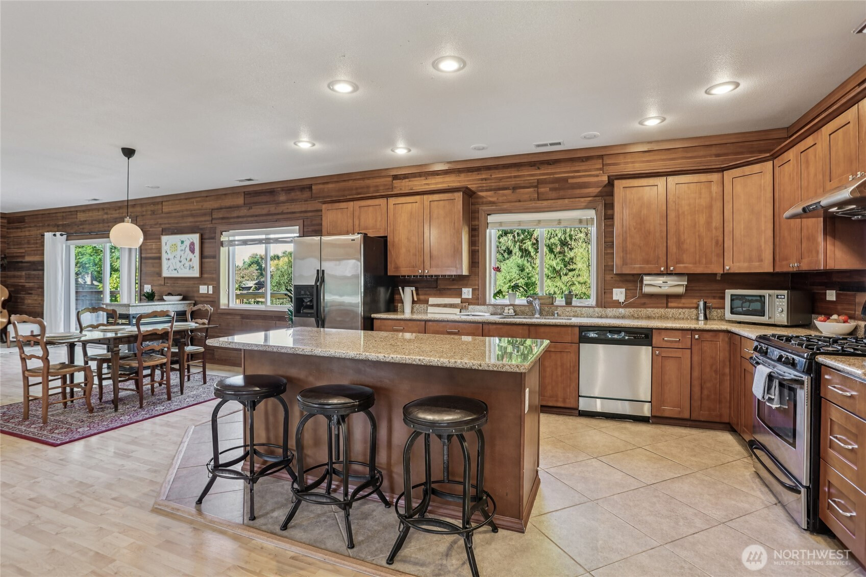 Welcome to this unique Scenic Hill 4 bedroom, 3 bathroom house where cabin charm meets modern day living. Warm and inviting details with exposed cedar walls, gas fireplace, wood trim, and engineered hardwood in the expansive living area. Kitchen is equipped with a large island, custom cabinetry & slab granite countertops. Sliding doors in the living area lead to a spacious deck & fully fenced back yard. Guest bedroom & full bathroom on main level. The second floor has a primary bedroom with a walk in closet & en suite bathroom, plus two additional bedrooms & another bathroom. Spacious 2 car garage with additional room for storage. Close to Kent Station shops, restaurants, trails, parks, & playground. Easy access to highways for commuters.