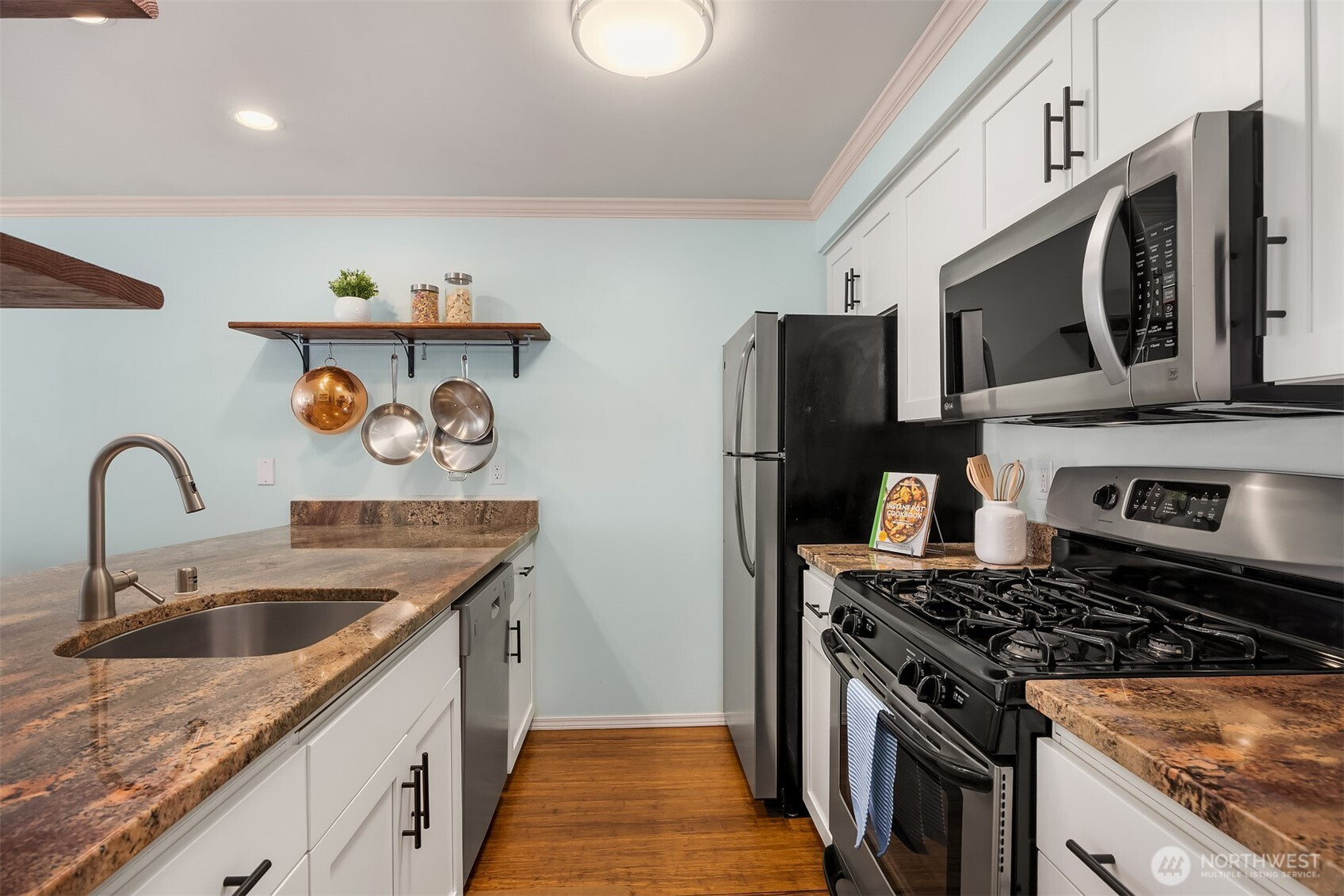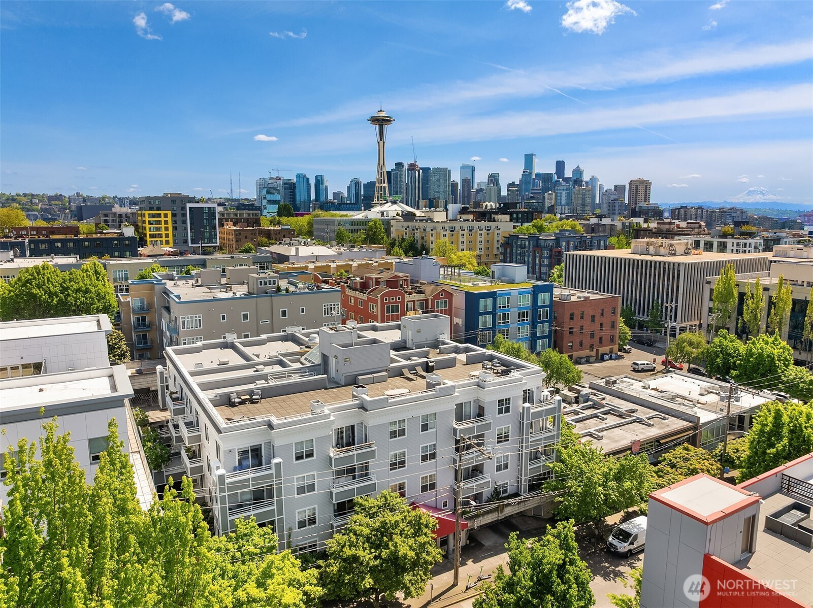Super charming, updated top floor unit in lower Queen Anne. The city is at your fingertips…take in Storm or Kraken games, Bumbershoot, KEXP at Seattle Center or take a quick walk to downtown, the waterfront, and light rail. You’ll never run out of amazing shops and restaurants to try in this cultural hotspot. Practicalities and amenities abound including an assigned parking space in secure garage, storage space, and shared roof deck with sweeping views of the Space Needle, downtown, and Puget Sound. Spacious in unit laundry room with washer and dryer plus storage. Sweet private balcony to watch the sunrise, and a gas fireplace for cozy evenings in. Treat yourself at Nielsen’s Pastries, a Queen Anne institution, right downstairs.