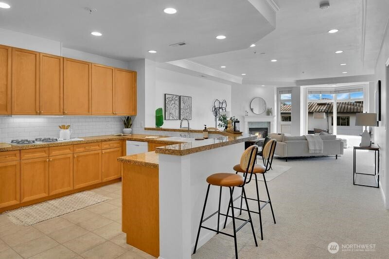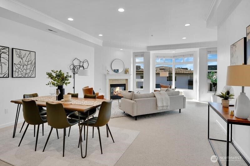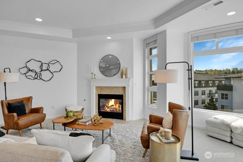 (503) 893-8874Downtown Kirkland living at its finest with this spacious and light filled 2 bedroom and 2 bath condo! Refreshed with brand new carpets and paint, this 4th floor unit boasts open floor plan, tall ceilings, den/office room, kitchen with newer appliances, eating bar and ample dining space. Other features include a primary suite with 5 piece bath with jetted tub, large walk-in closet and deck access, and gas fireplace in living room. Southern exposure private deck offers lake and mountain views. Secure building, 2 parking spots plus storage. Steps to Kirkland Urban shopping center, Peter Kirk Park and Google. An unbeatable location, a few blocks west will find you at the Kirkland Waterfront and everything else downtown Kirkland has to offer!
