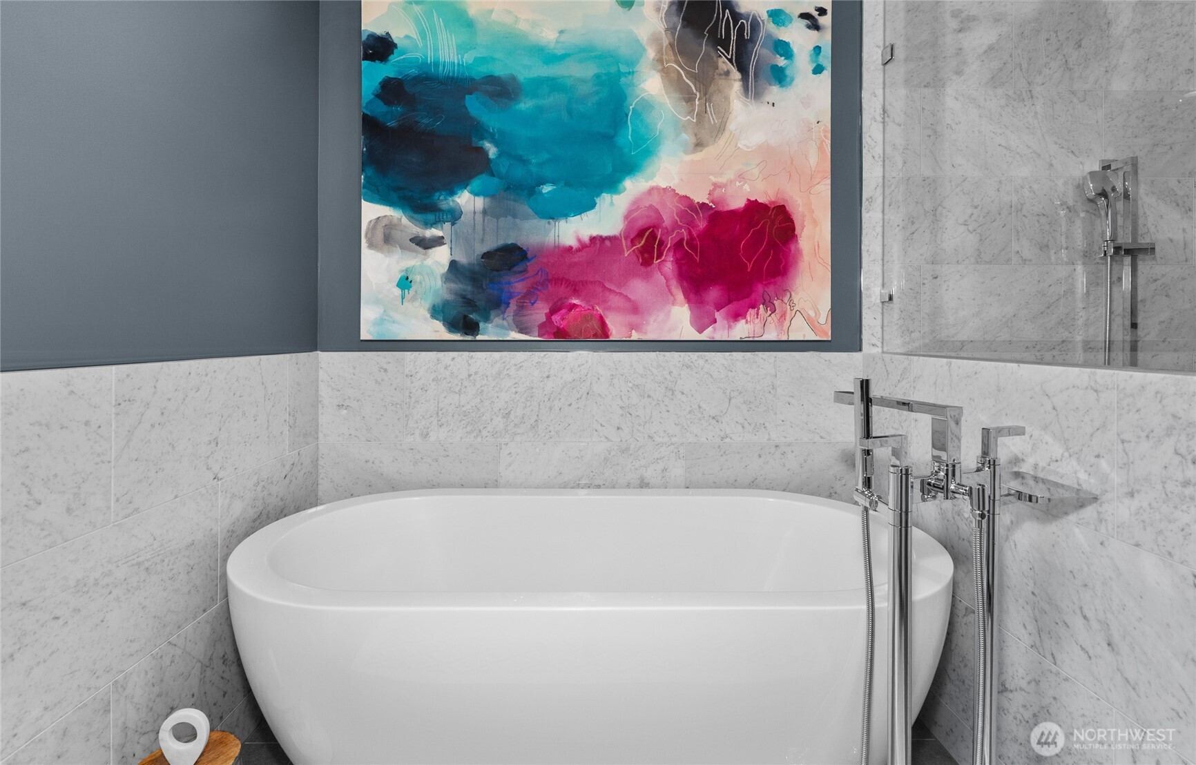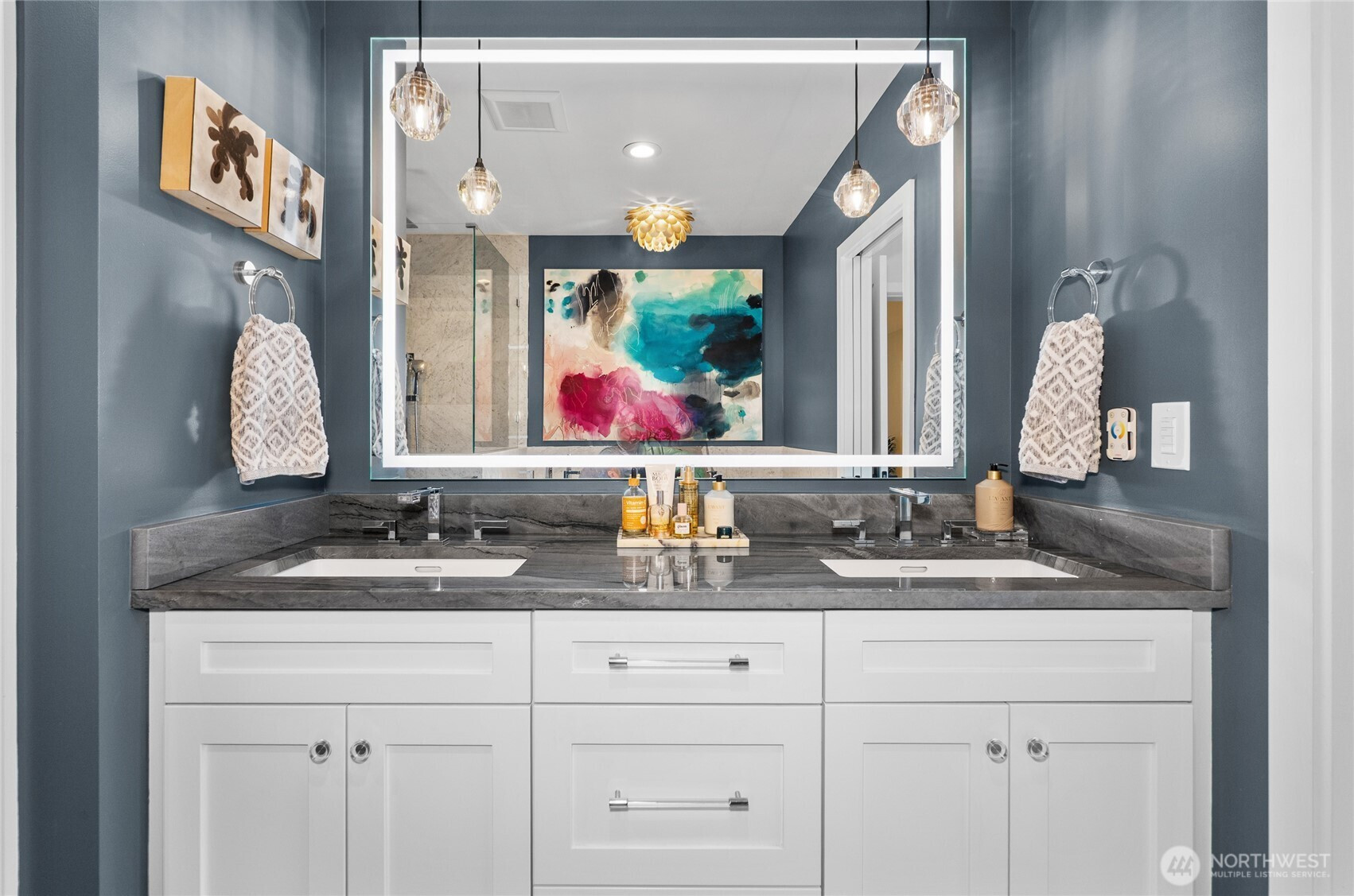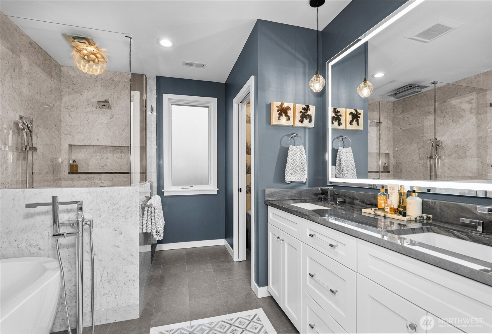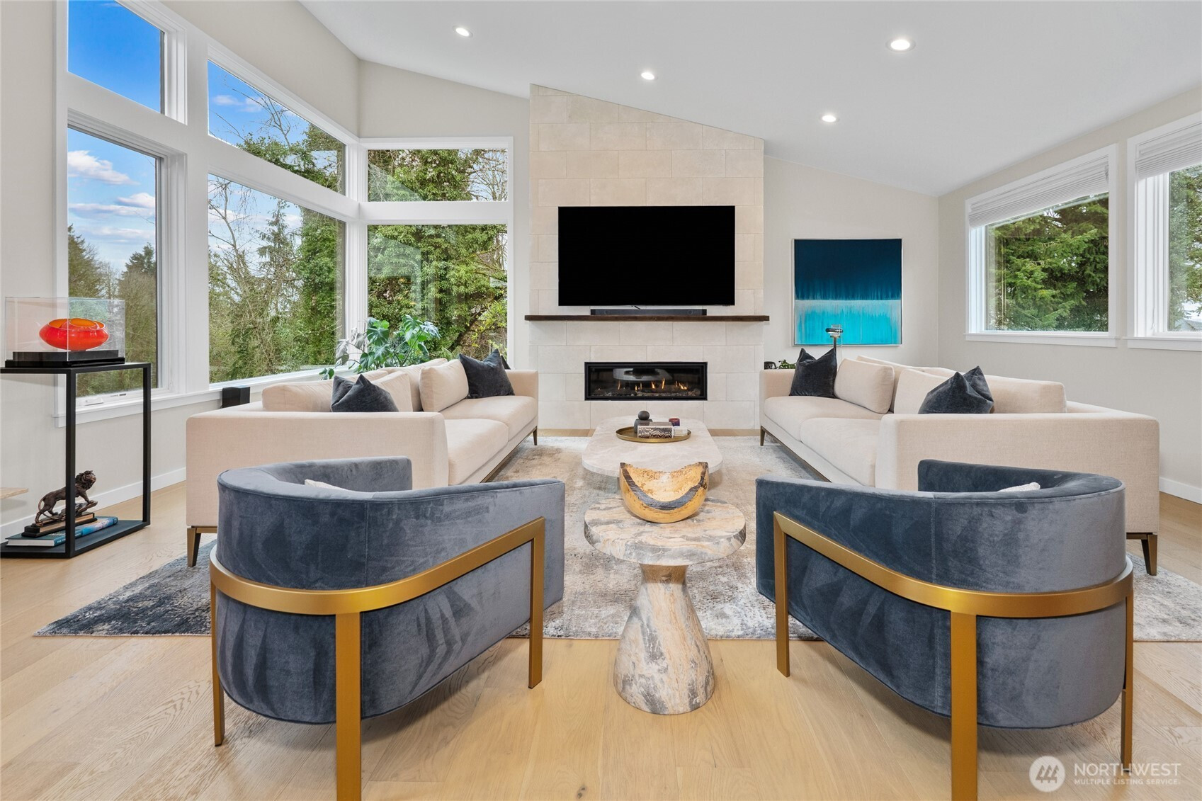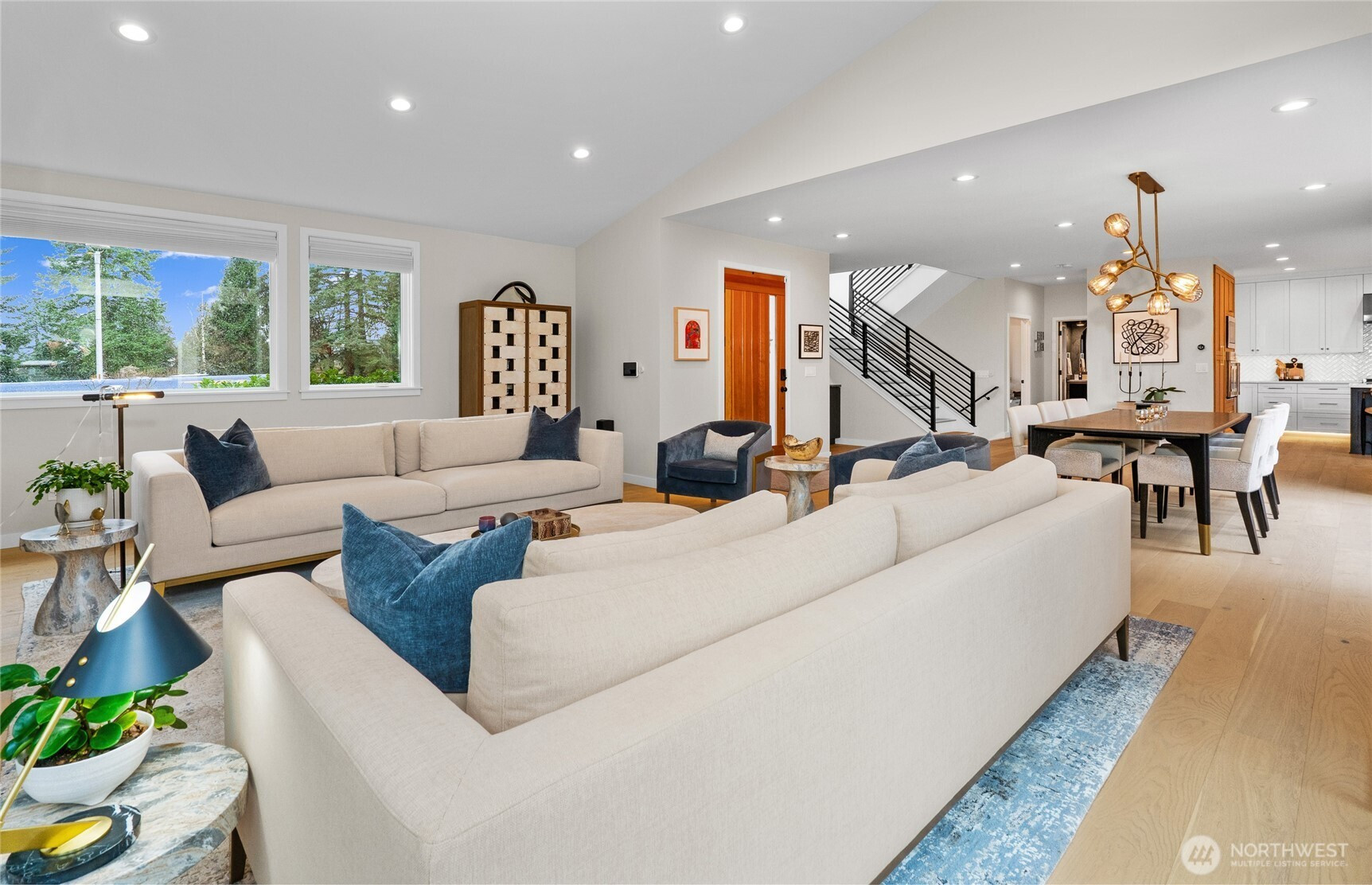 Private, sophisticated & modern, this 2021-built home is a masterclass in elevated living—with over $400K in enhancements that truly set it apart. Designed for maximum sunlight, the bright, open main floor centers on a grand great room w/ luxury gas fireplace & elegant dining room, flowing seamlessly thru two sets of folding NanaWall doors to resort-caliber outdoor space w/ an expansive deck & covered living room w/ TV & infrared heat, patio w/ gas fireplace & a pass-through accordion bar—all overlooking a serene backdrop. The gourmet kitchen anchors it all, featuring a 6-burner gas range, double ovens, generous island seating, built-in bar w/ wine storage, & hidden outlets & convenient main floor bedroom/office & powder room. Upstairs, the primary suite is a pure retreat—spa bath w/ heated marble floors, soaking tub, glass rain shower w/ heated bench & WC w/ bidet, plus a custom walk-in closet. Three additional spacious bedrooms, a luxury bath w/ heated floors, & a laundry room complete the upper level. The lower level offers a media room w/ sound-absorbing feature wall & a mudroom off the 2-car garage fitted w/ epoxy floors, hot water, built-ins & LED lighting. Outdoors, 300+ native plants, landscape lighting, irrigation, dog run & fencing create a true sanctuary. Solar, Central AC, tankless H2O heater, Lutron lighting & Cat-5 wiring complete this exceptional home. All in coveted View Ridge, fronting the SPCC fairway, near top-rated schools, parks, eats. Simply special.