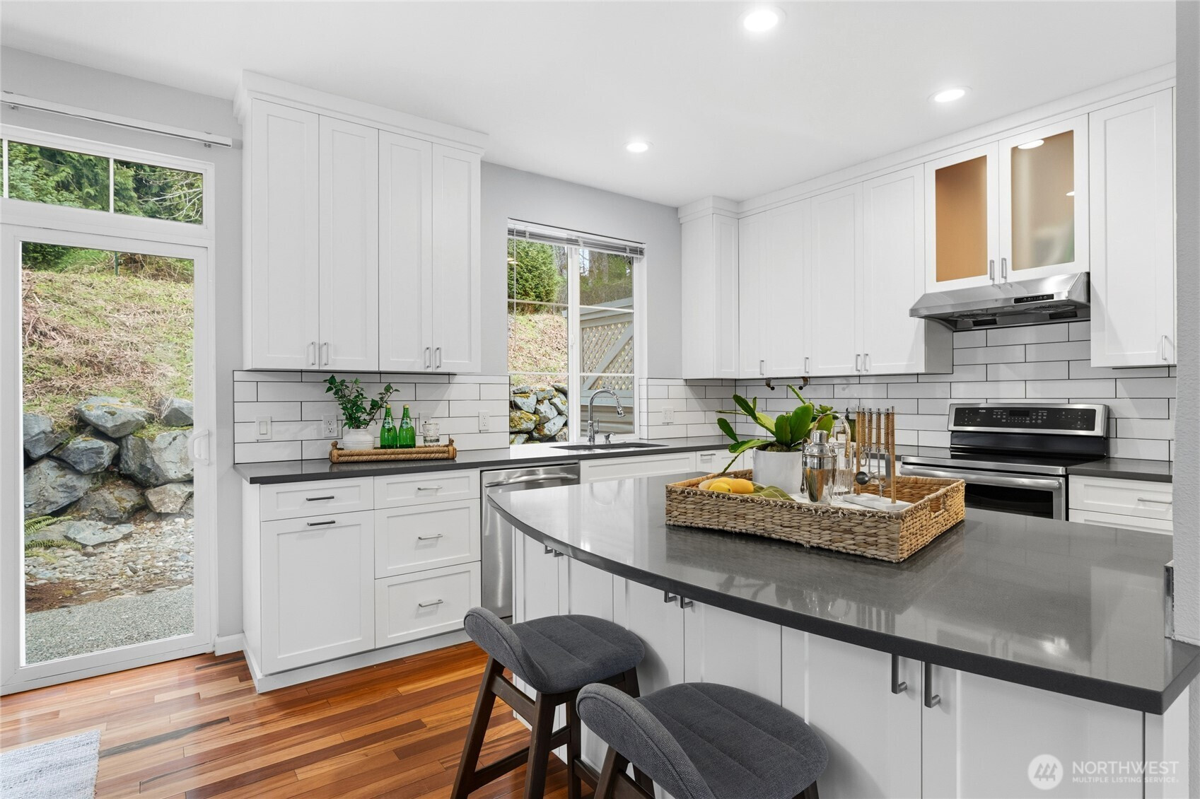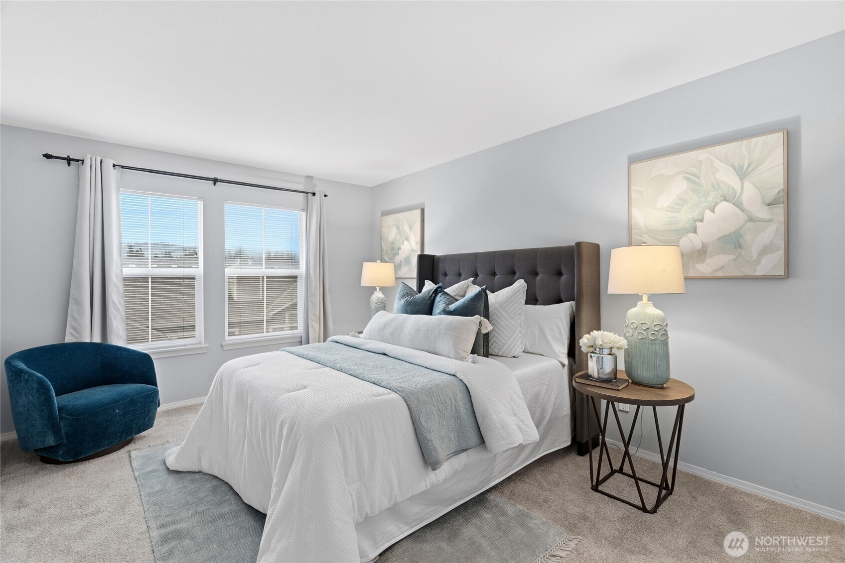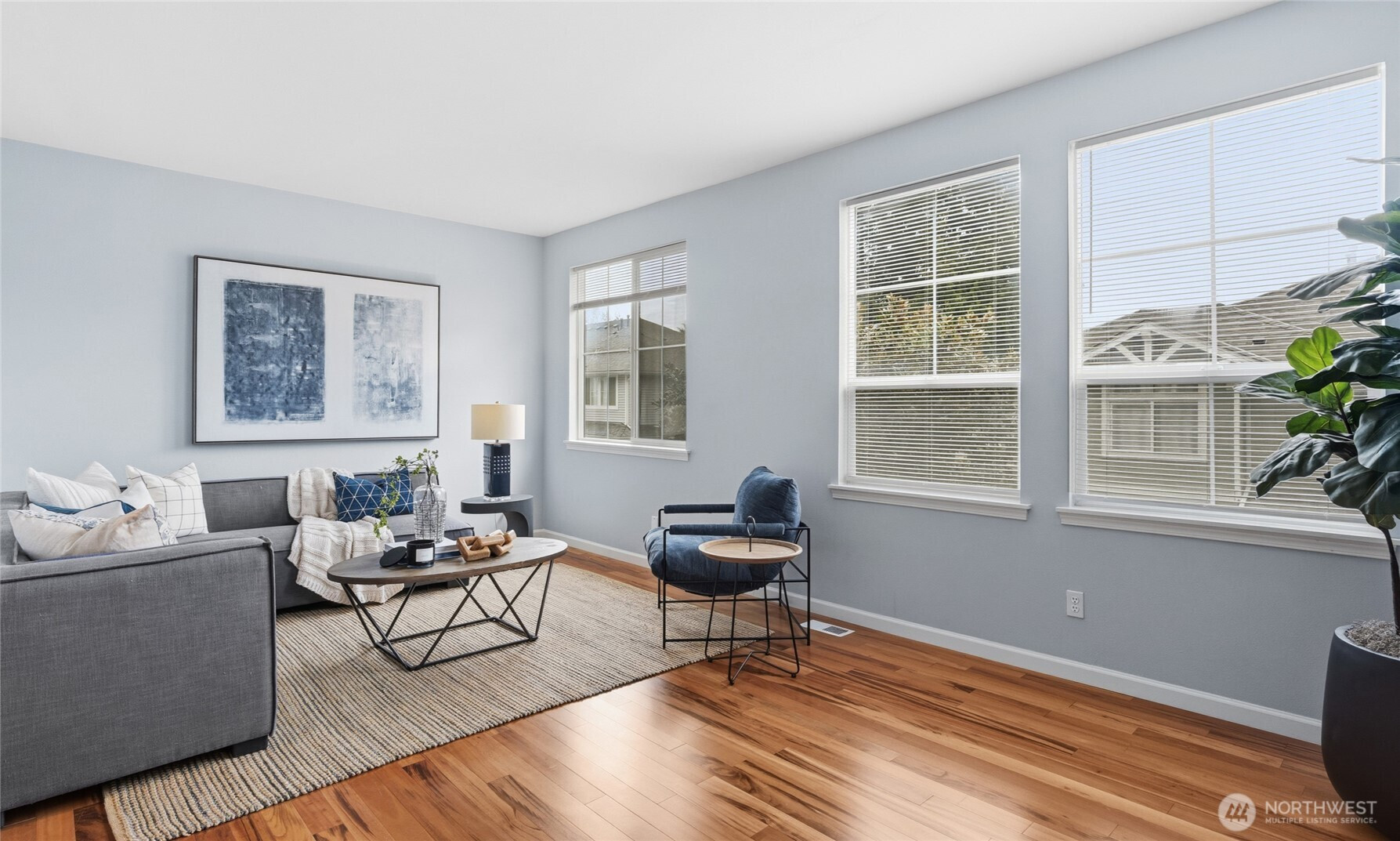 Featuring 1,864 sq. ft. of spacious living space and a 2-car attached garage, this updated 4-bedroom, 2.5-bath home overlooks a private, serene greenbelt and truly lives like a single-family residence. Located in the sought-after Summerhill community, this south-facing end-unit boasts three sides of windows, maximizing natural light and airflow throughout the high-ceilinged, freshly painted interior. The living room highlights upgraded Tigerwood hardwood flooring, a cozy gas fireplace, and gorgeous views of Tiger Mountain. At the heart of the home, the open-concept, updated kitchen shines with quartz countertops, stainless steel appliances, and custom soft-close cabinetry. Retreat to the primary suite, which includes a generous walk-in closet and a double-sink vanity. Outside, the private patio is the perfect tranquil oasis for sipping your morning coffee or hosting summer BBQs.