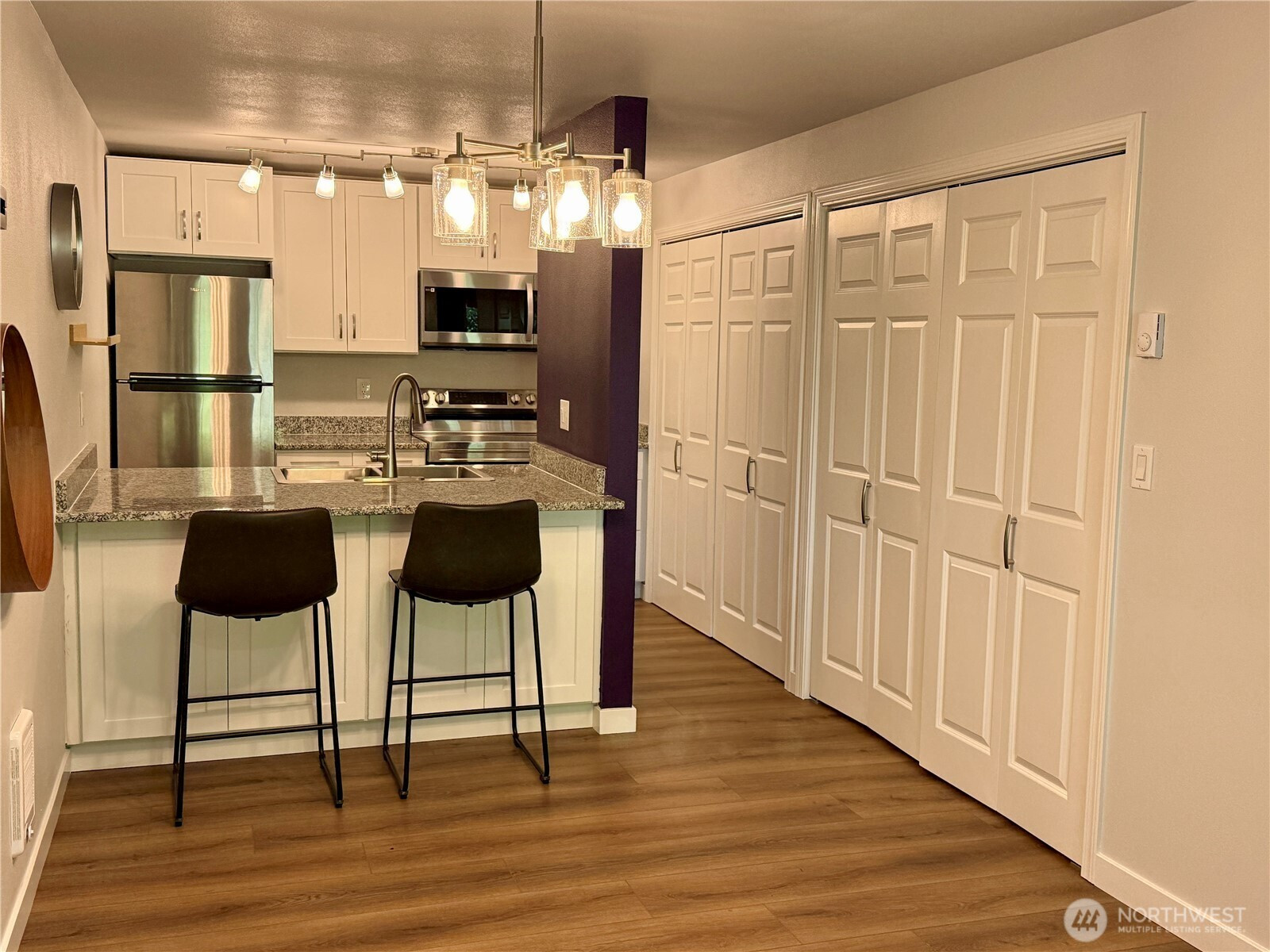 Nestled in desirable Campus Green II, this stunning, remodeled one-story 2-bedroom, 1-bath condo features beautifully upgrades including quartz countertops, stainless steel appliances, new cabinets, laminate flooring and updated millwork. Enjoy the warmth of the cozy wood-burning fireplace. The community offers a cabana/clubhouse, outdoor pool, athletic courts, and a fenced dog area. In addition to these amenities, the HOA dues cover water, sewer, garbage and recycling, along with landscaping. This well-maintained community is just minutes from Sound Transit's new Light Rail station for easy commuting and is very close to shopping and restaurants.