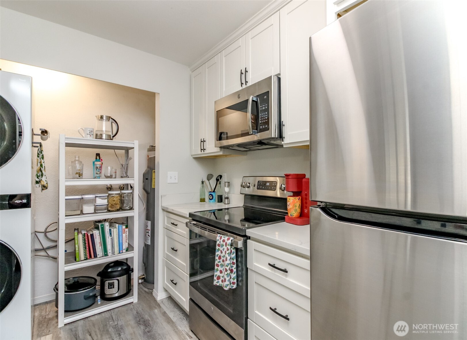 Welcome to this beautifully updated one-level townhome in sought-after Campus Green II. Thoughtfully remodeled and extensively improved from 2021–2026, this 2-bedroom, 1-bath home blends style, comfort, and peace of mind. The kitchen features quartz countertops, new cabinetry with soft-close drawers, and GE appliances including stove, oven, microwave, and dishwasher. Durable LVP flooring runs throughout, complemented by refreshed millwork, updated lighting, and new easy-lift blinds. The inviting living area is anchored by a cozy wood-burning fireplace with marble surround and shiplap detail. The bathroom offers a walk-in shower with deluxe tower, new vanity and mirror, new toilet, and updated fan. Major system upgrades include an electrical panel brought to code, new water heater with updated shut-off valves, and added electrical in the front bedroom closet. Additional highlights include custom pantry and walk-in closet, LG full-size washer and dryer on 220V, new windows, garbage disposal, and new front and storm doors with updated outdoor lighting. Enjoy community amenities including a clubhouse, outdoor pool, athletic courts, and fenced dog area. Ideally located near transit, light rail, shopping, and dining; truly move-in ready.