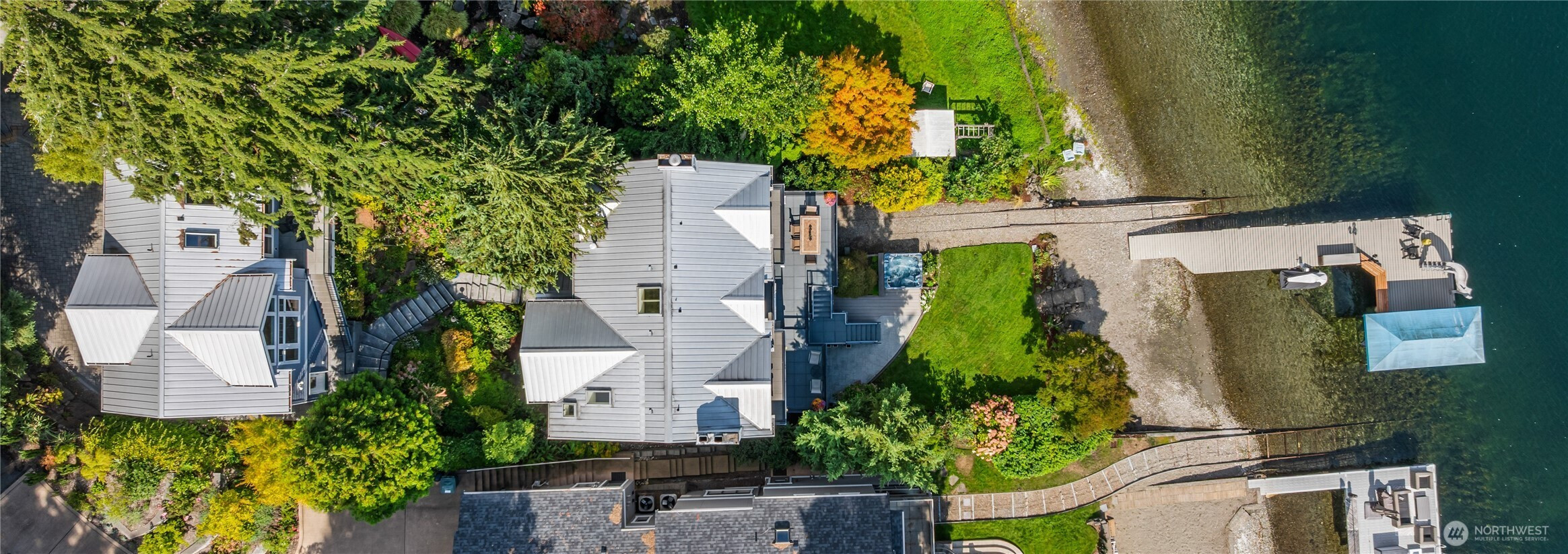 Nestled on 50’ of lakefront, this Baylis Architects home, remodeled in 2004, turns everyday living into lakeside adventure. Launch from the dock or soak in the hot tub as golden sunlight dances across the water. Blooming hydrangeas and fruit trees frame a vibrant lawn alive with natural beauty. With granite counters and a farmhouse sink, the open kitchen flows toward the deck for sunset cocktails overlooking shimmering water. Upstairs, the primary suite with fireplace and jetted tub offers serene retreat. A bonus room with wet bar and wine cellar invites entertaining. Steps away, a 3-car garage hosts a charming ADU with loft, while a rare boathouse with functional tram houses your boat, completing this extraordinary waterfront lifestyle.