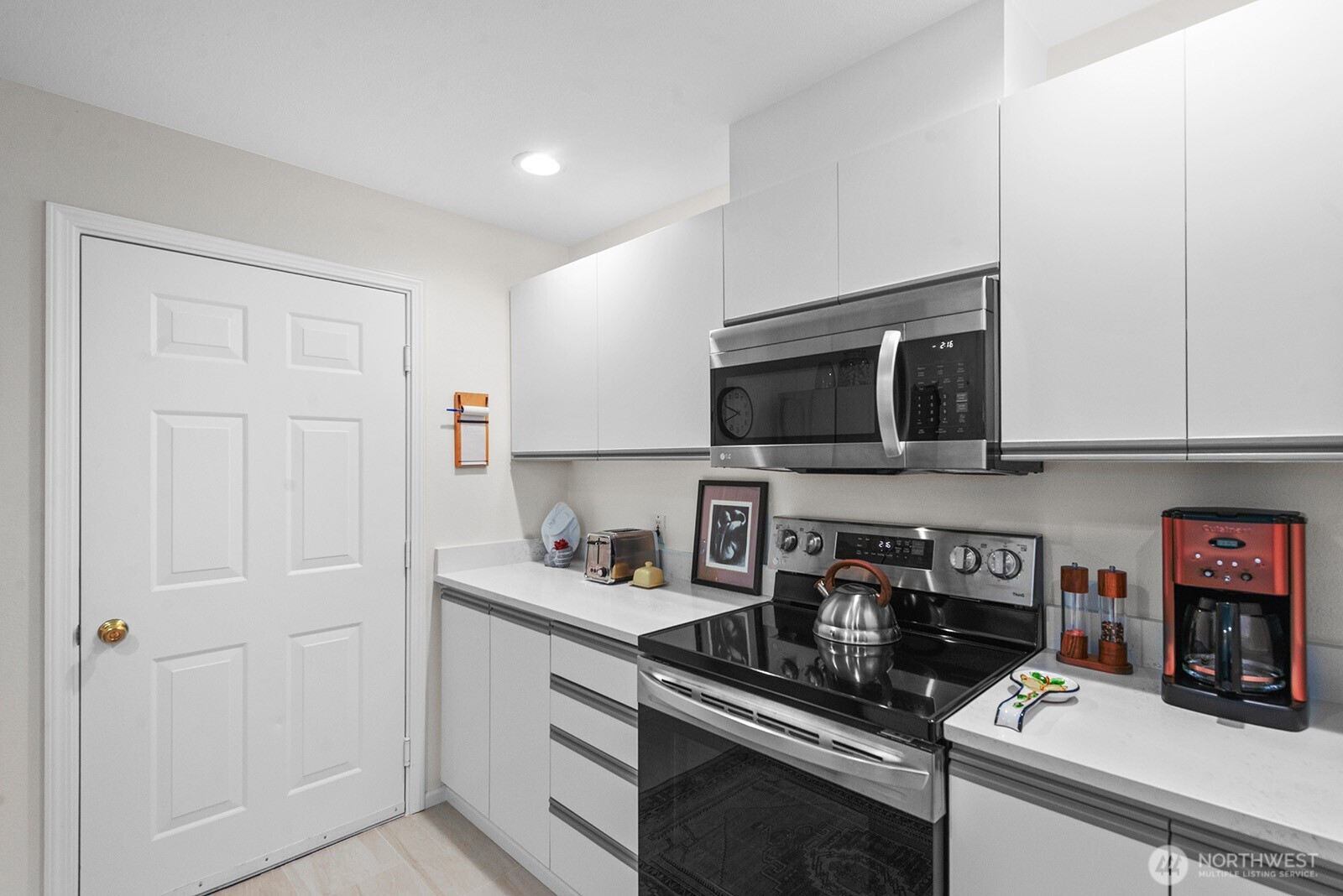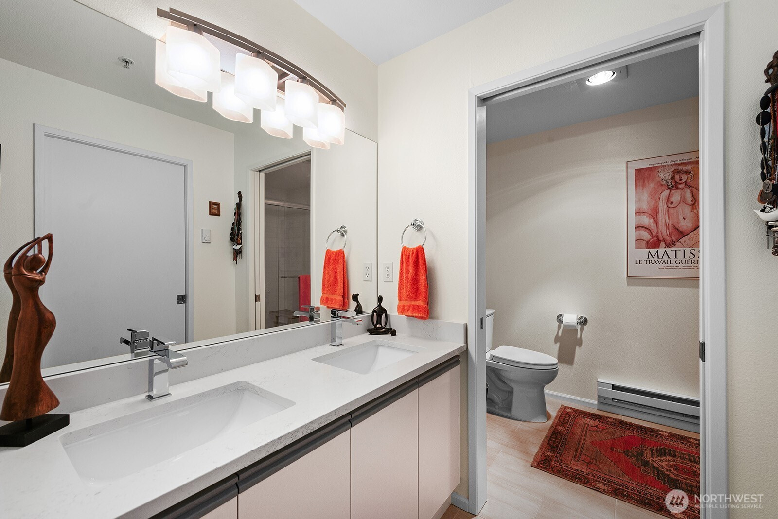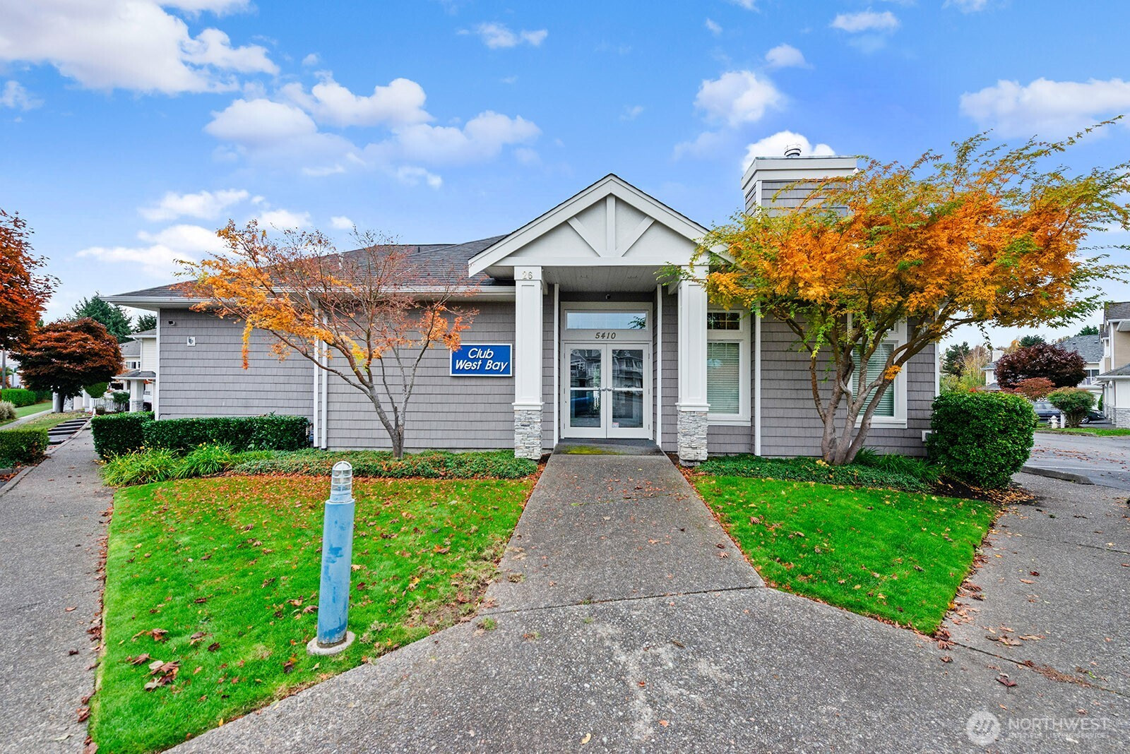 Stunning garden level end unit with covered patio, high ceilings, hardwoods, open dining & living room with wood burning fireplace. Professional remodel in 2024 includes kitchen and baths with quartz counters, ceramic tile floors, all new appliances including full size washer & dryer, carpet in both bedrooms. Spacious primary with walk-in closet, new tiled walk-in shower, floors. New wood slat blinds, new heaters, freshly painted throughout Garage parking plus extra parking in driveway. Guest parking, clubhouse w/gym, sauna & party room, walking & biking trails, beautiful water features & wildlife viewing. Wonderful community & location. Easy access to I5 N. & S. VETERANS can assume 5.75% 30 yr. fixed VA mortgage easily! A rare opportunity!