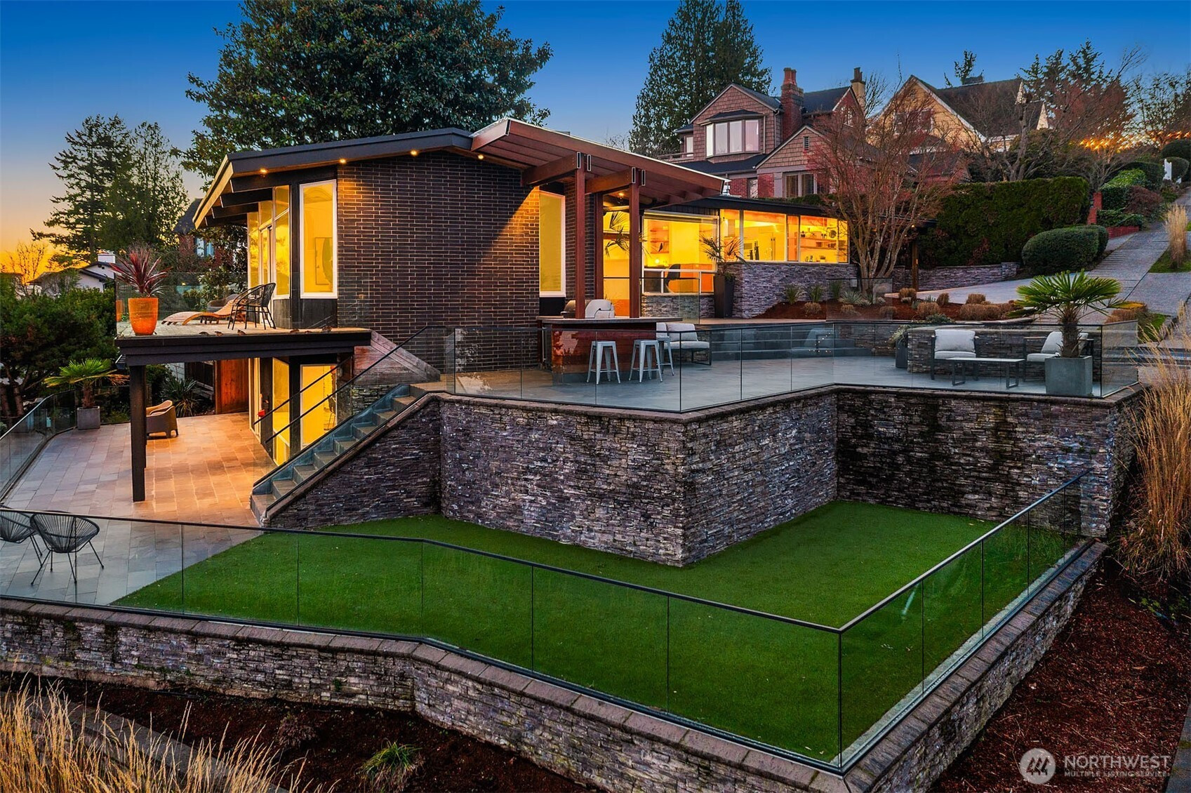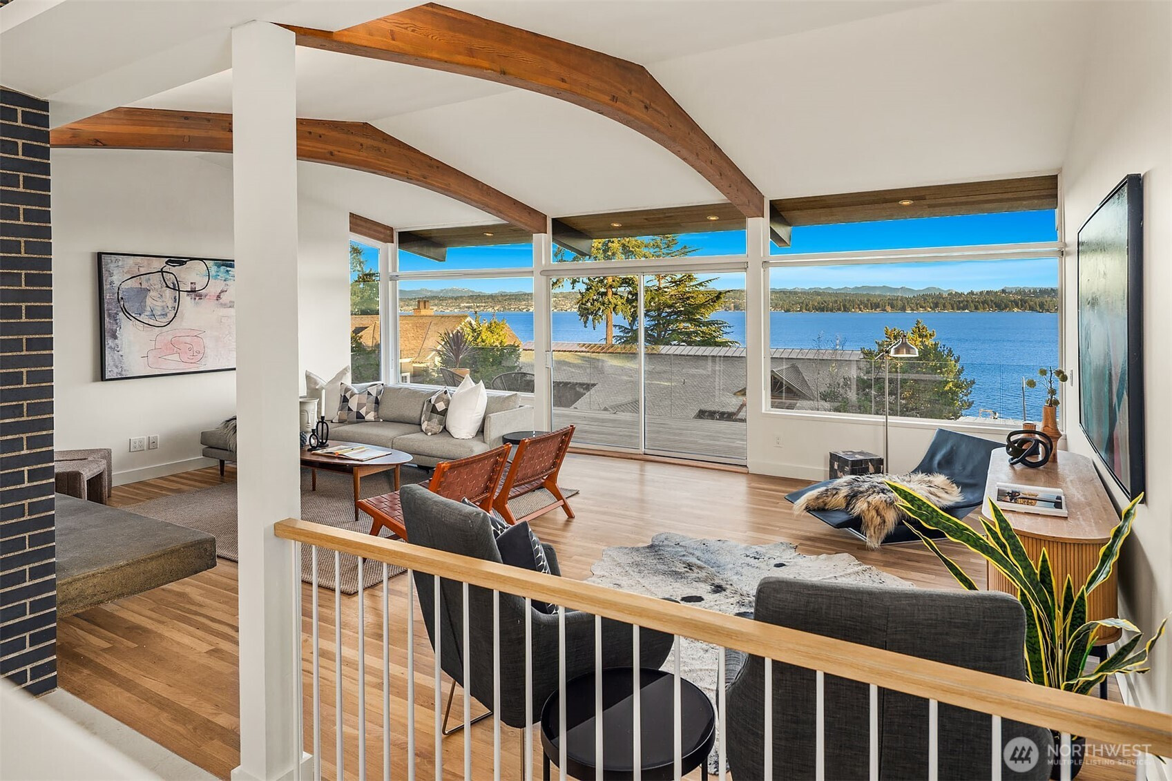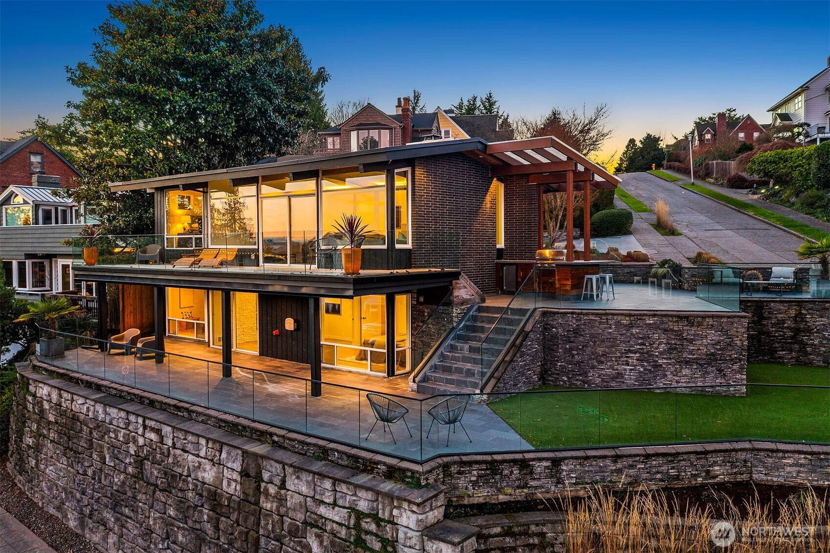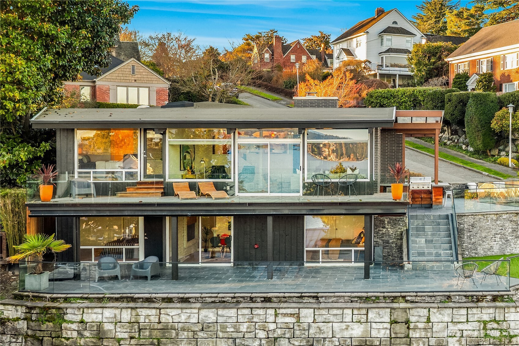 Enviably sited at the culmination of a premier view street, this impeccable mid-century modern showcases panoramic views of Lake Washington and Mt. Rainier. This 4 bed, 2 3/4 bath home, just blocks from Laurelhurst Beach Club puts modern artistry on display at every turn. The spacious and sun-drenched main level, anchored by a beautifully renovated chef’s kitchen is ideal for entertaining, everyday living and experiencing the theater of the seasons from the expansive view terraces. The main level primary bedroom with wood-burning fire and peaceful lake views is akin to a high-end spa retreat. The versatile lower level offers gracious spaces for recreation, a home office, crafts, and ample storage. Spectacular outdoor living-featuring two generous decks, patios, outdoor kitchen, and a two car carport. Welcome home to one of Laurelhurst’s jewels.