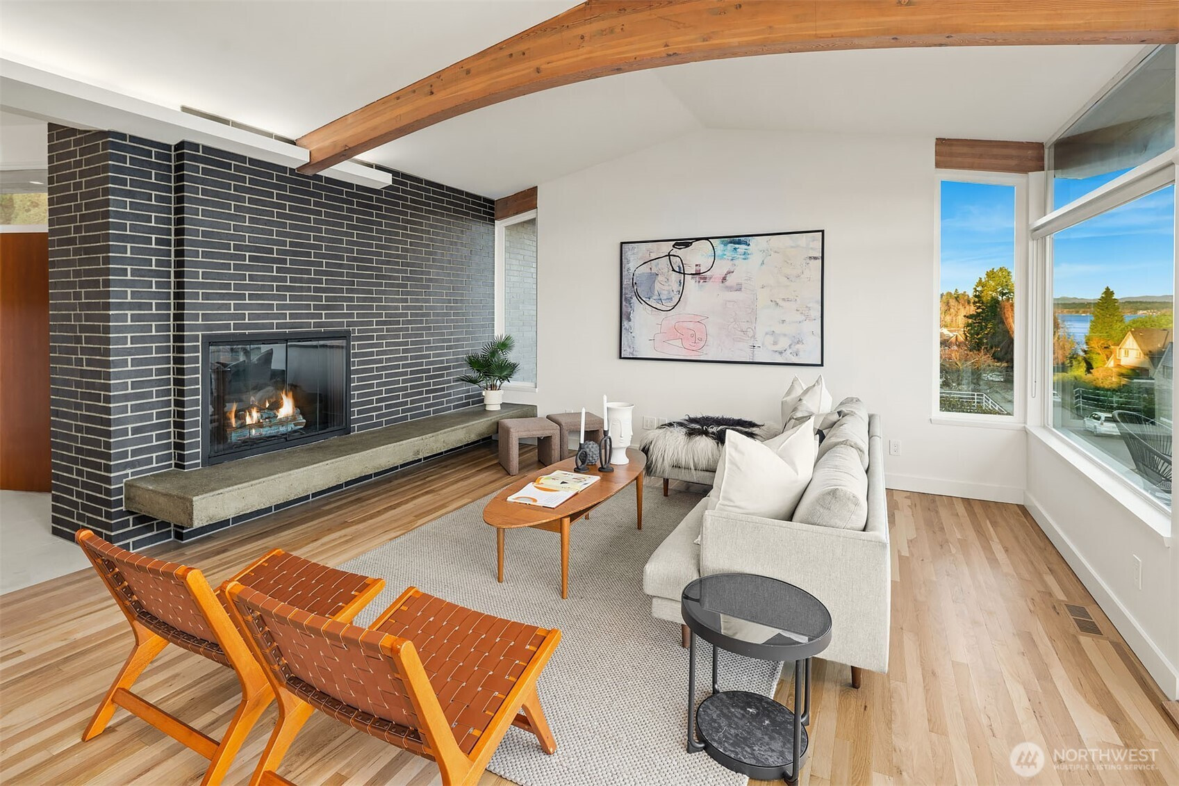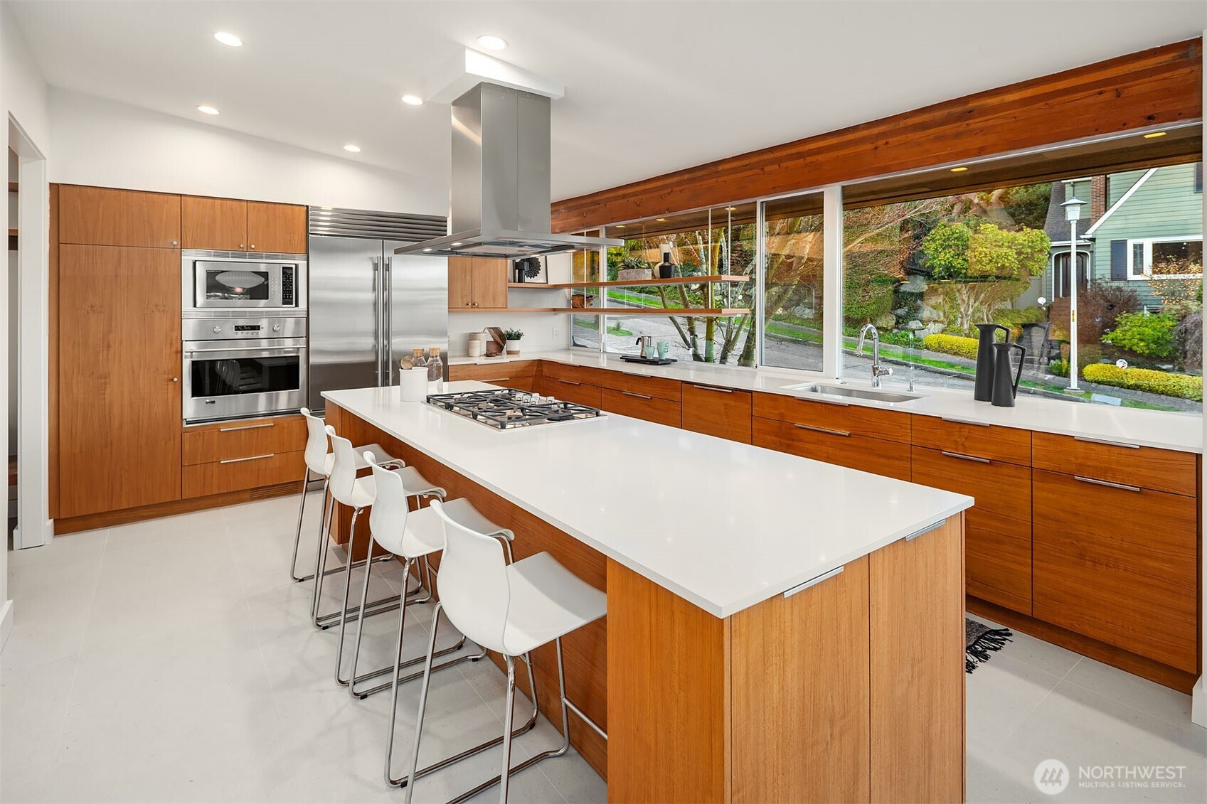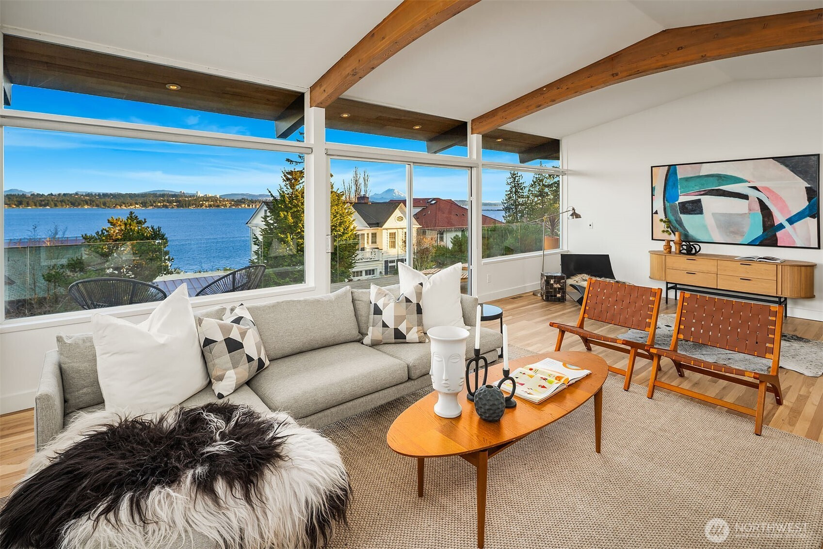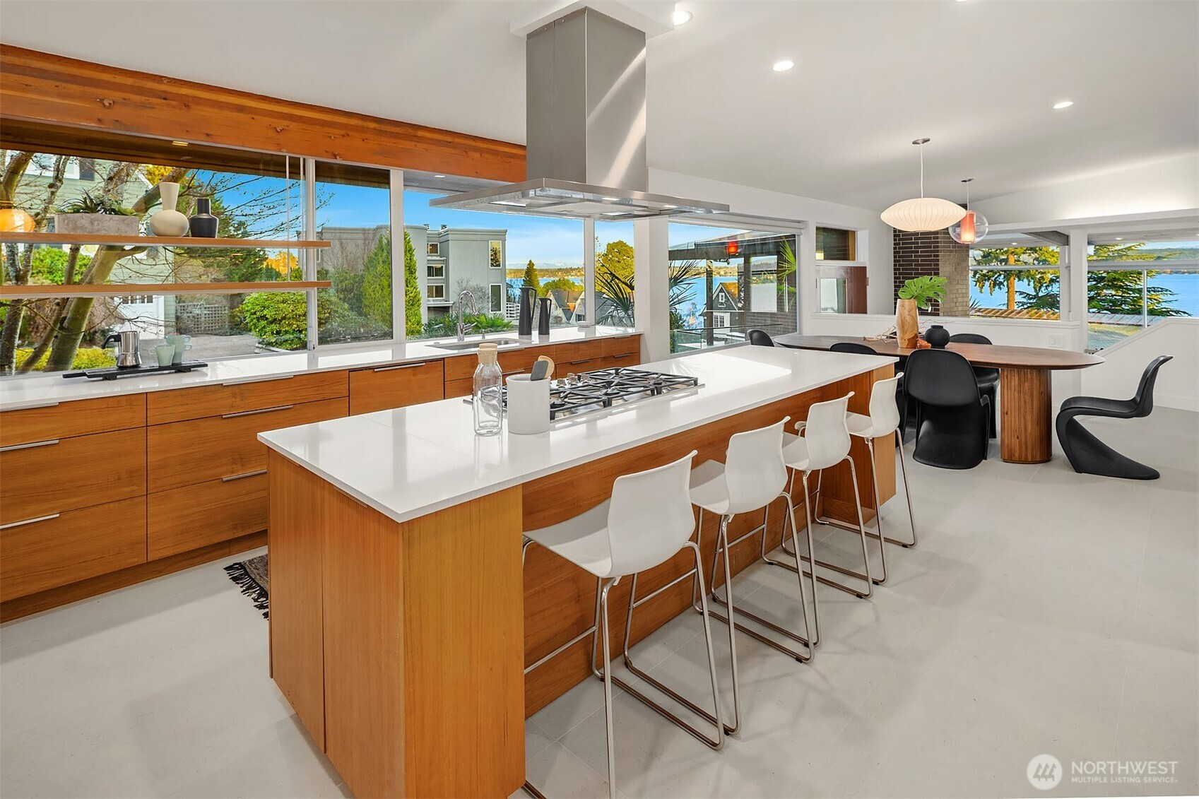 Enviably sited at the culmination of a premier view street, this impeccable mid-century modern showcases panoramic views of Lake Washington and Mt. Rainier. This 4 bed, 2 3/4 bath home, just blocks from Laurelhurst Beach Club puts modern artistry on display at every turn. The spacious and sun-drenched main level, anchored by a beautifully renovated chef’s kitchen is ideal for entertaining, everyday living and experiencing the theater of the seasons from the expansive view terraces. The main level primary bedroom with wood-burning fire and peaceful lake views is akin to a high-end spa retreat. The versatile lower level offers gracious spaces for recreation, a home office, crafts, and ample storage. Spectacular outdoor living-featuring two generous decks, patios, outdoor kitchen, and a two car carport. Welcome home to one of Laurelhurst’s jewels.