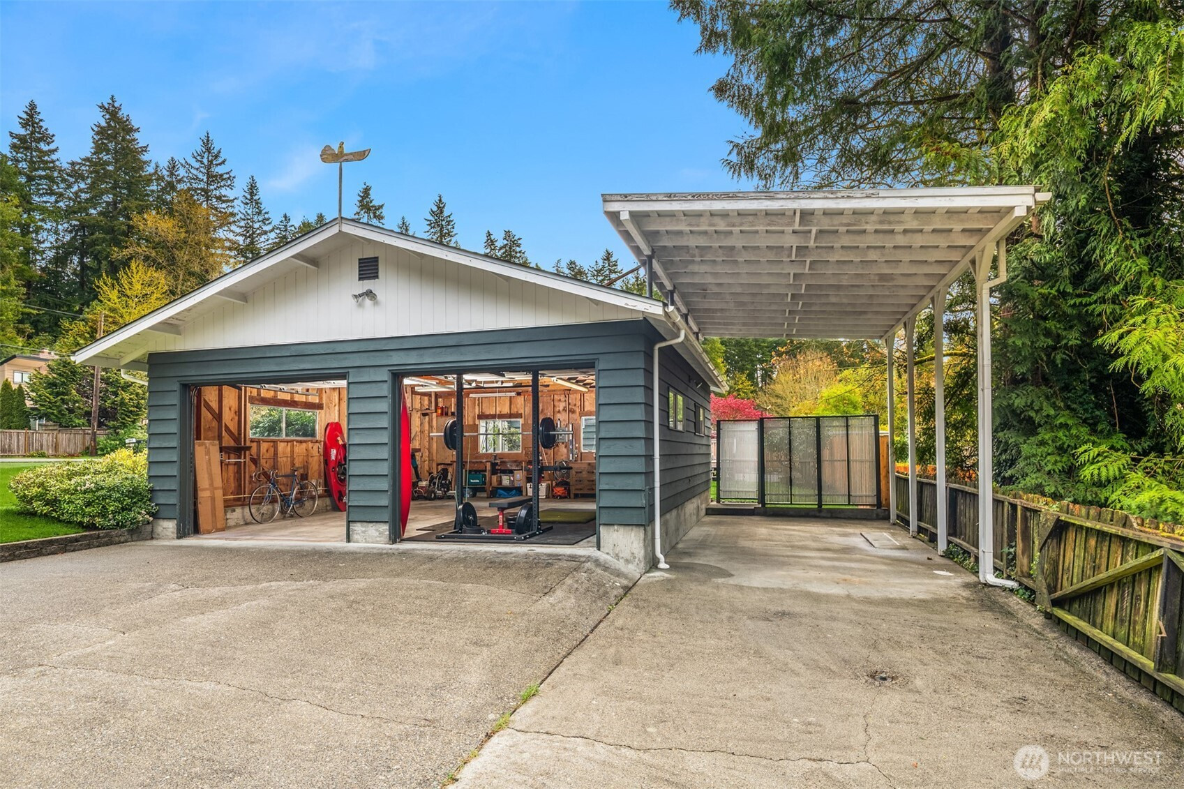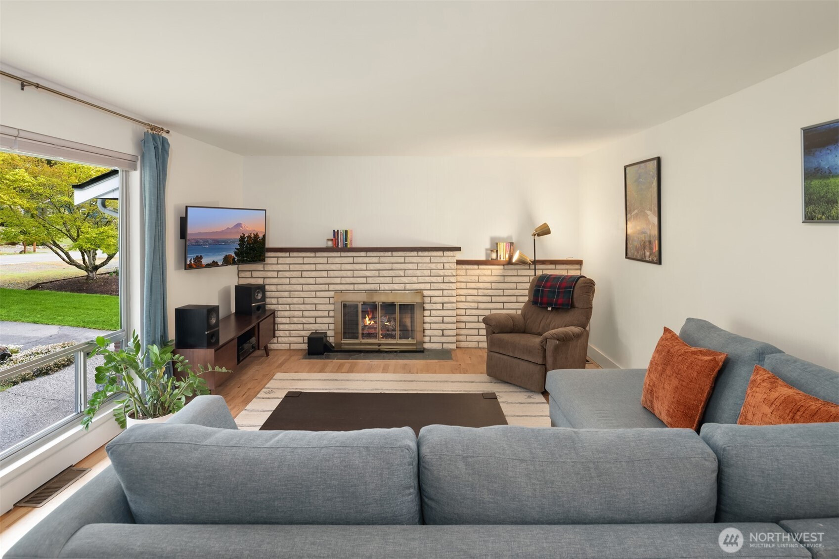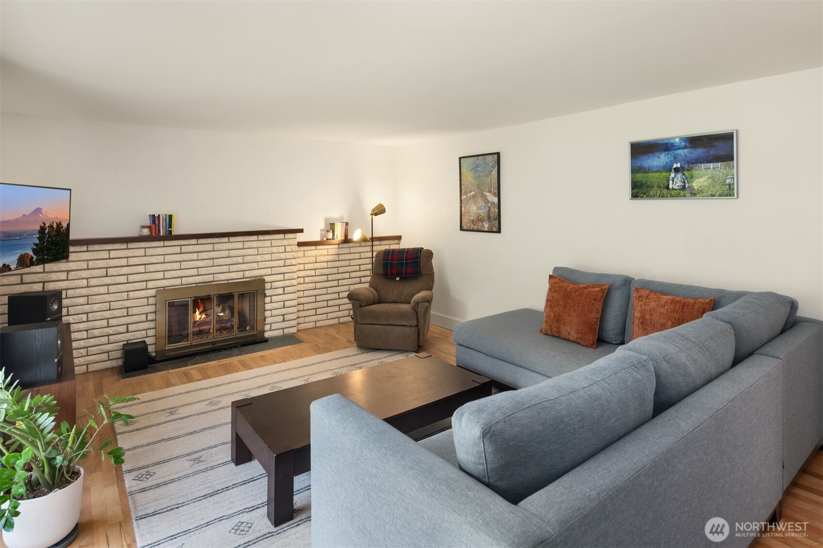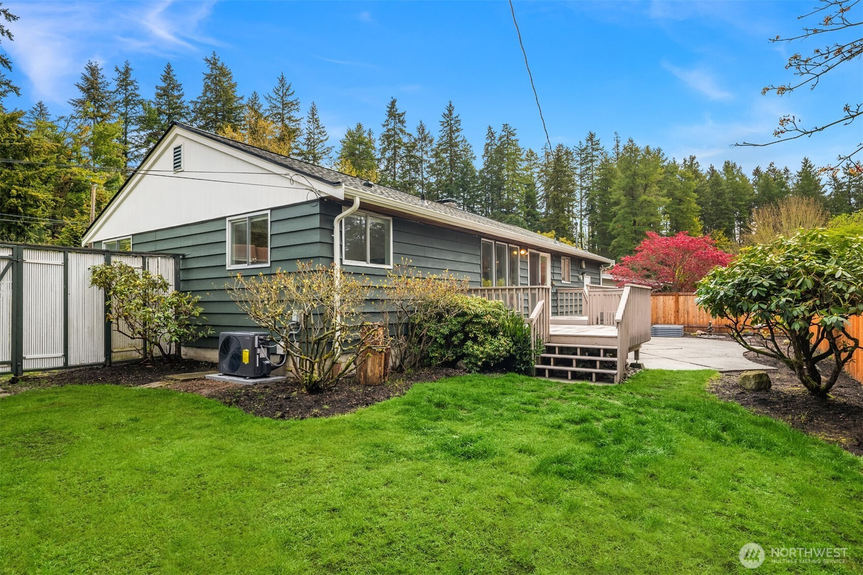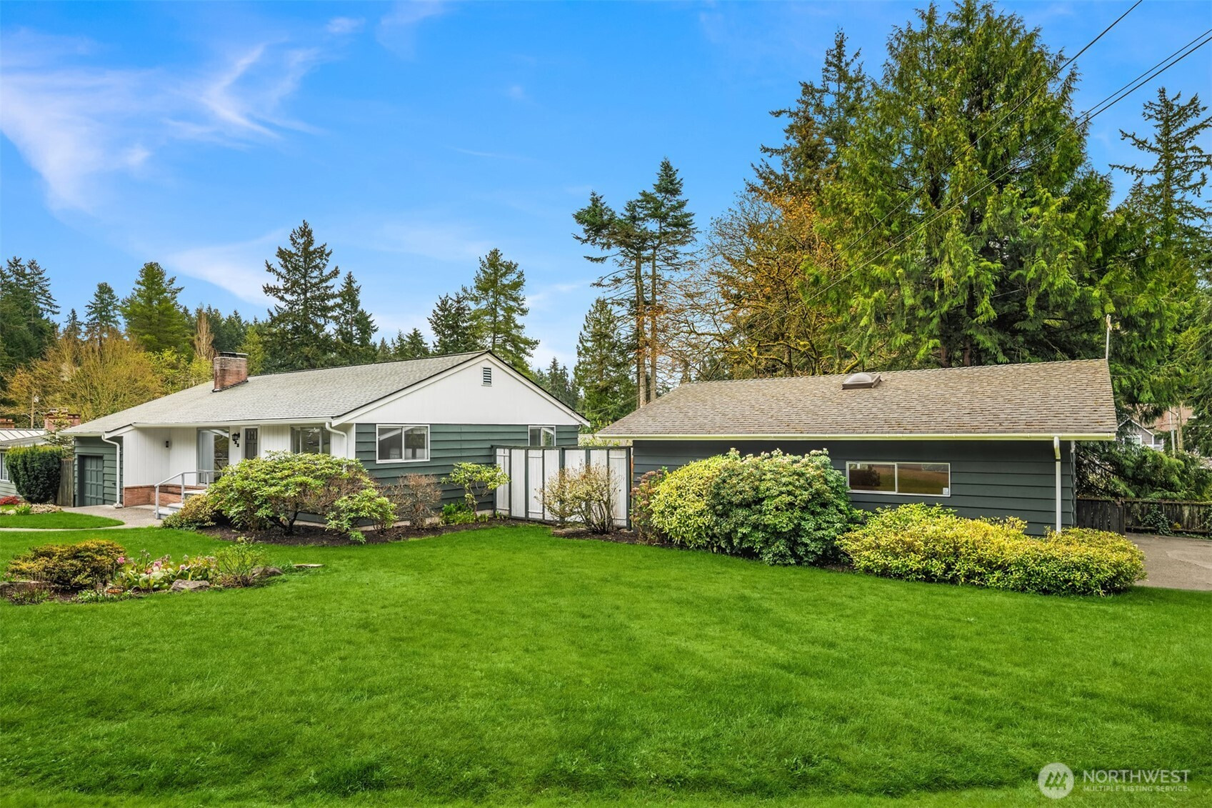 Quietly tucked away on a sprawling corner lot in Richmond Highlands, this move-in ready mid-century rambler boasts a massive 590sf detached garage + towering RV carport with utility hookups! Striking vintage curb appeal with two-tone designer paint, roman brick planter & raised front porch. Newly refinished light oak hardwoods, upscale millwork with 6" baseboards & fresh paint throughout. Slate foyer opens to spacious living room with huge picture window & impressive wall-to-wall brick fireplace. Spacious formal dining with stunning floor-to-ceiling windows. Custom kitchen with sleek euro cabinets, crown molding & breakfast nook with slider to sweeping entertainment deck. Two generous bedrooms with corner windows on main floor + upper 3rd bedroom/bonus room with open rail staircase. Private backyard with extended patio, mature gardens & potting shed. New high-efficiency furnace with heat pump & central A/C. This lovingly cared for gem is a very special find!