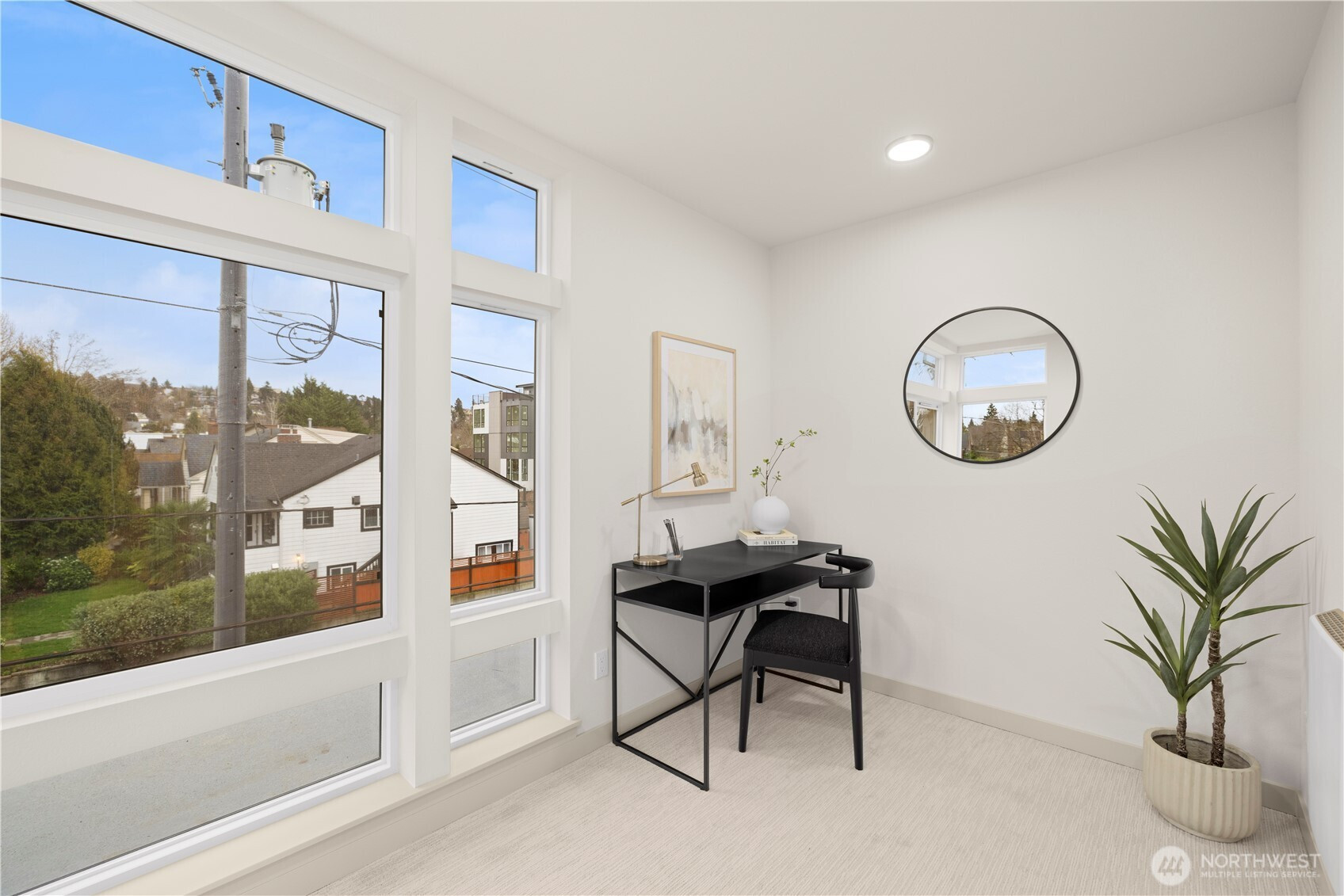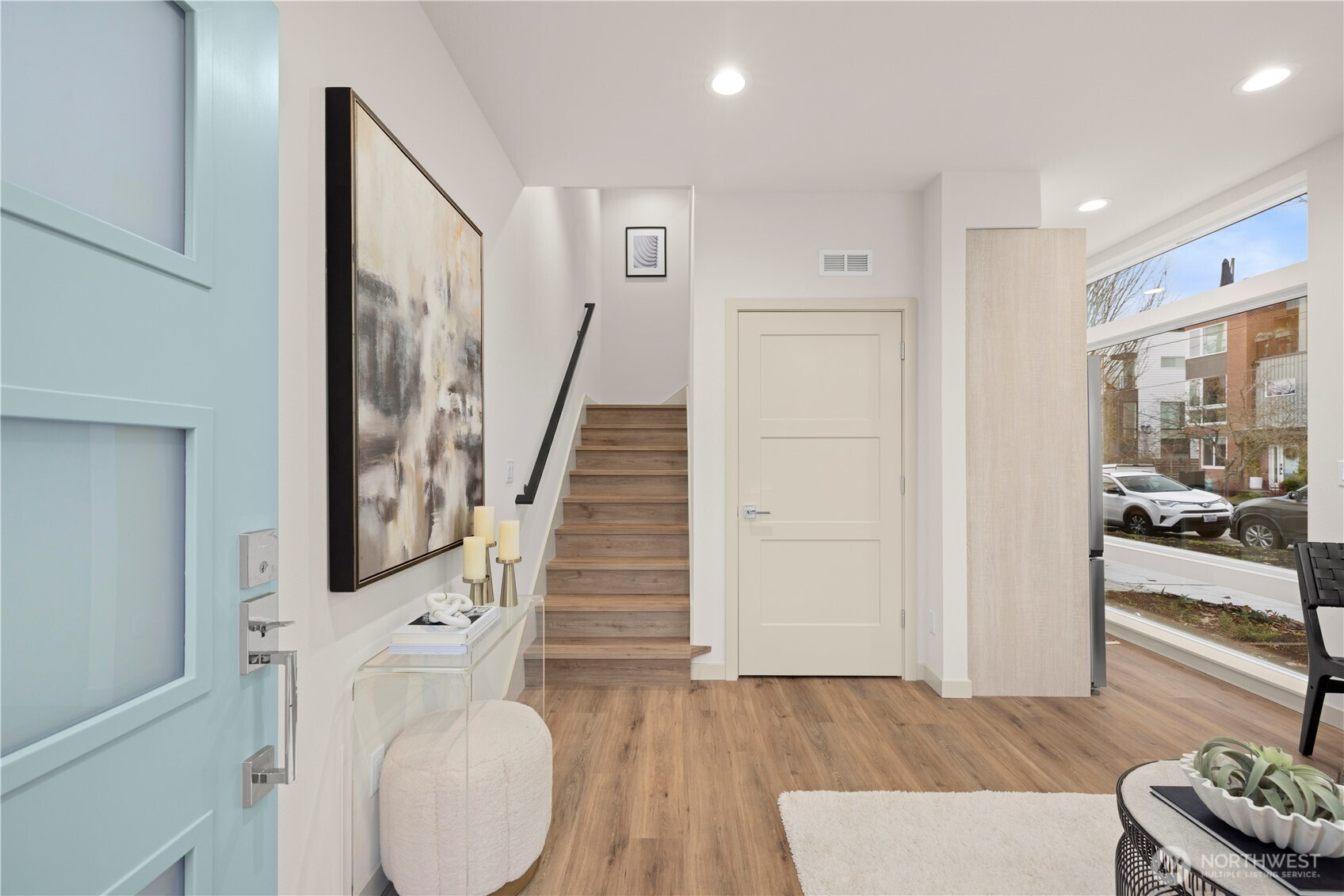 Move-in ready! Striking 4-Star Built Green home by MRN Homes, perfectly positioned on a peaceful tree-lined street in the heart of Ballard. Thoughtfully designed for elevated modern living, this light-filled home offers a flexible floorplan, with abundant windows that pour in natural light from every angle. Soaring ceilings, luxe vinyl plank floors & an airy open-concept layout create a warm yet refined atmosphere. The stylish kitchen showcases sleek quartz countertops, premium appliances, designer finishes & effortless flow—ideal for entertaining or unwinding at home. The top-floor primary suite is a personal retreat with a spa-like bath. A versatile 2nd bedroom offers endless flexibility, perfect for guests, a work-from-home office, or home gym. Enjoy the rooftop deck, ideal for sunset gatherings, morning coffee, or simply soaking in Ballard’s laid-back charm. Complete with A/C and convenient designated parking with EV charging. With a Walk Score of 92, you’re just moments from the iconic Farmers Market, beloved cafés, acclaimed dining, boutique shopping, parks, and transit. An exceptional opportunity in one of Seattle's most sought-after neighborhoods. Not a Condo + No HOA Dues!