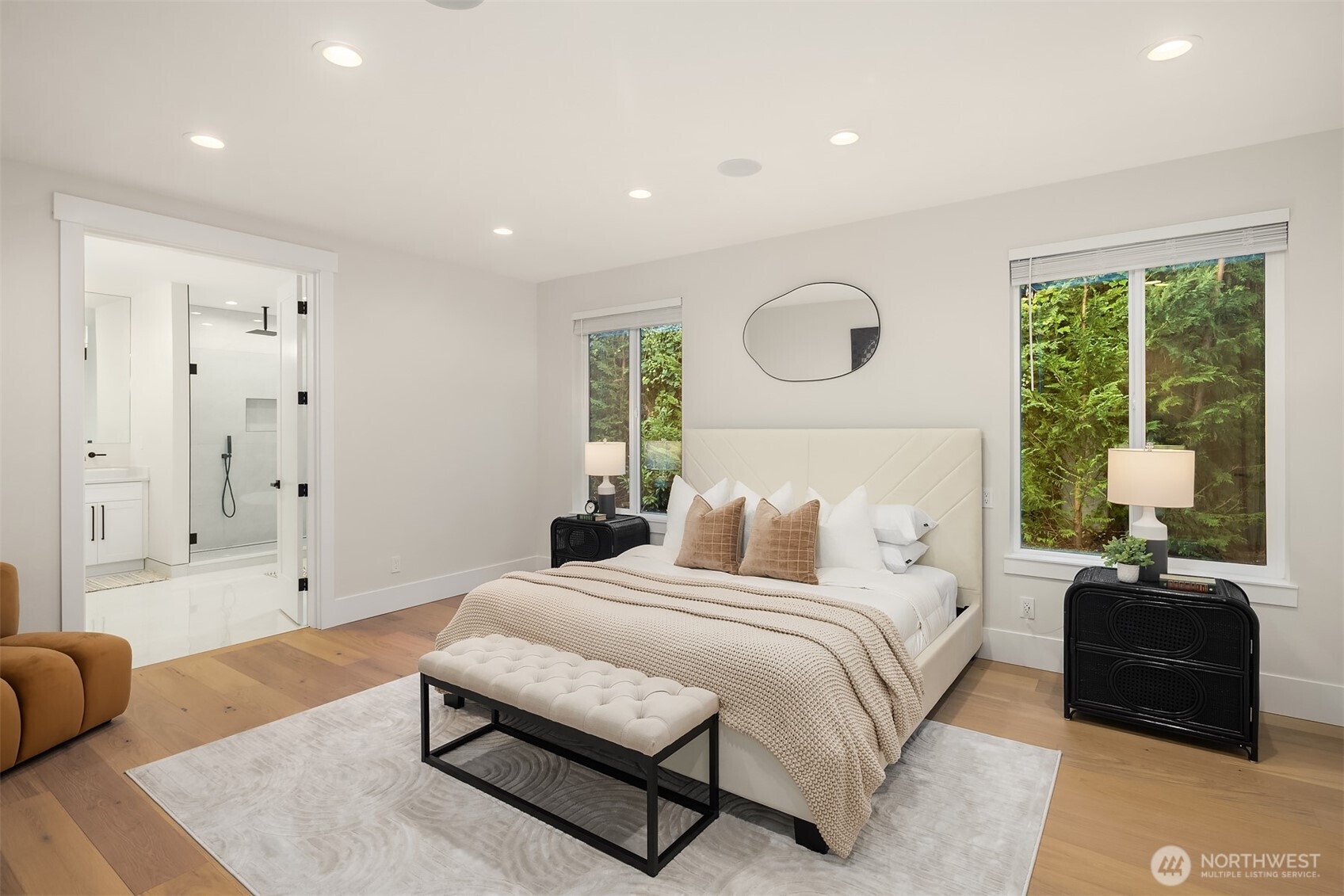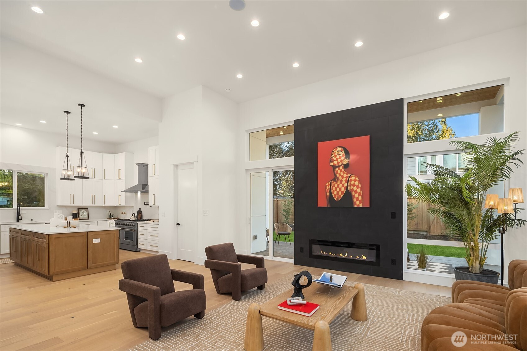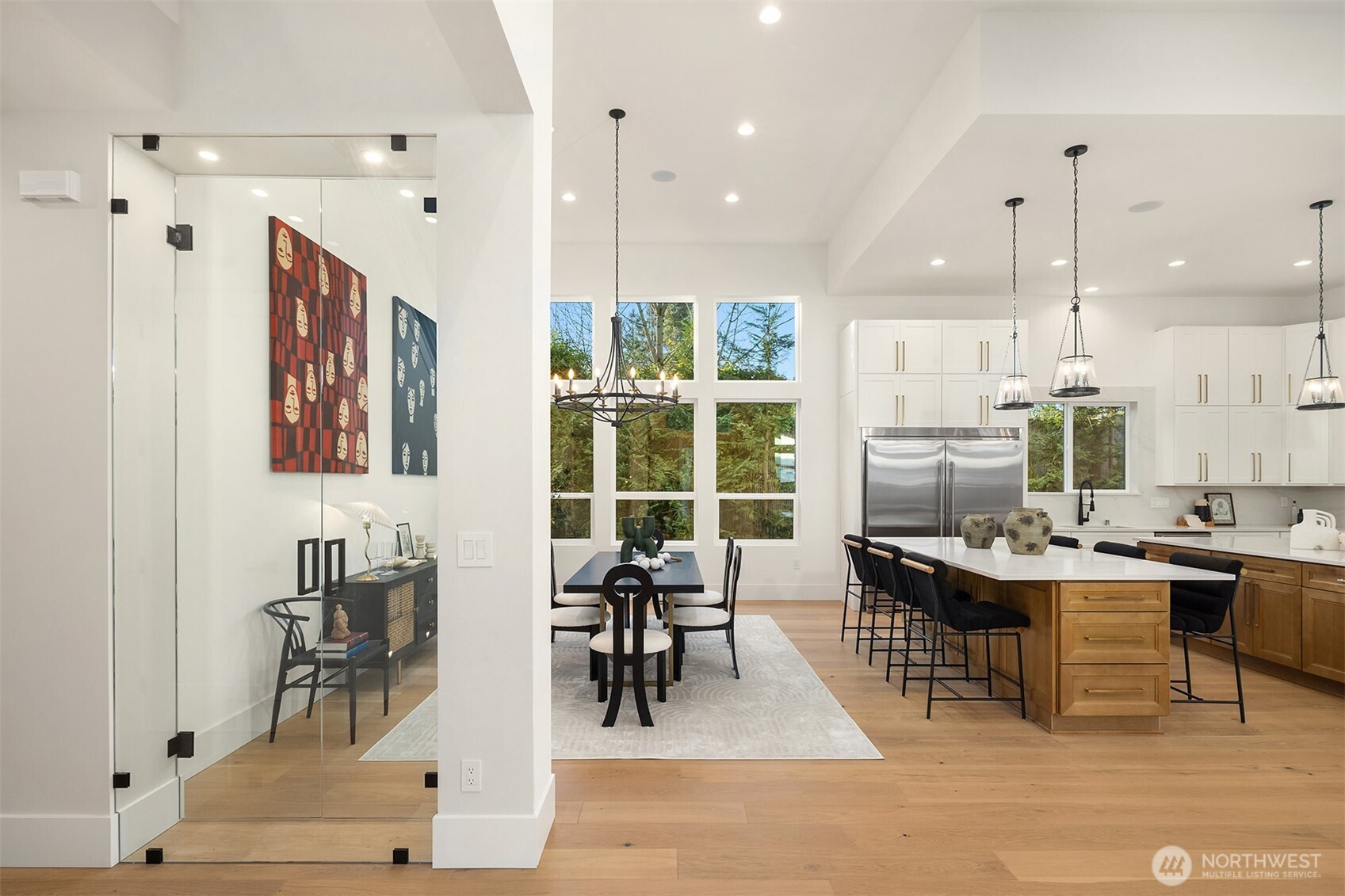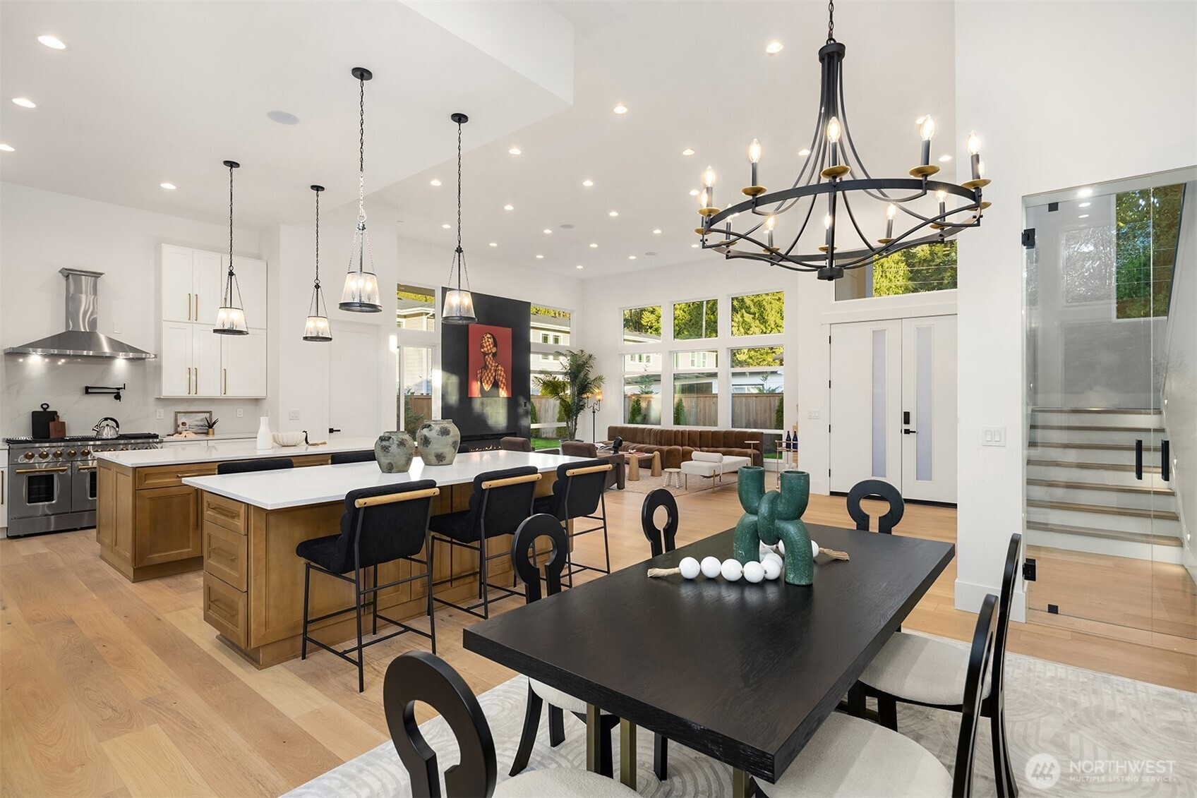 Striking new construction in the heart of highly sought-after Bridle Trails, this 4,160 sq ft modern residence blends clean architectural lines with warm, livable design. Thoughtfully crafted with premium materials and impeccable attention to detail, the home offers an ideal balance of sophistication and comfort. The open-concept main level is anchored by a dramatic great room with soaring ceilings, walls of windows, and a sleek fireplace feature. A designer kitchen showcases custom cabinetry, oversized dual islands, high-end appliances, and seamless flow to the dining and living spaces—perfect for entertaining at scale or everyday living. Indoor-outdoor living is effortless with covered patio spaces overlooking the private, landscaped grounds. Upstairs and beyond, the home offers generously sized bedrooms, spa-inspired baths, and flexible spaces ideal for a home office, media room, or guest retreat. The primary suite is a true sanctuary, featuring a luxurious bath with freestanding tub, glass-enclosed shower, dual vanities, and a custom walk-in closet. Surrounded by nature, yet minutes to downtown Kirkland, Bellevue, top-rated schools, parks, and commuter routes, this Bridle Trails home delivers modern luxury in one of the Eastside’s most desirable neighborhoods. A rare opportunity to own brand-new construction where design, location, and lifestyle converge.