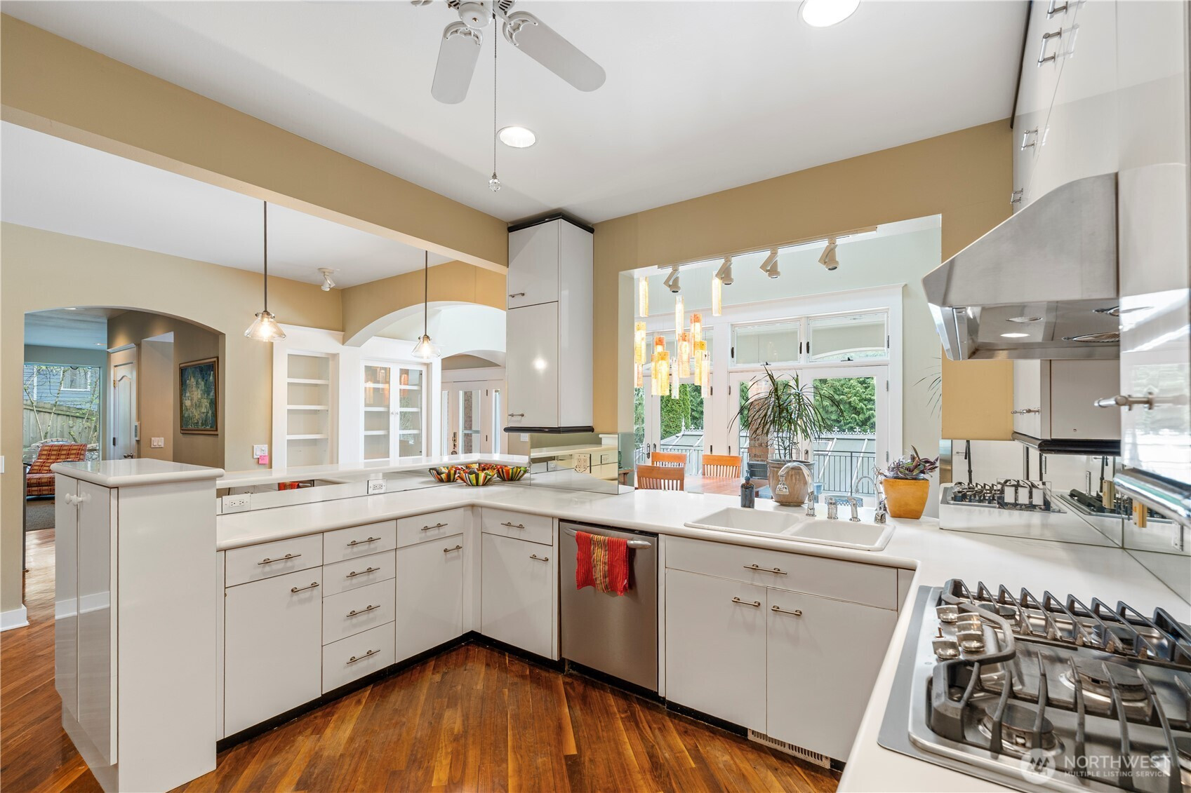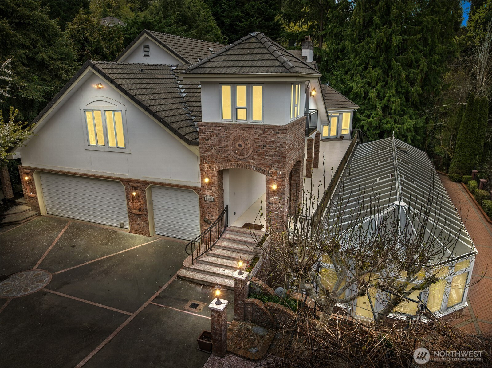 Discover refined living in this stately Mercer Island home offering 3,720 square feet of thoughtfully designed space. This elegant residence features 4 spacious bedrooms, a private den, and an expansive bonus room—perfect for today’s flexible lifestyle. A sizeable living room with a gas fireplace creates a warm and inviting atmosphere, while the impressive 2-story dining room showcases a stunning artisan chandelier, ideal for memorable gatherings. Beautiful hardwood floors with custom inlays flow throughout, complemented by heated tile floors in the entry, dining room & mud room for added comfort. Convenience meets functionality with an elevator, a large laundry room with abundant cabinetry, and a separate mud room with extensive built-ins. Storage is plentiful throughout the home, and the oversized 3-car garage provides ample space for vehicles and hobbies alike. At the heart of the home, a breathtaking atrium offers a true retreat, complete with an in-ground pool and private shower. Step outside to stunning, meticulously designed grounds featuring expansive patios and extensive custom brickwork, perfect for entertaining or quiet moments surrounded by nature. Completely private and beautifully appointed, this exceptional property blends classic style with modern amenities in one of the most private, West facing Mercer Island’s settings.