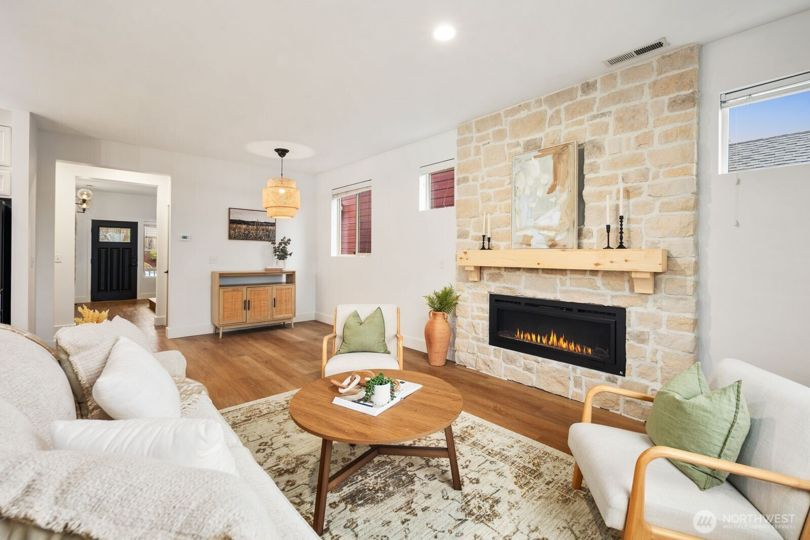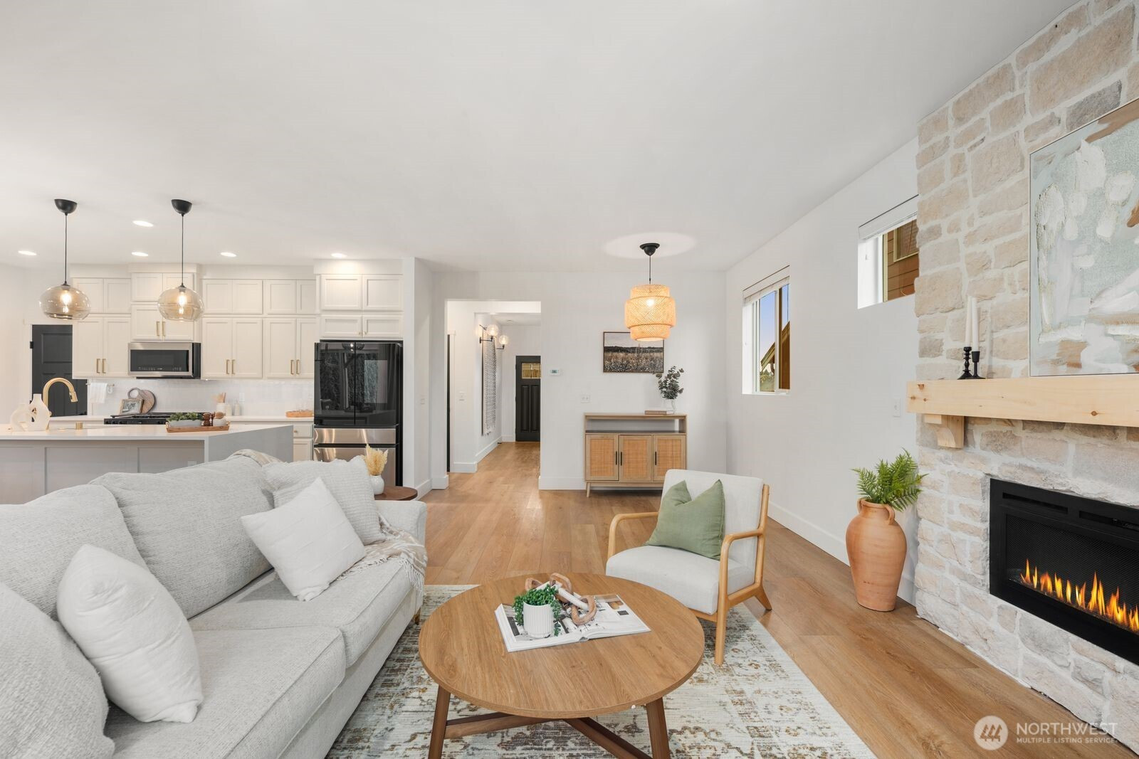 Upgraded inside and out! This Lakeland Hills home built in 2014, offers 3-bedrooms and 1,813 sq ft in the Ridge at Bowman Creek community. The 4,000 sq ft lot backs to green space with no direct rear neighbor. Main level features updated SPC waterproof flooring, an electric fireplace also stubbed for gas, with floor to ceiling stone work perfect alongside this open-concept layout. Kitchen includes new appliances, a large walk-in pantry, and gorgeous cabinetry. Primary suite includes a remodeled bath with a luxurious rain shower head. Laundry room is located upstairs with all three bedrooms. Additional features include air conditioning, tankless water heater, and an attached 2-car garage with upgraded electrical panel. Outdoor upgrades include a Trex deck, poured concrete patio pad with hot tub hookup, multiple exterior gas stubs for BBQ or future generator setup, and pre-plumbed lines for landscaping. Exterior and interior paint also recently updated. Located approximately 0.3 miles to neighborhood park and playground, with convenient access to Auburn amenities and commuter routes.Vacant and ready for its next owner.