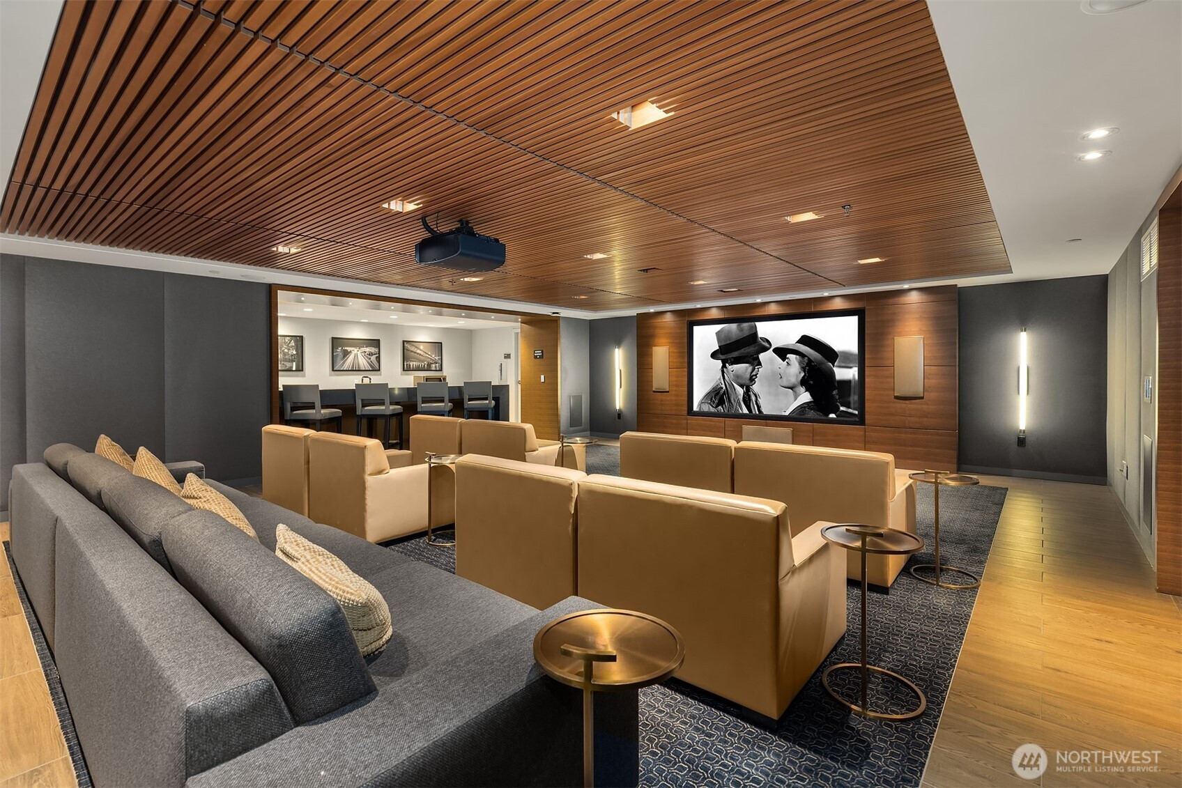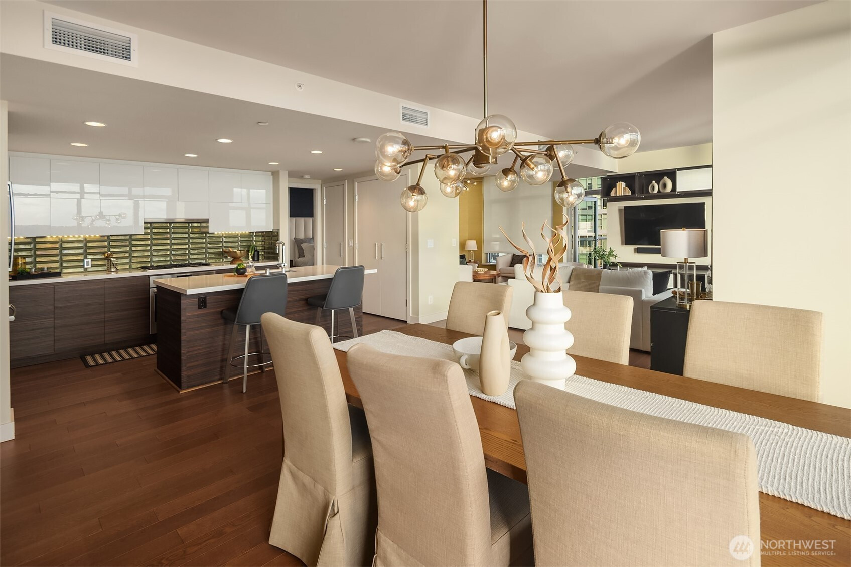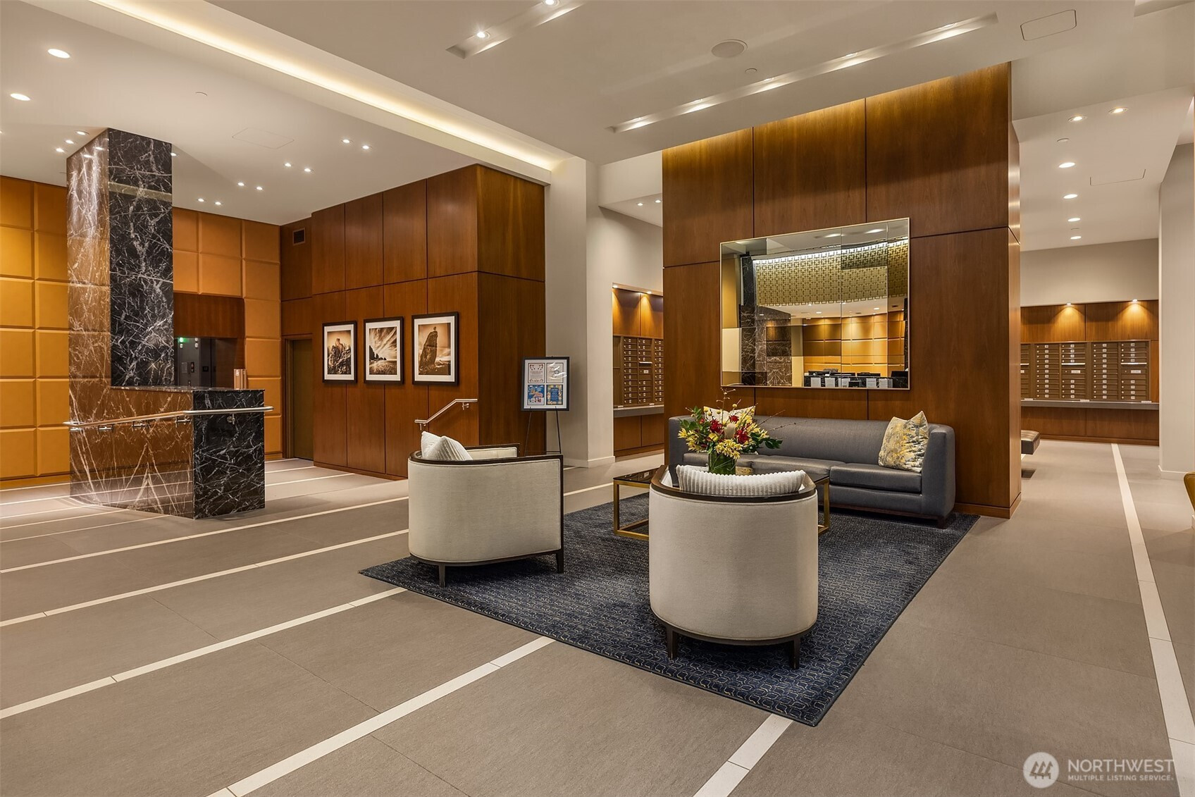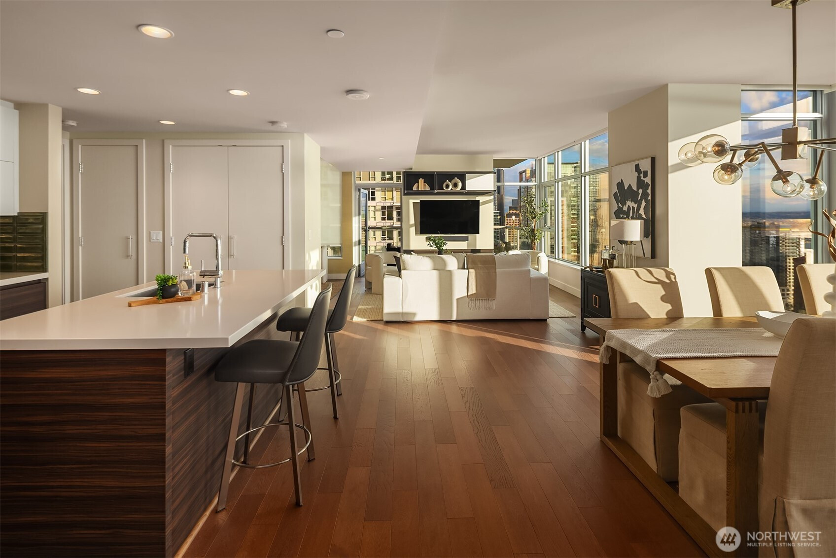 As one of the most sought-after floorplans in the building, this rare 34th floor SW corner 2BD+Den is perched above the city with panoramic views of Elliott Bay, the Olympic Mountains, and the skyline. Walls of glass capture ever-changing skies and weather systems rolling in from the west, bringing movement and depth to the view in every season. Expansive yet comfortable interiors open to a large, covered balcony that extends the living space for year-round use. The kitchen anchors the space with sleek European cabinetry, quartz countertops, chic subway-tiled backsplash, and a premium appliance suite including a Bosch gas cooktop, a Thermador paneled refrigerator, and a cabinet-front dishwasher. The adjoining living/dining spaces create an effortless setting for both entertaining and everyday living, while the den offers flexibility for a home office, guest room, or additional lounge area. The generously sized BDs are thoughtfully separated for privacy, offering custom closets, with a convenient Murphy bed/desk built-in in the guest rm. The spa-inspired stone/marble bathrooms are lovely, but the view of the sunsets from the guest shower, priceless. Designer light fixtures, media center, decorative wall coverings, motorized shades, A/C, and more. Insignia delivers a resort lifestyle with 24-hour concierge service, two-story fitness center w/pool, a screening room, 7th-floor park, 41st-floor rooftop lounges, dog run, and much more! 2 premium parking spaces / 1 storage included.