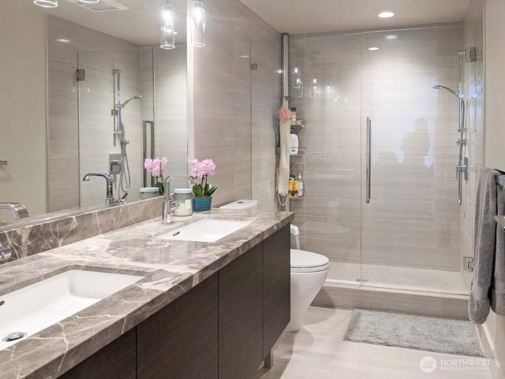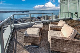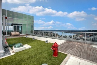 Experience refined city living in this light-filled 2-bedroom, 2-bath corner residence in Insignia’s sought-after South Tower. Thoughtfully designed, the open-concept layout flows seamlessly onto a spacious covered deck—perfect for year-round entertaining with partial views of Puget Sound and Lake Union. The chef’s kitchen features quartz countertops, sleek European-style cabinetry, and premium Bosch & Thermador appliances, including a gas cooktop. Bedrooms are privately positioned on opposite sides of the home, each offering custom California Closets for optimal storage and functionality. Insignia delivers a true luxury lifestyle with world-class amenities: 24-hour concierge, two-level fitness center, indoor lap pool, hot tub, steam and sauna rooms, private theater, multiple rooftop lounges, outdoor park with BBQ areas, EV charging, car wash, and pet retreat with grooming spa. Includes dedicated parking and storage. Pet-friendly with no rental cap. Ideally located in the heart of the city, just moments from Amazon HQ, Whole Foods, top dining, and everyday conveniences.