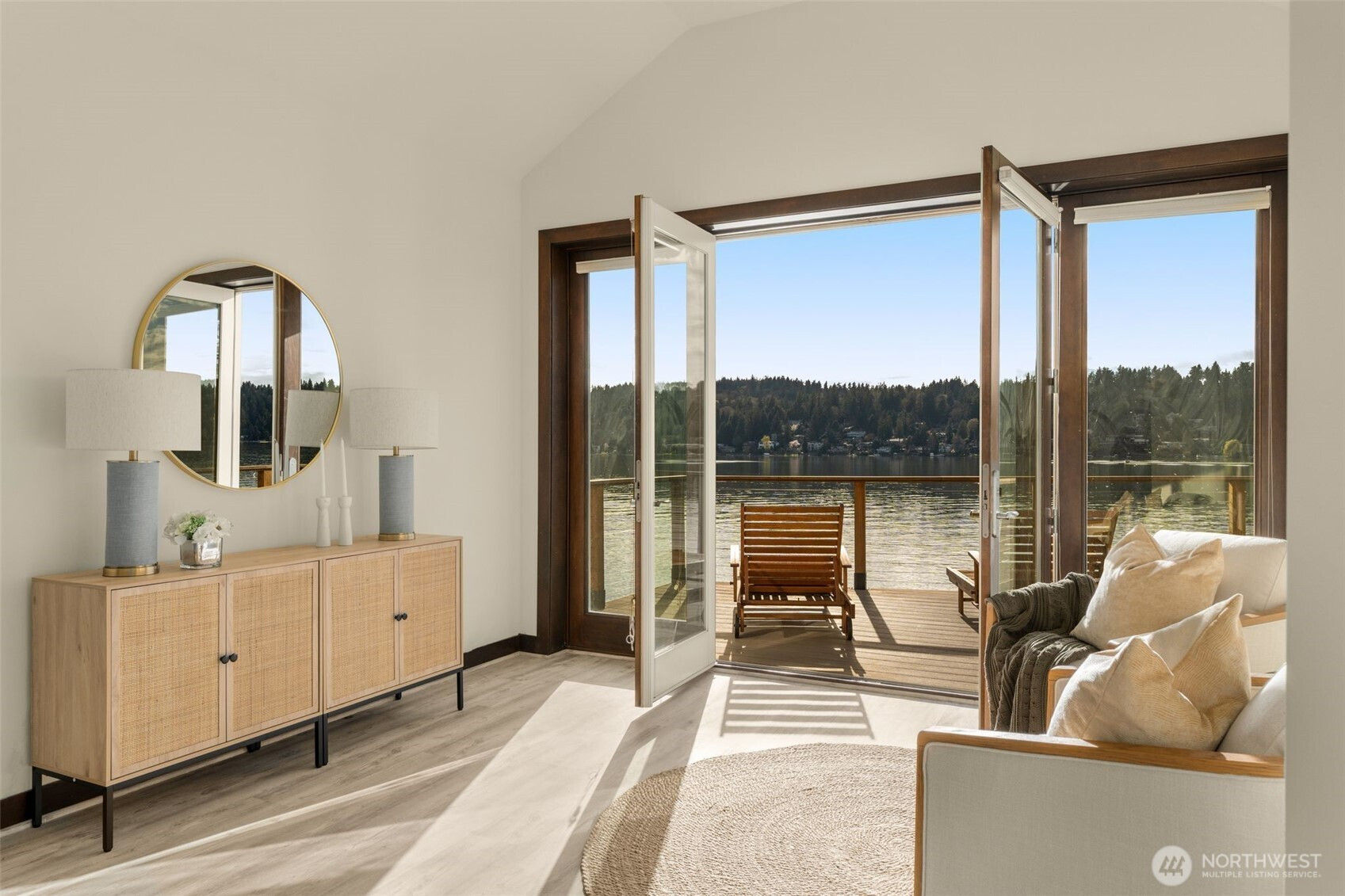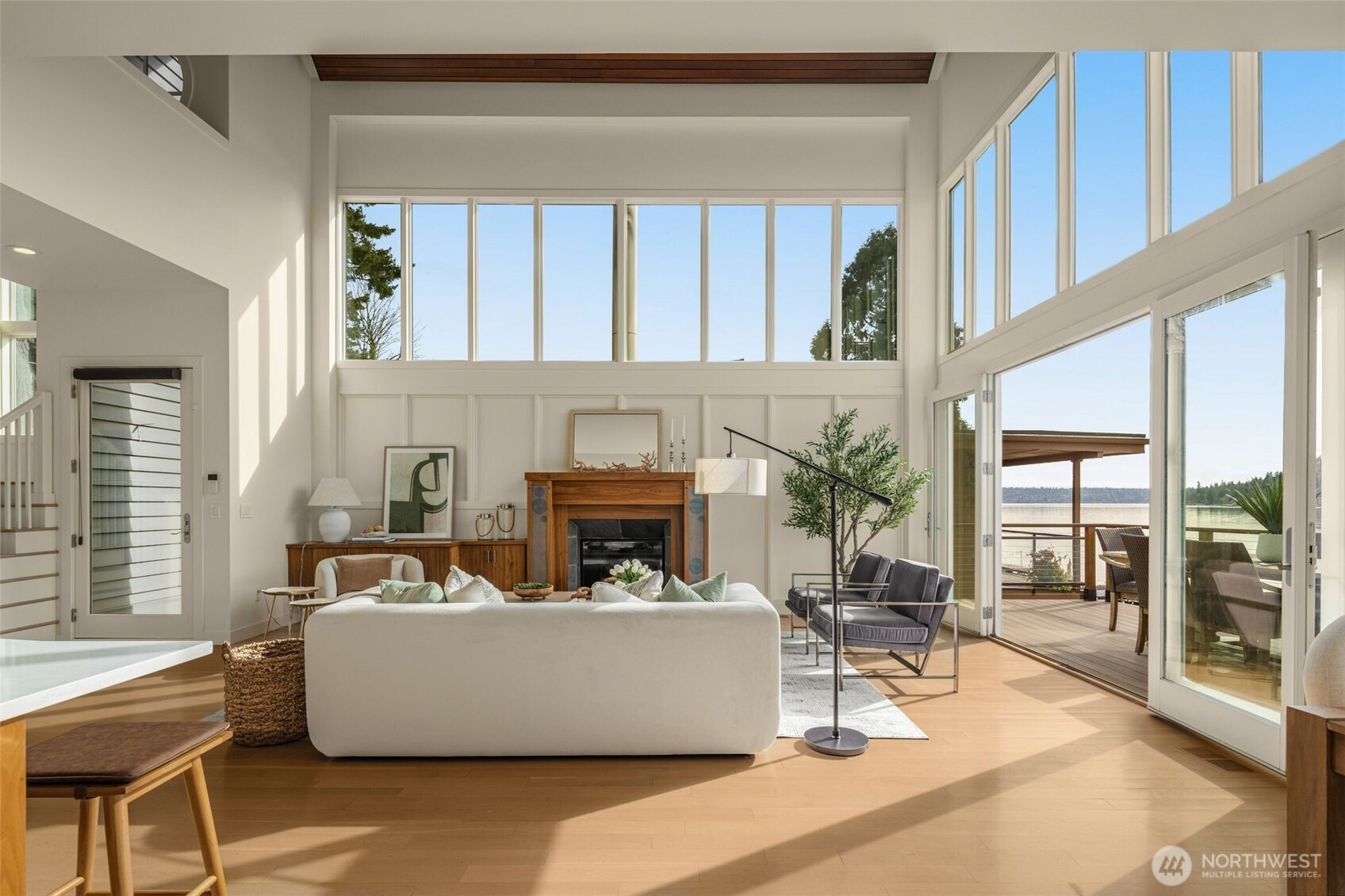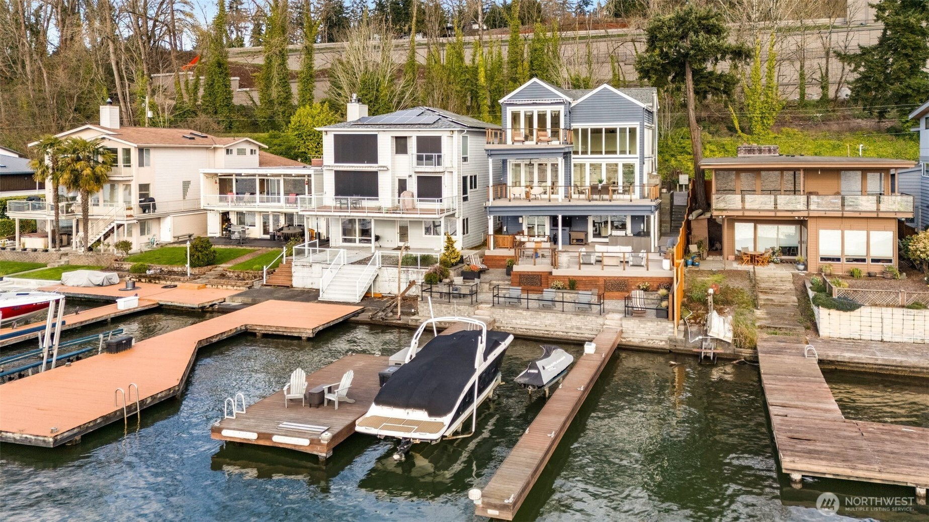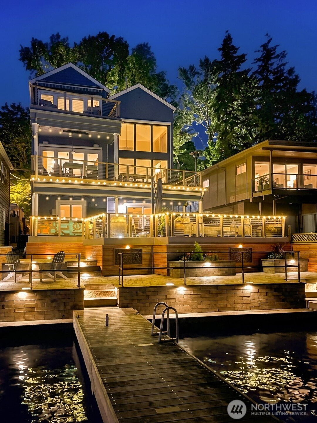 Lakefront resort-style living designed for boating enthusiasts, featuring two docks with Basta power lifts. Set on 42 feet of coveted west-facing lakefront tucked away on a private lane, the property combines striking Northwest contemporary design with expansive, professionally landscaped multi-level grounds. A dramatic 22-foot ceiling welcomes you into the sun-drenched great room framed by walls of wood and glass. The chef’s kitchen boasts premium Wolf and Miele appliances, a spacious walk-in pantry, and seamless access to multi-level decks, perfect for entertaining. The luxurious primary suite offers a private retreat with a newly remodeled spa-inspired bath, oversized walk-in closet with convenient laundry, loft-style office, and a large lake view deck. The lower level includes a versatile second family room, ideal for a media lounge, gym, or guest retreat, with direct access to the waterfront backyard, plus two additional bedrooms and two baths. Enjoy year-round outdoor living with a custom-built kitchen featuring a Bull grill, dual beverage drawers, seating with outdoor TV, heaters, and multiple entertaining areas. Additional highlights include remote-controlled blinds, a 2-car garage with Tesla charger, and dedicated guest parking. Easy access to I-405 and the expansive Eastrail trail system stretching from Renton to Woodinville completes this exceptional waterfront lifestyle.
