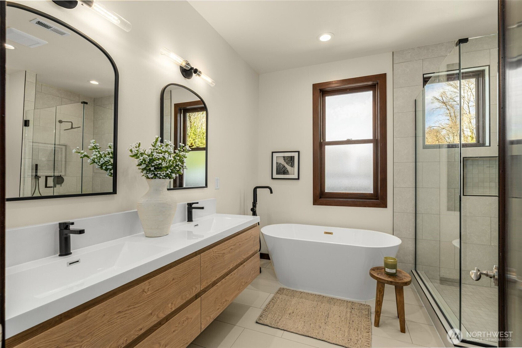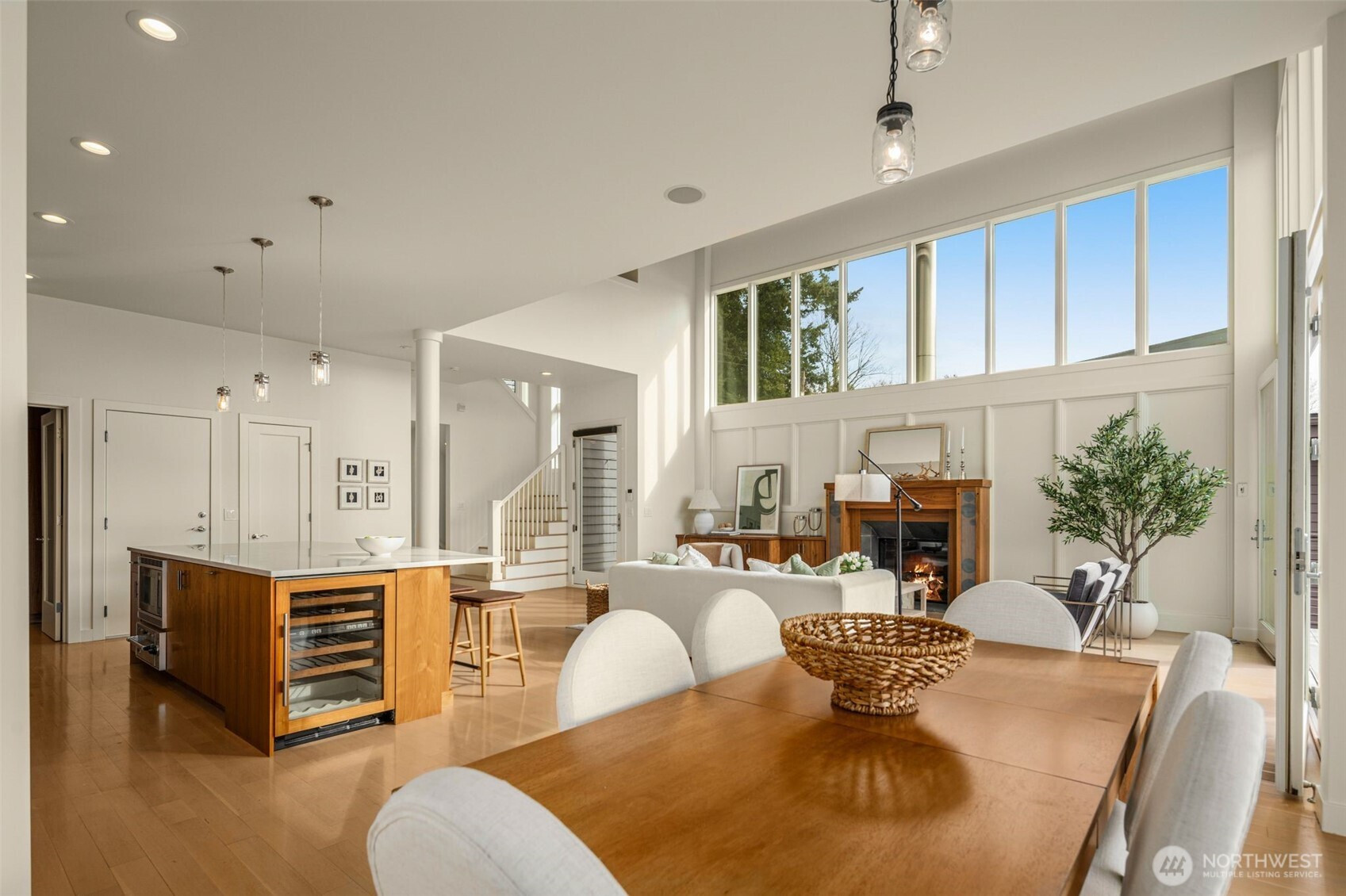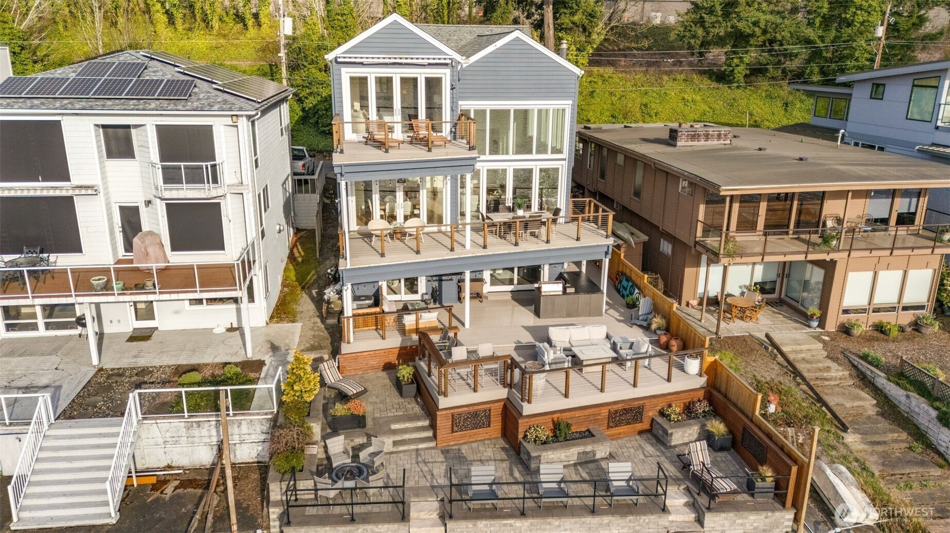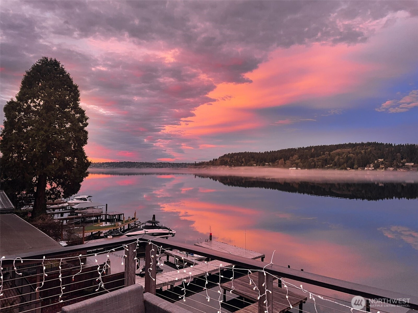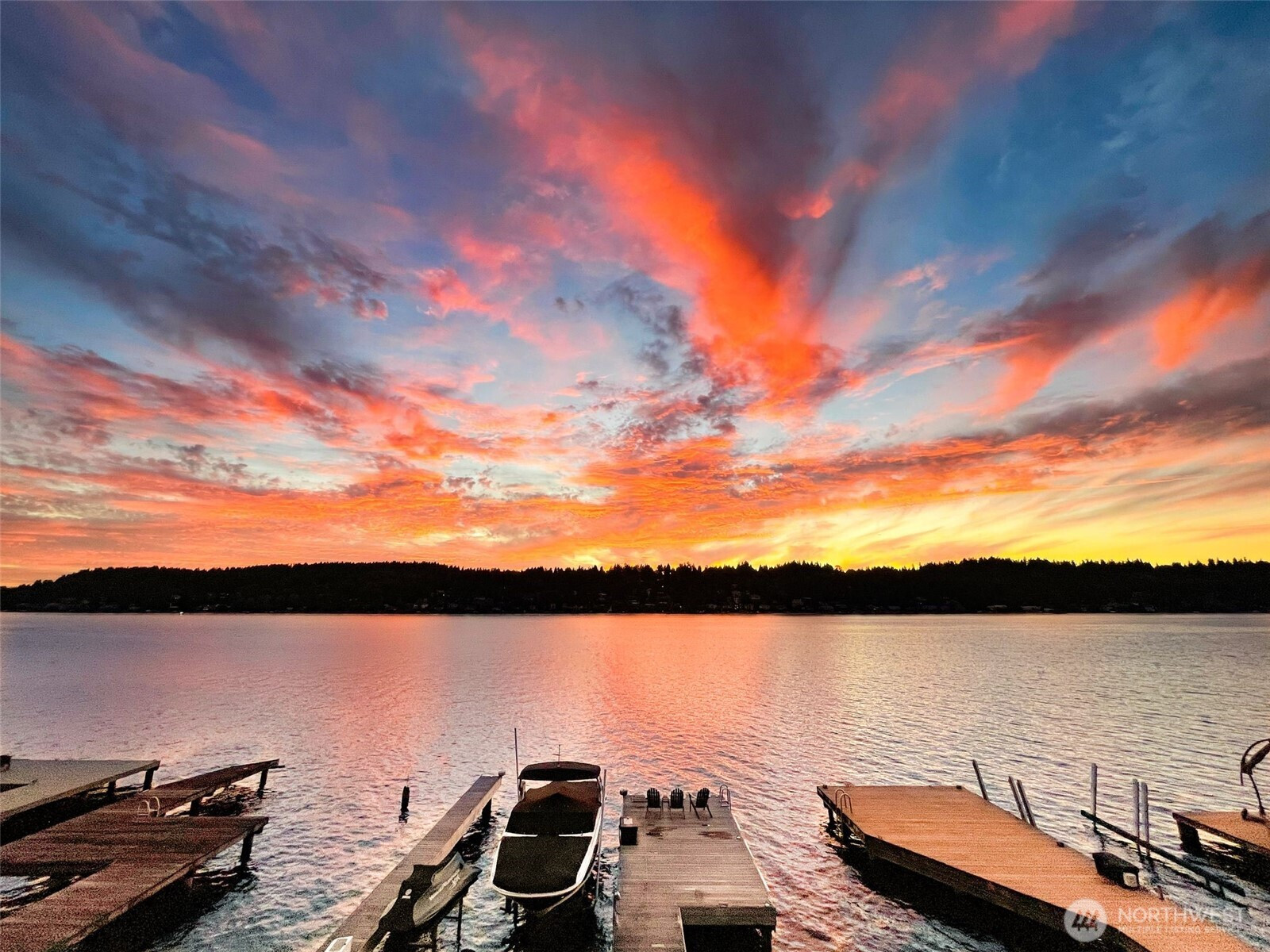 Lakefront resort-style living designed for boating enthusiasts, featuring two docks with Basta power lifts. Set on 42 feet of coveted west-facing lakefront tucked away on a private lane, the property combines striking Northwest contemporary design with expansive, professionally landscaped multi-level grounds. A dramatic 22-foot ceiling welcomes you into the sun-drenched great room framed by walls of wood and glass. The chef’s kitchen boasts premium Wolf and Miele appliances, a spacious walk-in pantry, and seamless access to multi-level decks, perfect for entertaining. The luxurious primary suite offers a private retreat with a newly remodeled spa-inspired bath, oversized walk-in closet with convenient laundry, loft-style office, and a large lake view deck. The lower level includes a versatile second family room, ideal for a media lounge, gym, or guest retreat, with direct access to the waterfront backyard, plus two additional bedrooms and two baths. Enjoy year-round outdoor living with a custom-built kitchen featuring a Bull grill, dual beverage drawers, seating with outdoor TV, heaters, and multiple entertaining areas. Additional highlights include remote-controlled blinds, a 2-car garage with Tesla charger, and dedicated guest parking. Easy access to I-405 and the expansive Eastrail trail system stretching from Renton to Woodinville completes this exceptional waterfront lifestyle.