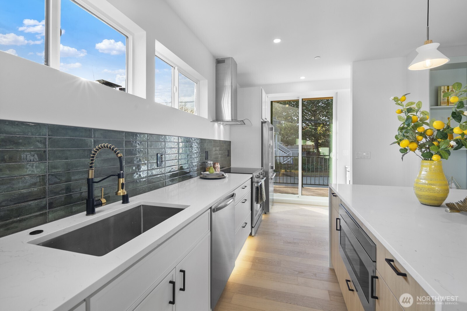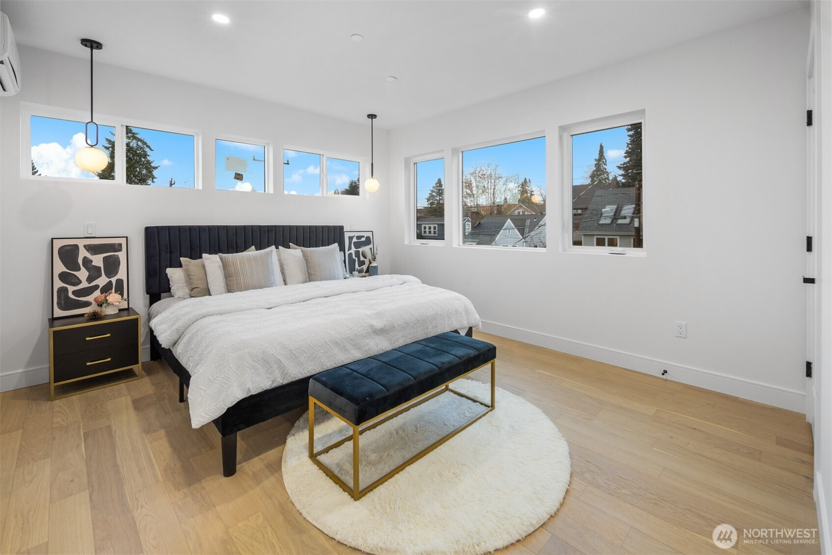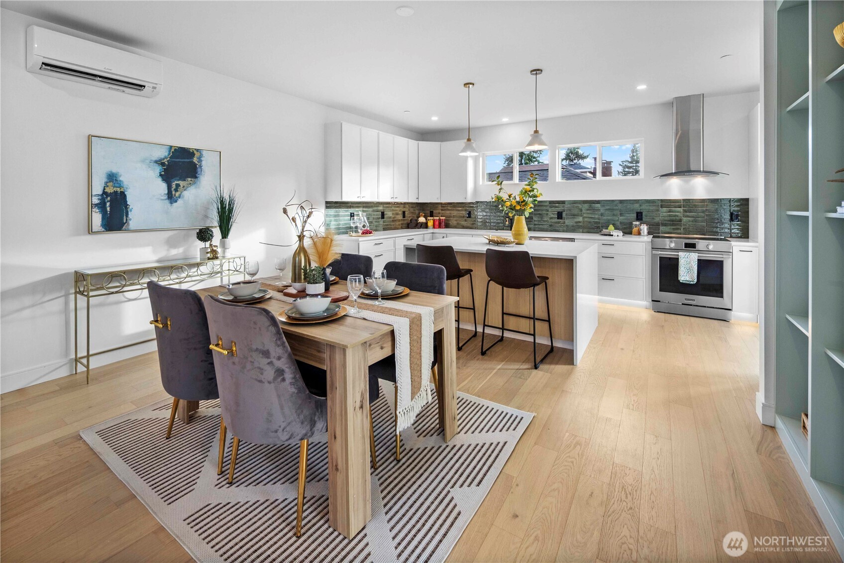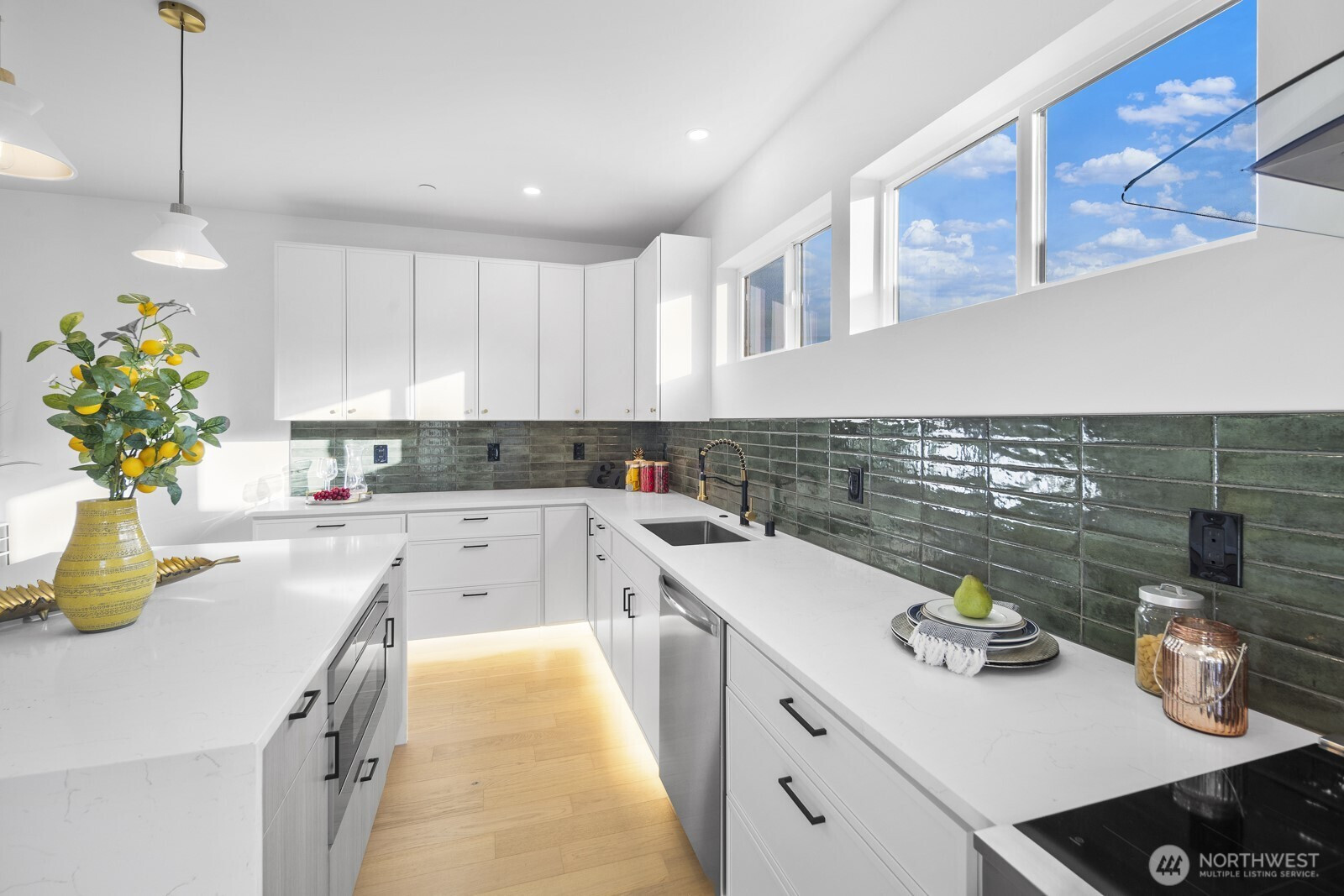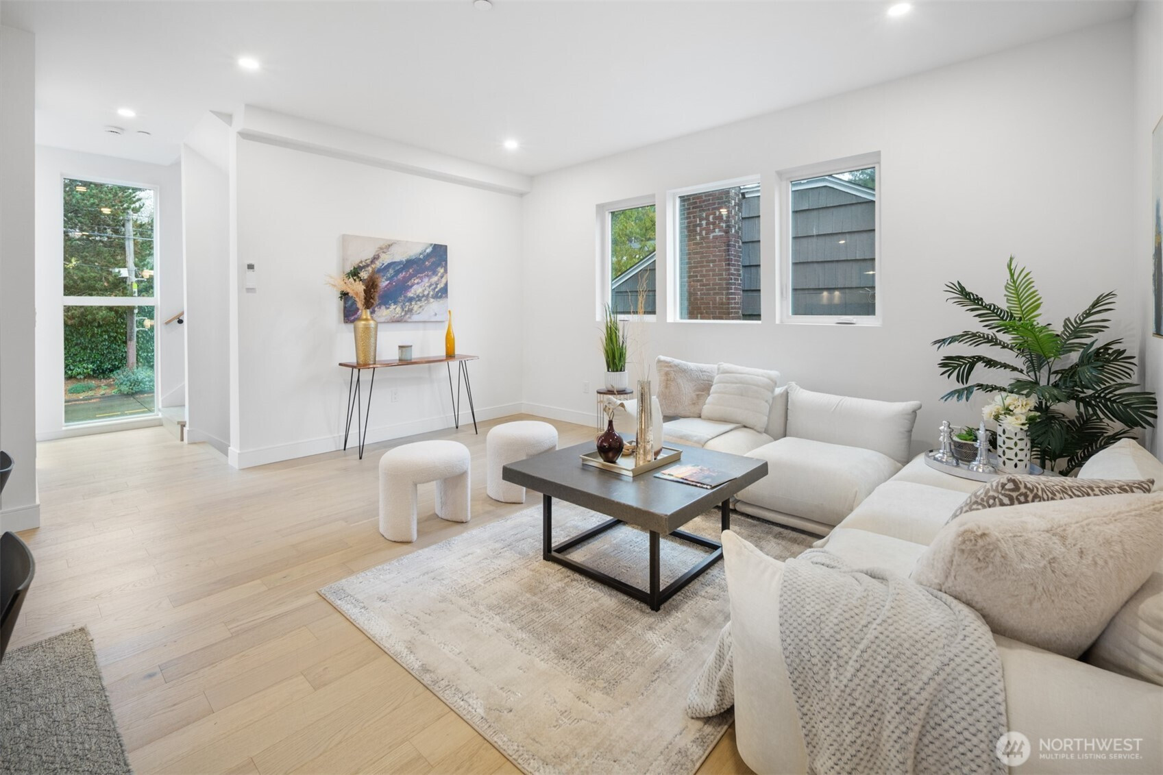 Crisp modern design meets everyday comfort in this Bryant residence with roof deck and off-alley parking. Step into a main-floor great room with wide-plank floors and a standout kitchen featuring a custom tile backsplash, quartz counters, cabinetry, and an oversized island. Gather for dinners inside or spill out to the deck, with a powder room tucked nearby. Upstairs, the primary suite spans the home with dual walk-in closets and a double-sink bath, joined by a second bedroom with walk-in closet, full hall bath, laundry. Two lower-level bedrooms and a flexible rec room open to the patio, ideal for guests or WFH. Centrally located within close proximity of parks, cafés, the Burke-Gilman Trail, University Village and more, don't miss out!