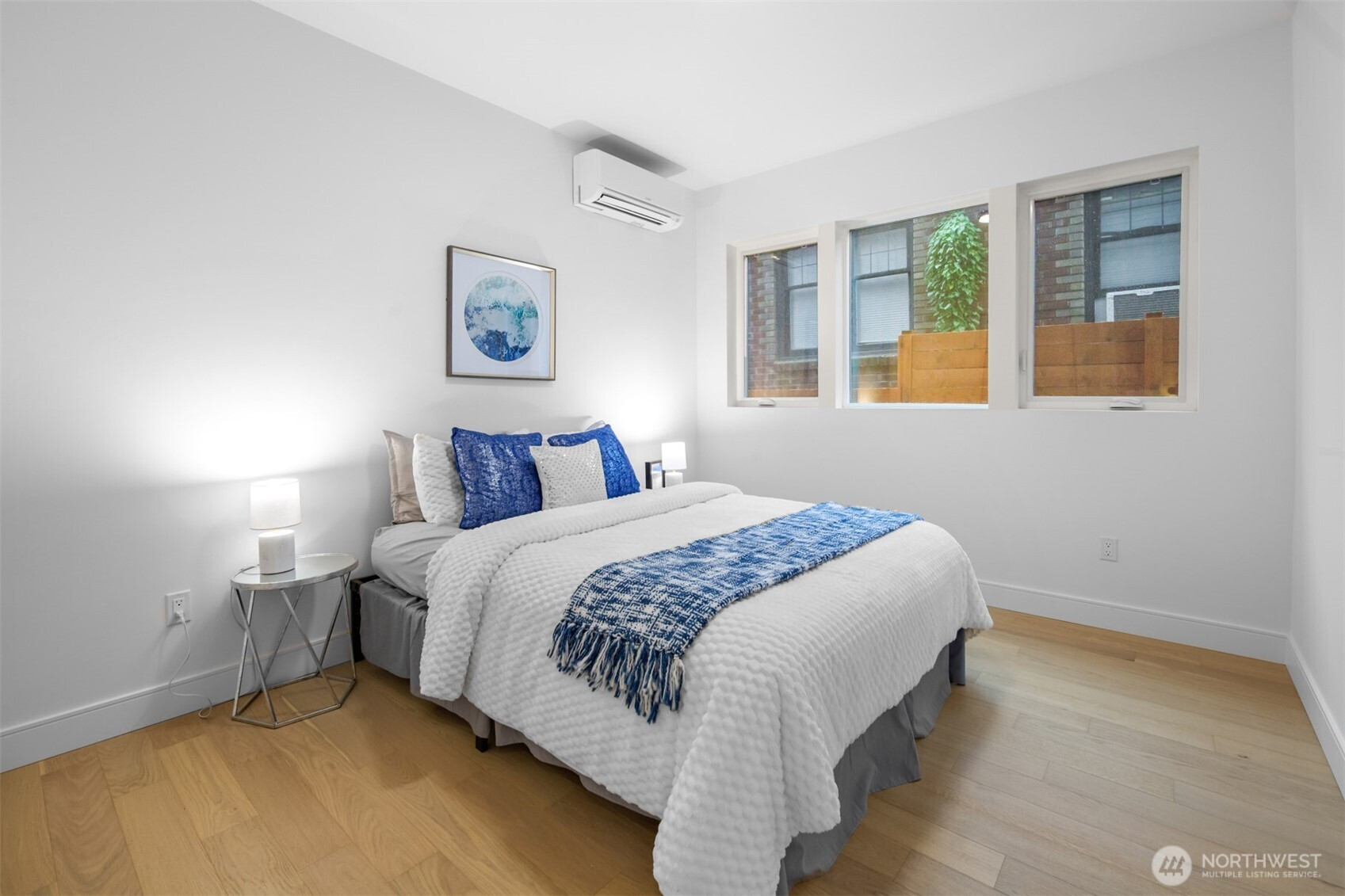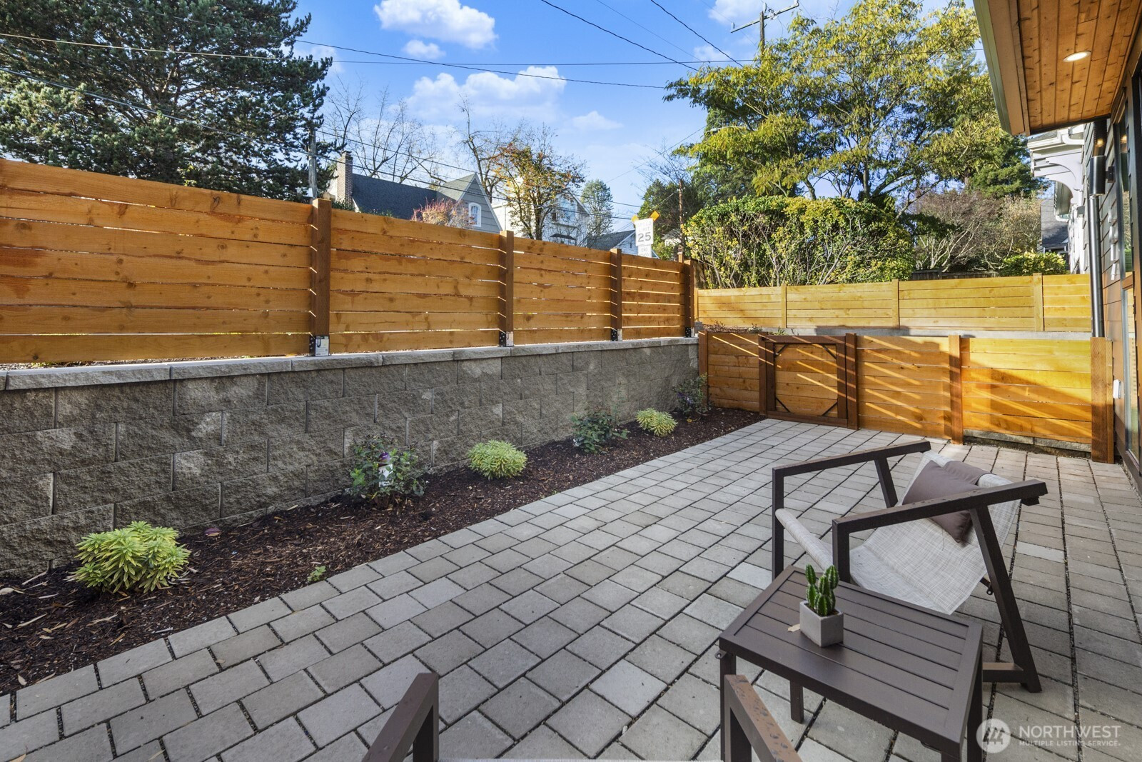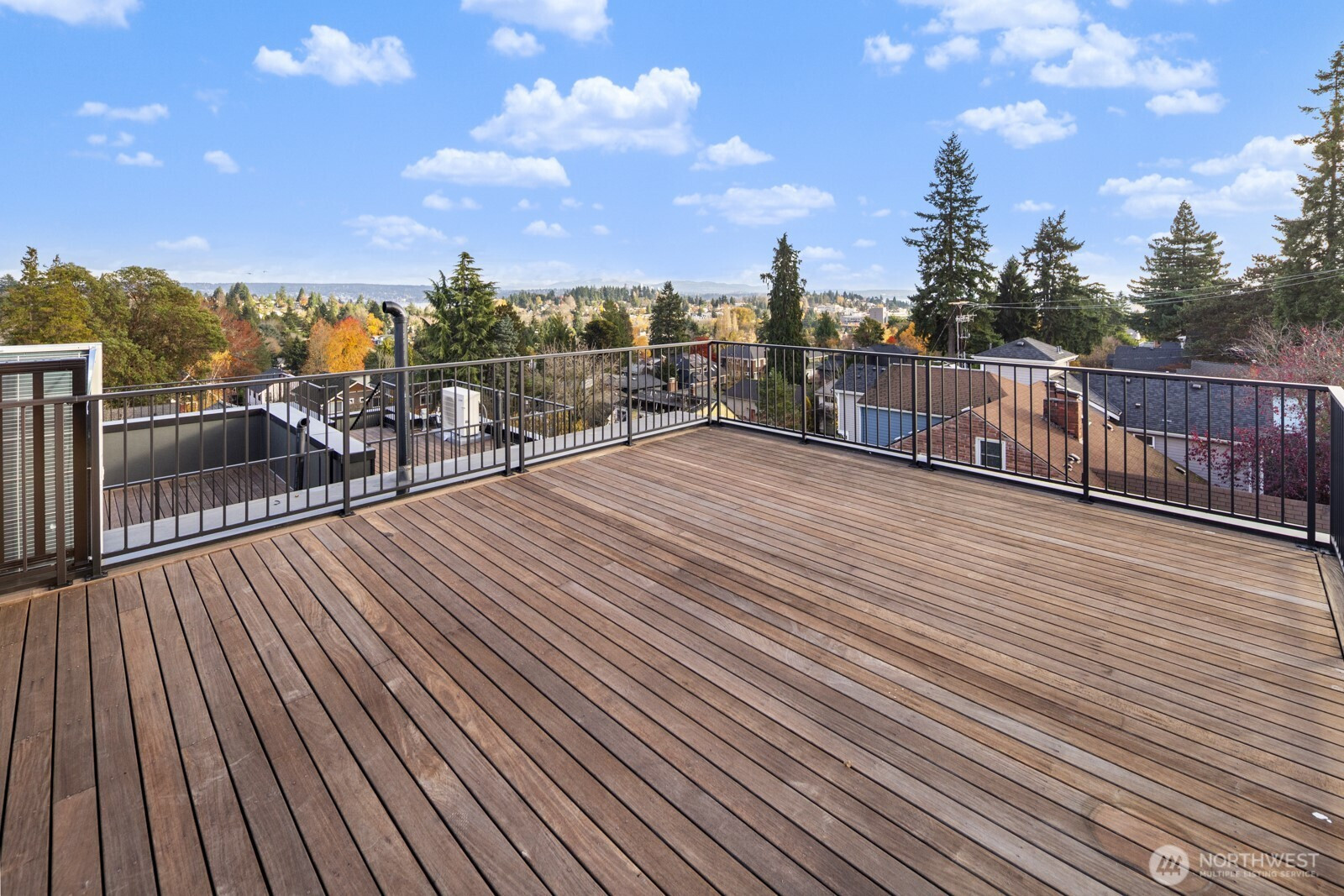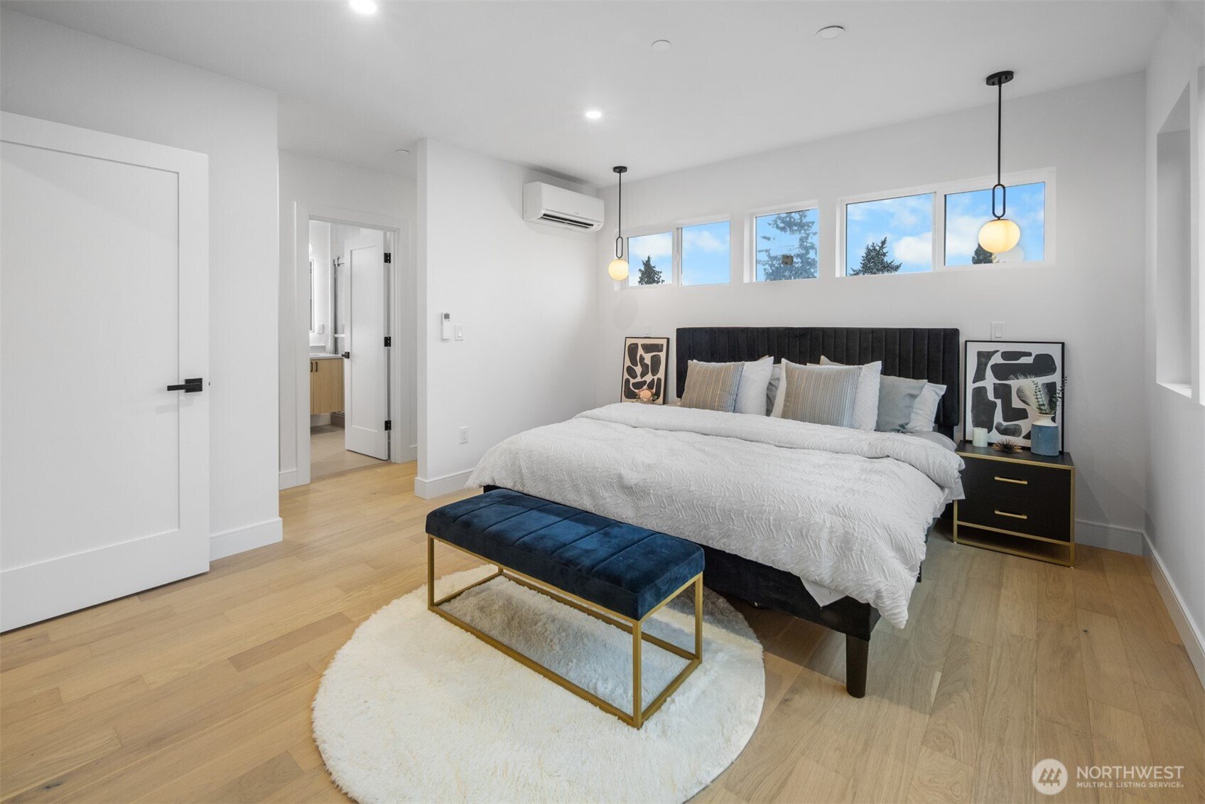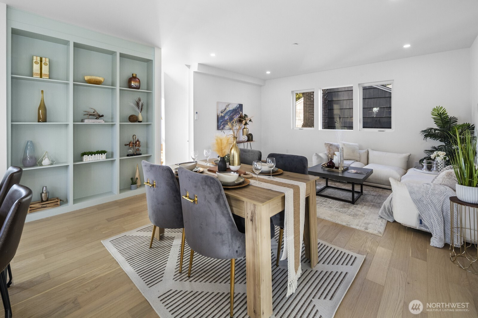 Crisp modern design meets everyday comfort in this Bryant residence with roof deck and off-alley parking. Step into a main-floor great room with wide-plank floors and a standout kitchen featuring a custom tile backsplash, quartz counters, cabinetry, and an oversized island. Gather for dinners inside or spill out to the deck, with a powder room tucked nearby. Upstairs, the primary suite spans the home with dual walk-in closets and a double-sink bath, joined by a second bedroom with walk-in closet, full hall bath, laundry. Two lower-level bedrooms and a flexible rec room open to the patio, ideal for guests or WFH. Centrally located within close proximity of parks, cafés, the Burke-Gilman Trail, University Village and more, don't miss out!