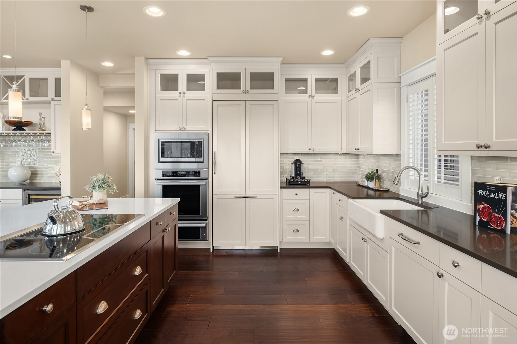 This exceptional Cape Cod meets PNW estate is nestled on a wide tree-lined street at the top of the coveted Hawthorne Hills neighborhood served by one of the area’s most highly regarded school districts. Thoughtfully designed by award-winning RCI, the home balances refined elegance w/everyday comfort, offering a versatile floor plan ideal for both entertaining & effortless living. Despite its impressive scale, each space feels warm, inviting, & beautifully proportioned. Soaring 18-foot box-beam ceilings & expansive floor-to-ceiling windows flood the home w/natural light while framing stunning Lake WA & mountain views. The open kitchen & living areas blend comfort and sophistication, centered around a chef’s kitchen w/Thermador appliances, quartz countertops, & a well-appointed pantry. The main-floor primary suite offers serene, single-level living w/a spa-like bath & walk-in closet. 5 generously sized bdrms provide space & privacy, each w/its own walk-in closet. The lower level elevates lifestyle w/a 700-bottle temperature-controlled wine cellar, 4K theater & sports lounge, arcade & game spaces & private gym or guest room. Add'l features incl a library w/views, dedicated office, 2 laundry RMs & fully fenced, professionally landscaped yard. Outdoor living is exceptional with Trex decking, gas fireplaces, overhead heaters, 40’ x 20’ heated pool w/Baja ledge & sundeck, outdoor kitchen, & year-round hot tub. A home defined by craftsmanship, comfort & understated luxury.