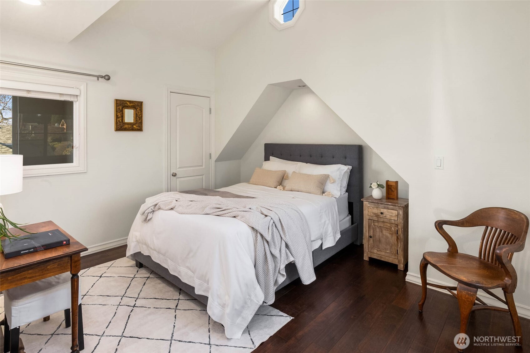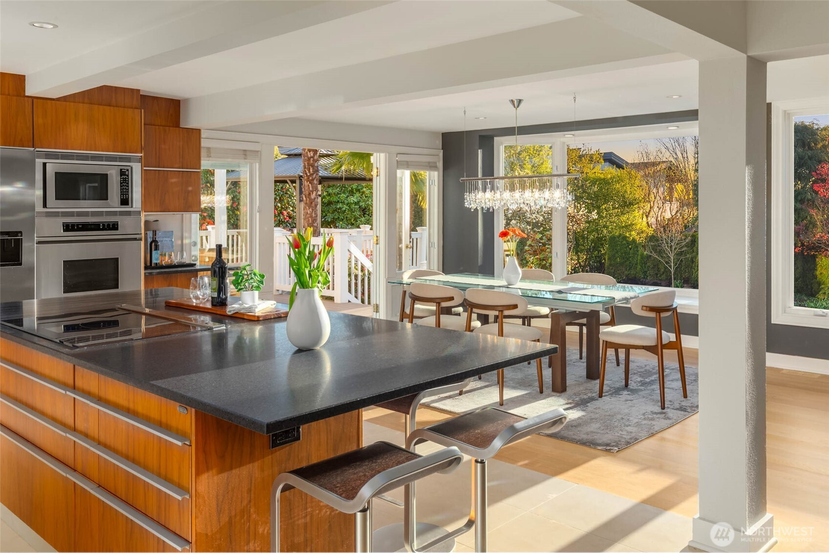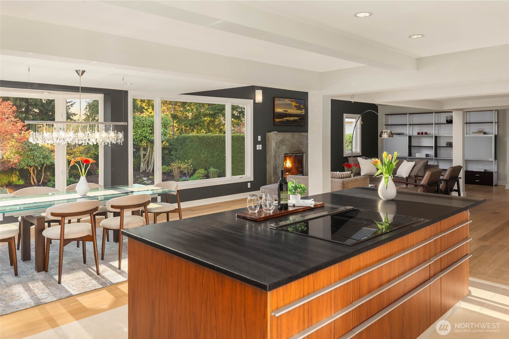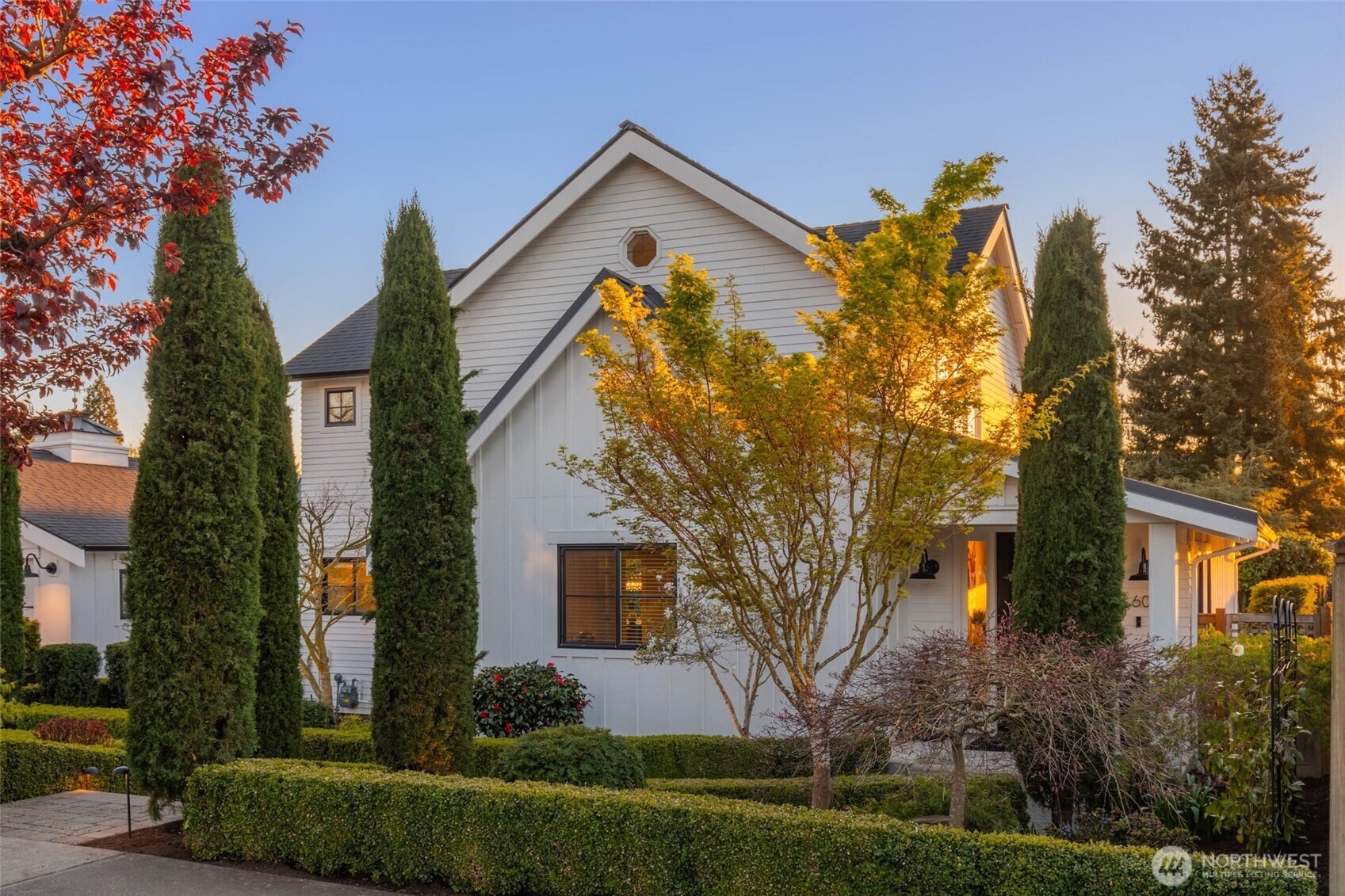 Exceptional Modern Farmhouse with a refined mid-century influence in the heart of Houghton. This 4 bed + office+ den and 2.5 bath home offers sophisticated living and effortless entertaining. The Danish-designed chef’s kitchen features oversized single-slab granite countertops, stainless steel appliances, and an induction cooktop. Radiant heated tile floors warm the kitchen and entry, while solid white oak hardwoods add warmth throughout. Expansive windows fill the home with natural light.A spacious entertainment deck extends off the kitchen, creating seamless indoor-outdoor living surrounded palm trees and a yard with lush greenery for ultimate privacy.The primary suite is a serene retreat with a spa-inspired bath, California Closets, and a private view deck showcasing stunning sunsets, mountain and city views. Daylight basement with separate entrance offers flexibility for guest suite, office, or potential apartment.Set on a rare 12,500 SF level, professionally landscaped, fully fenced and irrigated lot with mature landscaping, landscape lighting, flat lawn (room for sport court or pool), and tranquil waterfall.Generator ready, 2- car garage + 3-car driveway. Minutes to Met Market, Starbucks, International School, Houghton Beach, and Cross Corridor. Easy access to Google, Microsoft & Amazon. Located in award-winning Lake WA School District.