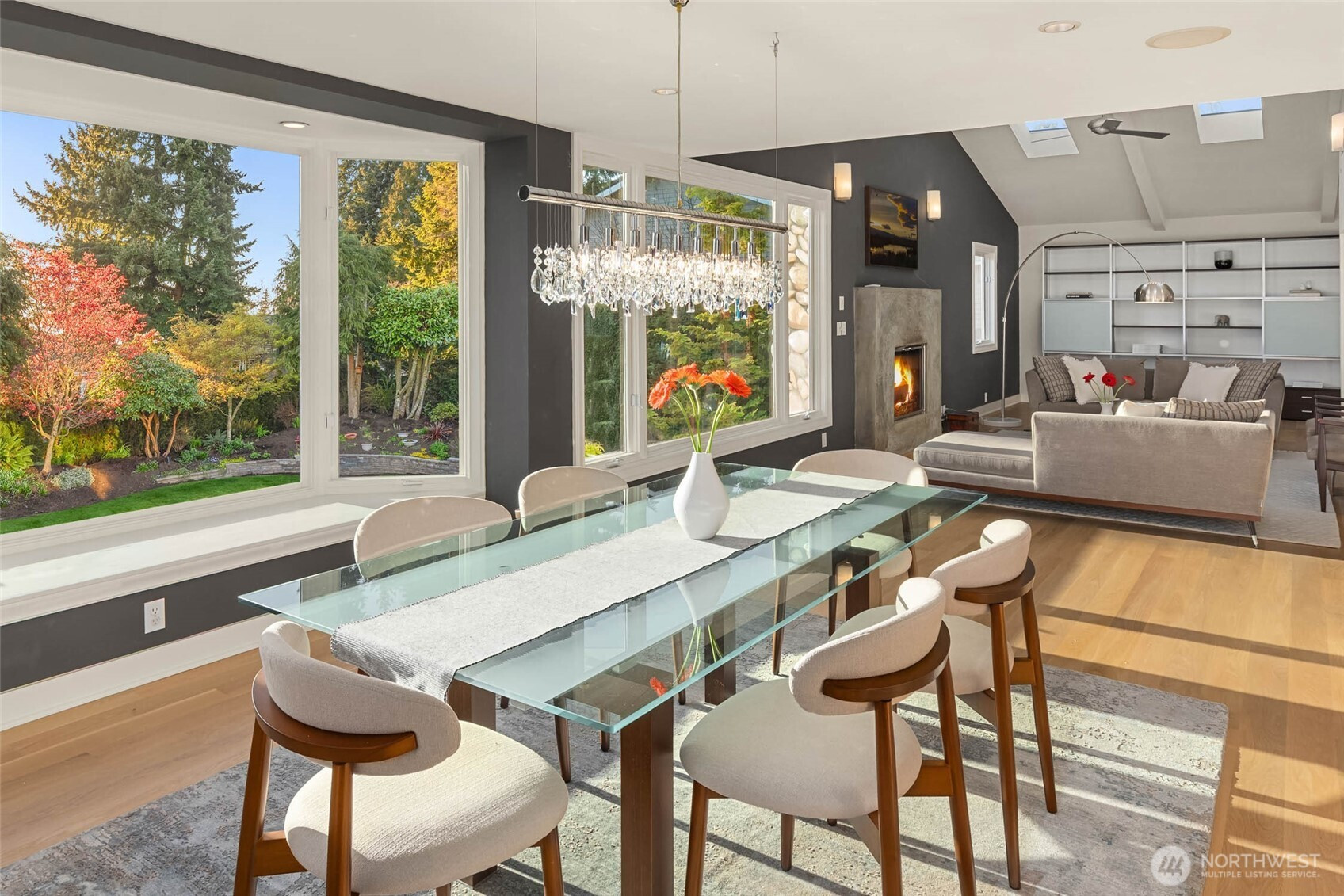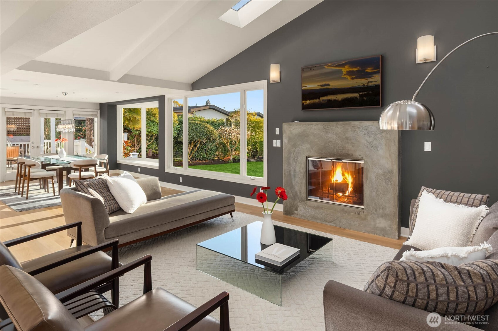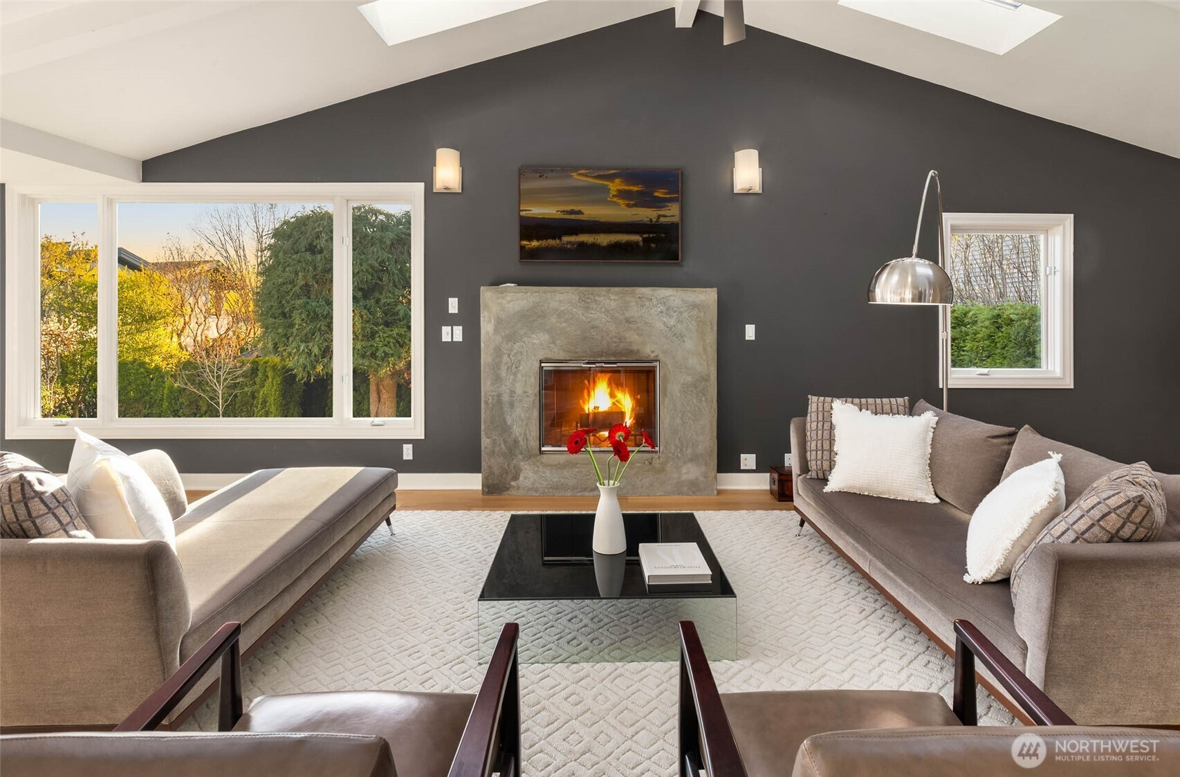 Exceptional Modern Farmhouse with a refined mid-century influence in the heart of Houghton. This 4 bed + office+ den and 2.5 bath home offers sophisticated living and effortless entertaining. The Danish-designed chef’s kitchen features oversized single-slab granite countertops, stainless steel appliances, and an induction cooktop. Radiant heated tile floors warm the kitchen and entry, while solid white oak hardwoods add warmth throughout. Expansive windows fill the home with natural light.A spacious entertainment deck extends off the kitchen, creating seamless indoor-outdoor living surrounded palm trees and a yard with lush greenery for ultimate privacy.The primary suite is a serene retreat with a spa-inspired bath, California Closets, and a private view deck showcasing stunning sunsets, mountain and city views. Daylight basement with separate entrance offers flexibility for guest suite, office, or potential apartment.Set on a rare 12,500 SF level, professionally landscaped, fully fenced and irrigated lot with mature landscaping, landscape lighting, flat lawn (room for sport court or pool), and tranquil waterfall.Generator ready, 2- car garage + 3-car driveway. Minutes to Met Market, Starbucks, International School, Houghton Beach, and Cross Corridor. Easy access to Google, Microsoft & Amazon. Located in award-winning Lake WA School District.