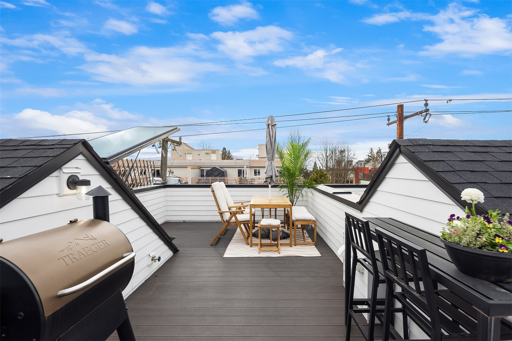Modern farmhouse style meets West Seattle convenience at this stunning and immaculate beautifully designed three-bedroom, two-and-a-half-bath townhome offering close to 1,400 square feet of light-filled living space. Open-concept main floor, quartz countertops, stainless appliances, gas range, and a farmhouse sink. Built in 2022, this home features contemporary finishes throughout, a top-floor primary suite with vaulted ceilings and a walk-in closet, and thoughtfully designed spaces including an expansive rooftop lounge with a $7K decking surface upgrade offering true indoor/outdoor living. Located just steps from Morgan Junction, you’re minutes from local shops, dining, and everyday conveniences. Easy access to Lincoln Park, public transit, and the beach, this home offers both lifestyle and long-term value. Enjoy low maintenance living, no HOA, and a dedicated parking space. Welcome home!