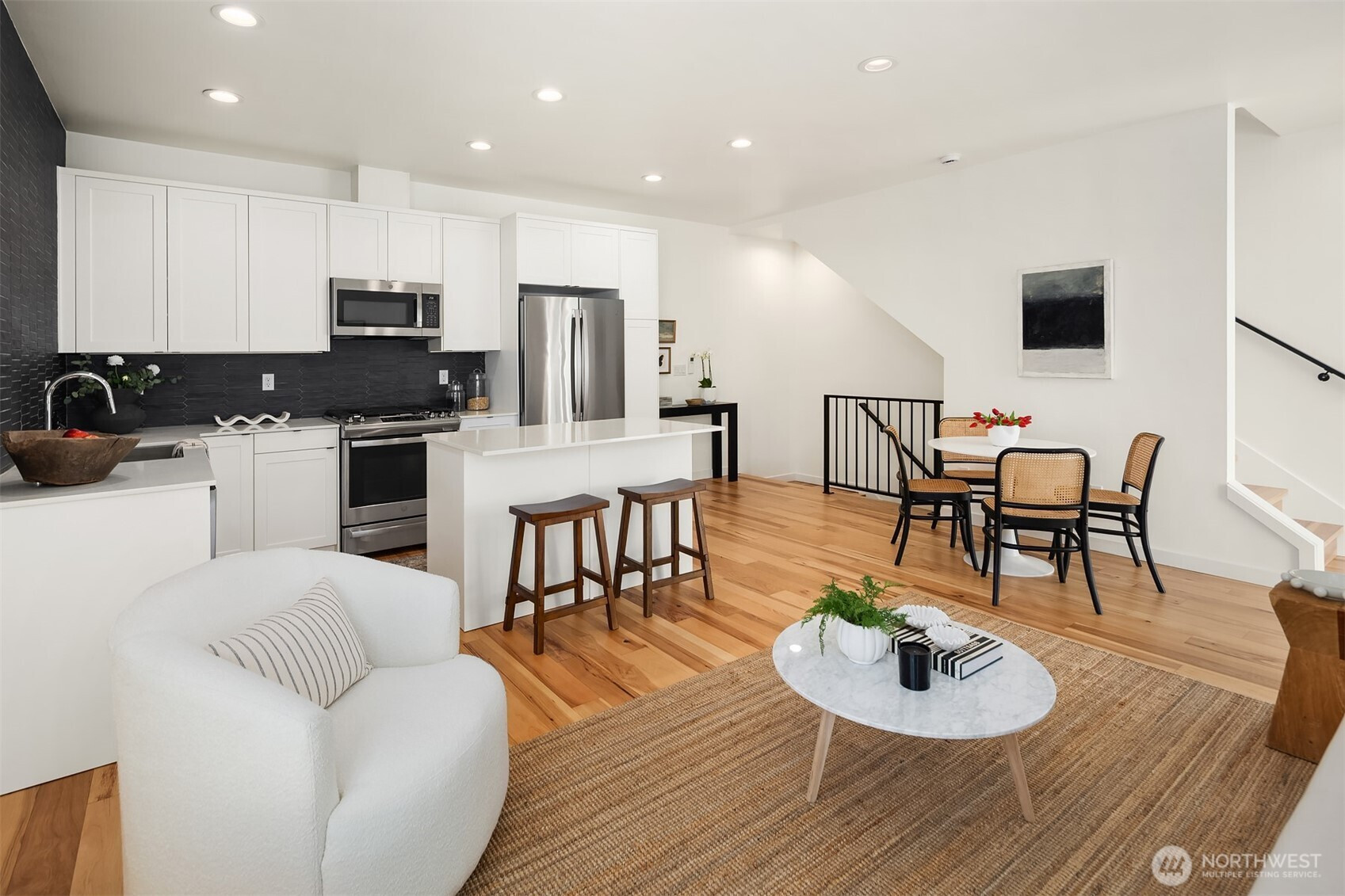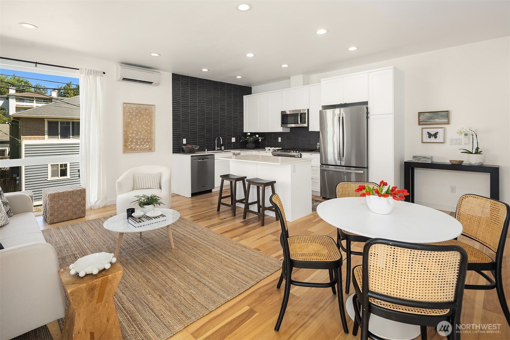 Better than new, this lightly lived-in 2021 contemporary will duly impress. Inspired design, where form & function unite to create a symphony of beguiling light-filled spaces, gallery walls & innumerable details of style & sophistication. High ceilings, rich hickory hardwoods, a fully appointed kitchen, garden-level guest/office space, modern baths, top-floor blissful primary, and sun-dappled rooftop deck with territorial and mountain vistas. Washer + dryer, great storage, and a dedicated parking spot all in a superior location. Minutes to the Mogan and Alaska junctions, shops, parks, beaches, public transportation, and easy access to the West Seattle bridge make this a home of enviable livability.