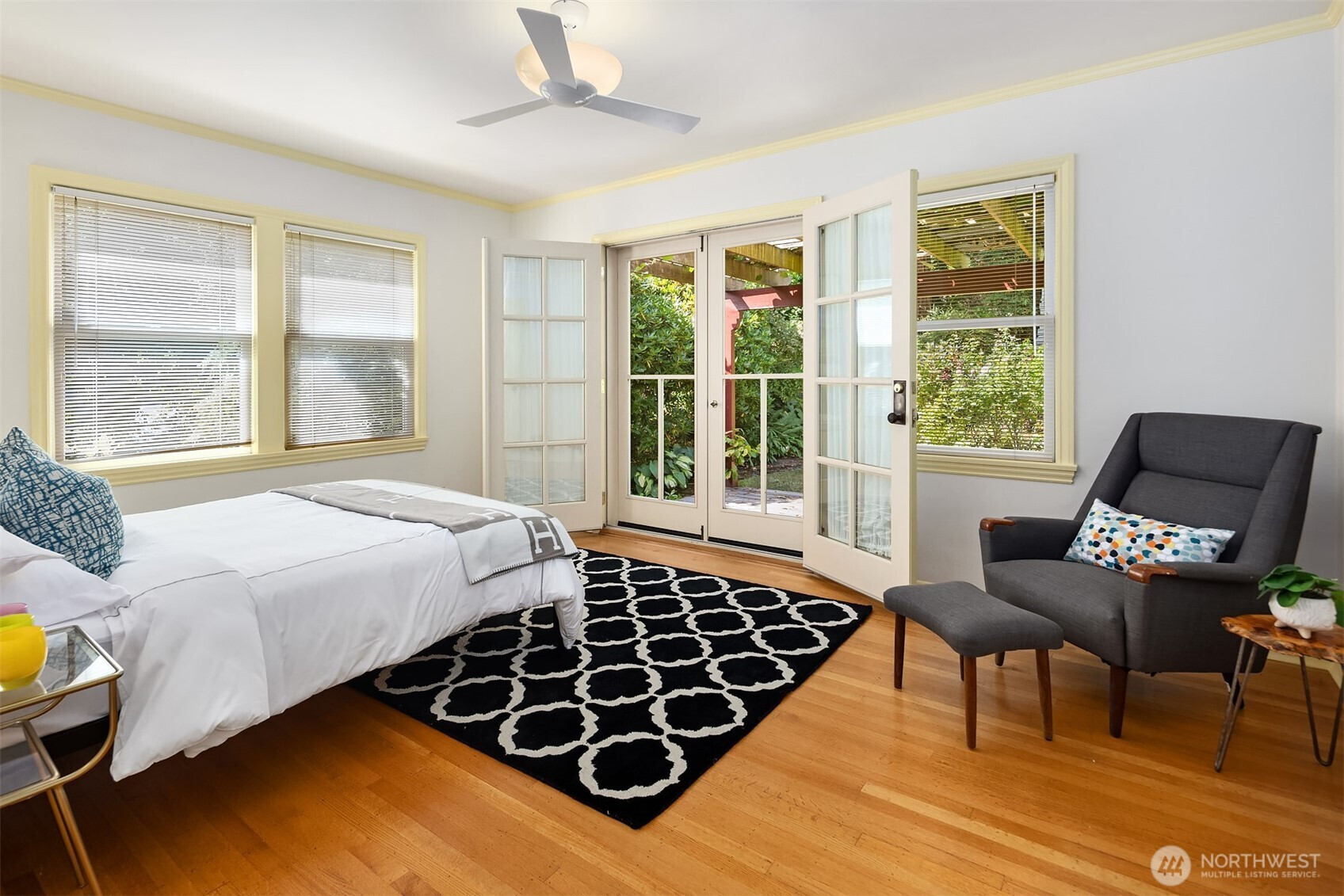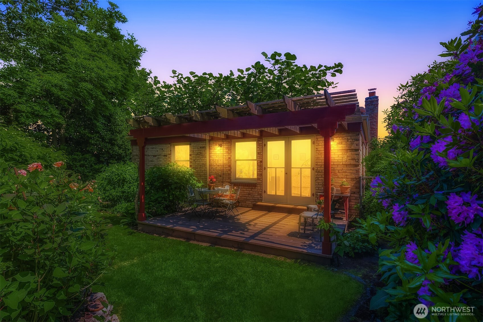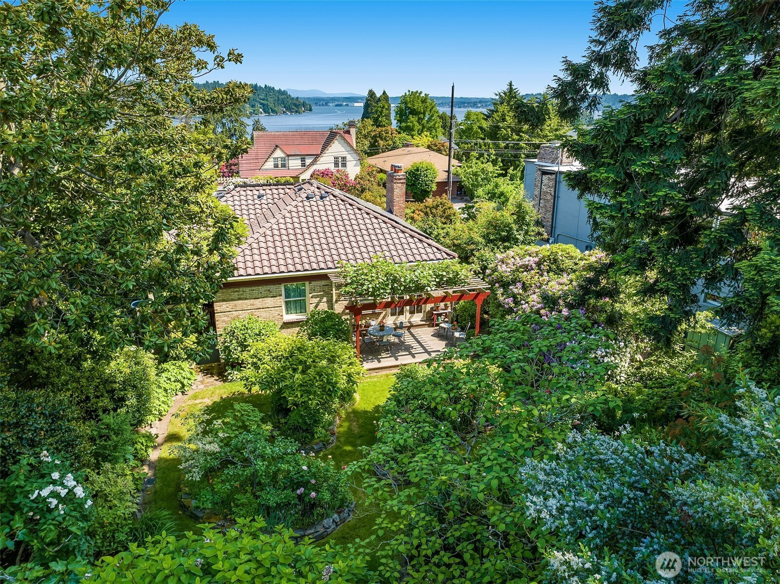 Impeccably maintained and thoughtfully upgraded, this residence captures sweeping vistas and offers effortless proximity to Lake Washington and Seward Park. Outfitted with a fully integrated solar system, heat pump, HVAC, backup furnace, and timeless Spanish tile roof. The lush, irrigated grounds are a year-round jewel, with an automated system keeping the gardens vibrant. Two serene bedrooms and a full bath on the main floor include a sunlit primary retreat that opens to flourishing organic gardens of apples, blueberries, and roses—an enchanting setting of beauty and privacy. The lower level offers a cozy fireside media lounge, guest suite, ¾ bath, and abundant storage. This is a rare chance to own an extraordinary urban sanctuary!