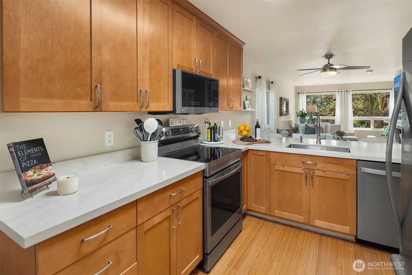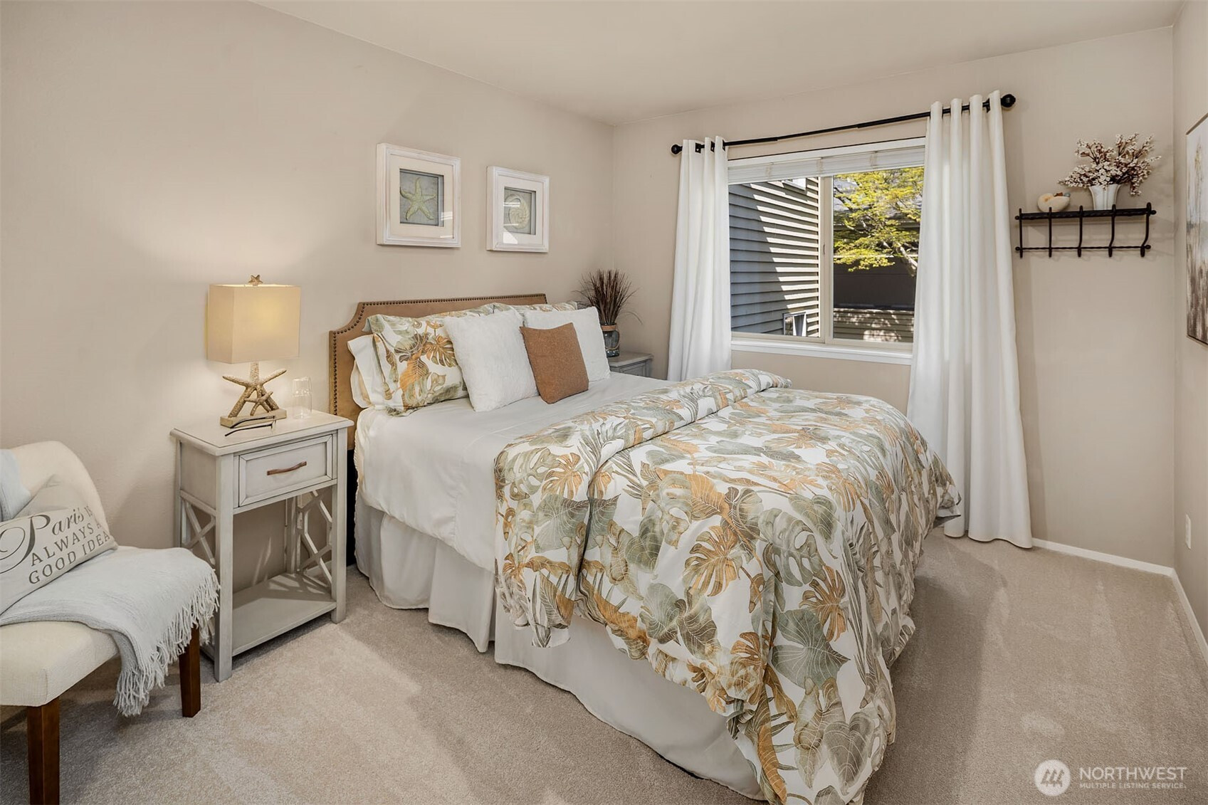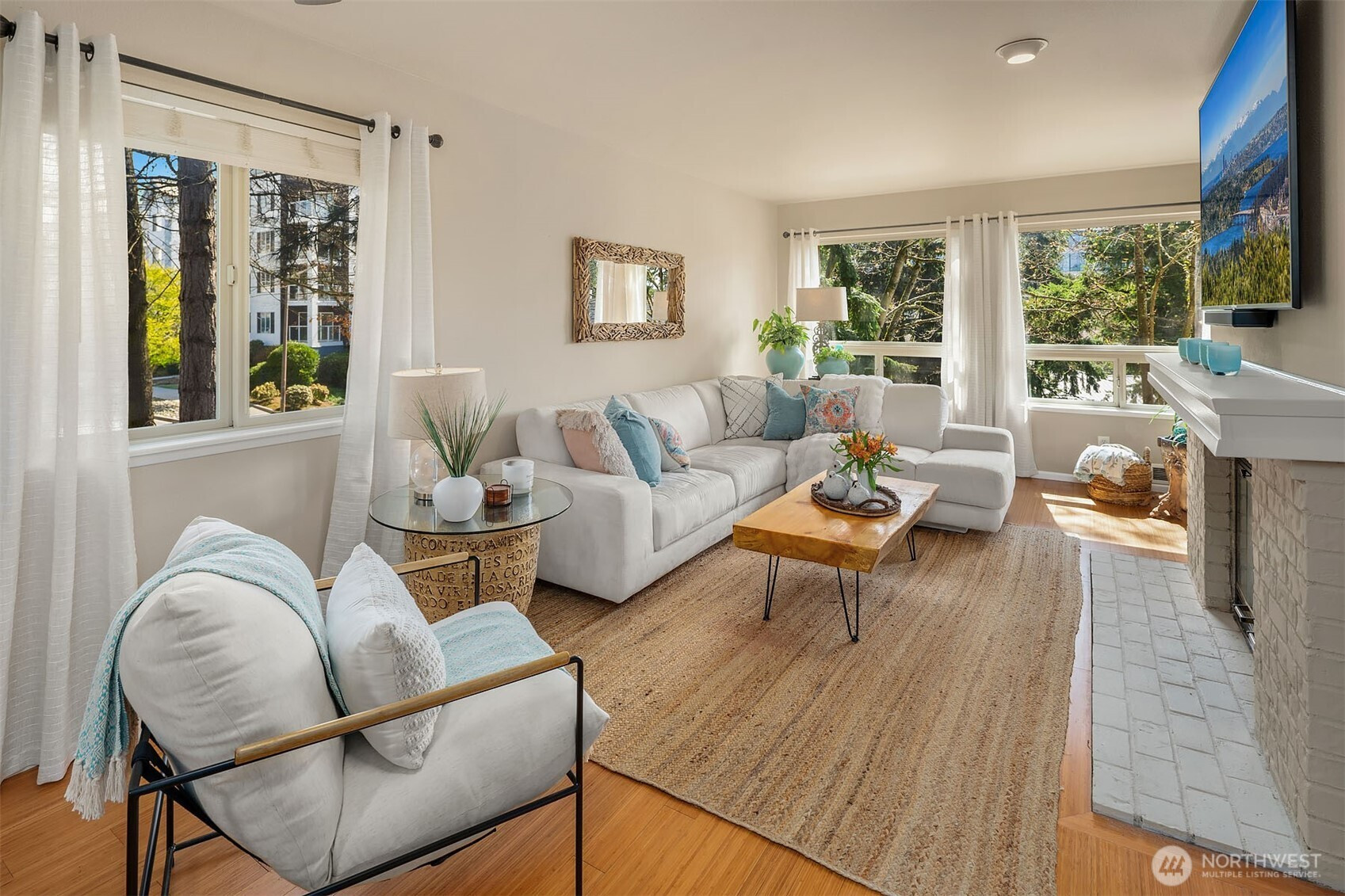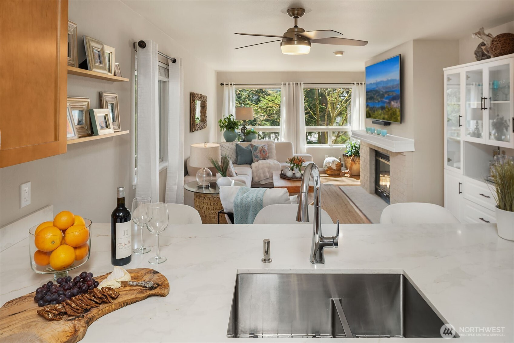 Downtown Kirkland living at its best. Just steps to the waterfront, Kirkland Urban, PCC, parks, shops, restaurants, and transit, this home offers the best of city living with a relaxed neighborhood feel. This 2-bedroom offers a thoughtful layout so you can simply enjoy the easy lifestyle. End-unit home with windows on 4 sides. Open-concept living areas are bathed in natural light, the over-sized living room offers a cozy fireplace & access to the private deck w/the chef’s kitchen as the star of the show in the middle w/new quartz countertops, SS appliances & bar seating that invites connection. The generous primary suite includes patio access, a walk-in closet with built-ins, and a beautifully remodeled 4-piece ensuite. The second bedroom also offers a walk-in closet. New carpets in both BDR’s, updated guest bath & lots of storage complete this move-in-ready home. Rental cap has not been met so investors welcome. Nestled just blocks from the Google campus, enjoy convenient access to 405 and Eastside tech hubs. Affordable luxury awaits!