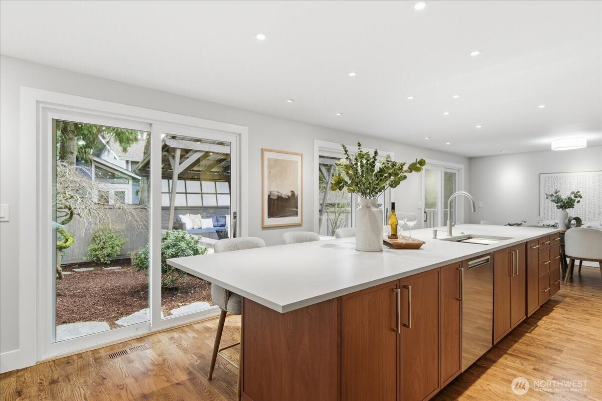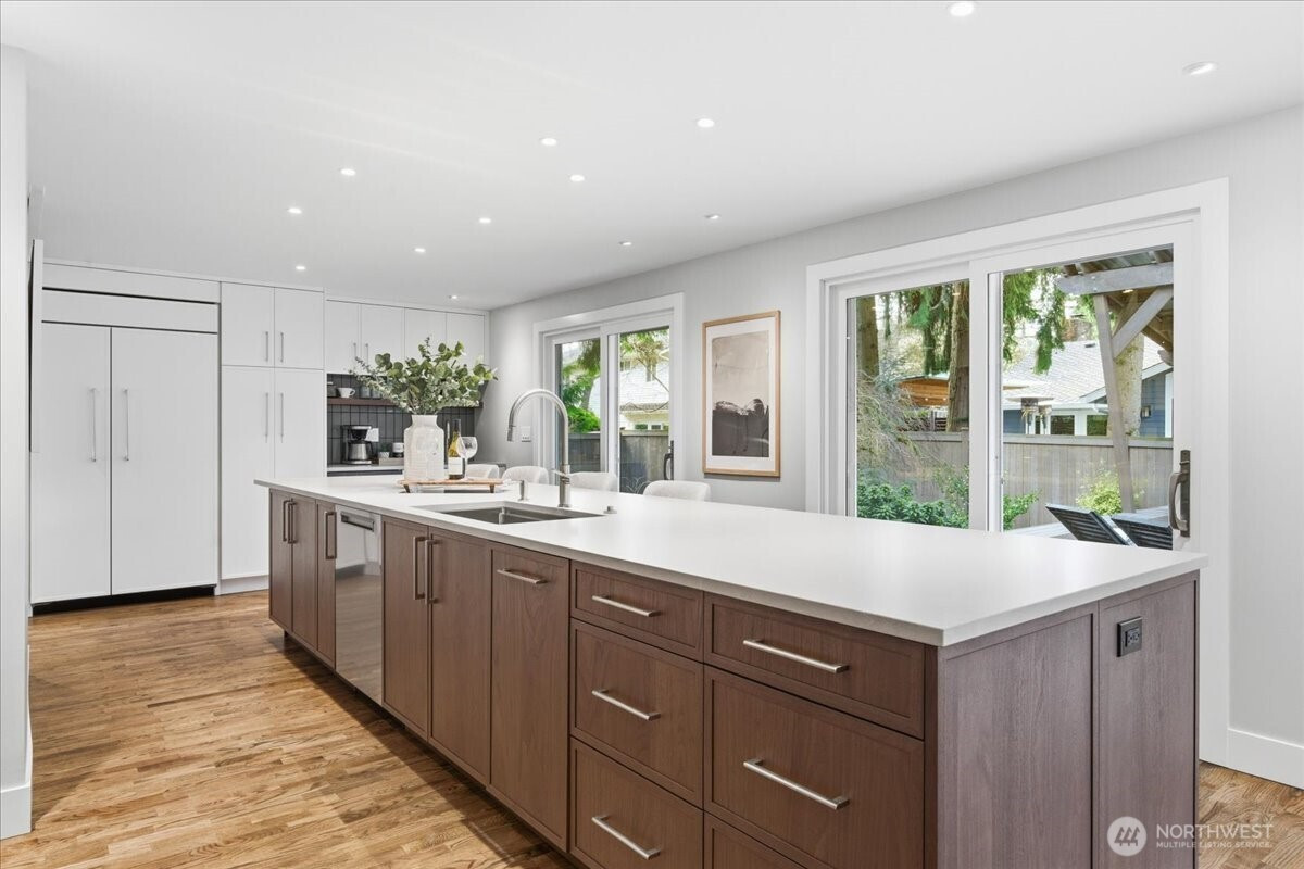 (503) 893-8874Stunning classic home on a quiet cul-de-sac in the heart of Mercer Island. A comprehensive architect-designed remodel in collaboration with Mutuus Studio, paired with professionally designed outdoor spaces by WEdesign Landscape Architects, makes this home a rare find. The dream kitchen anchors the home with a 15-foot honed quartz island, AGA range, Sub-Zero refrigerator, Miele speed oven, and built-in coffee station. Three sets of sliders open to the backyard, blending indoor and outdoor living while filling the home with natural light. Updates include all new windows, walnut-stained hardwoods, designer paint, and Ann Sacks tile accents. Enjoy an entertainment-sized deck with partial cover, a large flat lawn, and a fully fenced yard for privacy and play. Upstairs offers five bedrooms, including an expansive primary suite with walk-in closet and large shower. The basement features a spacious yet cozy family room with gas fireplace, plus a half bath and laundry. Additional highlights include a two-car garage with built-in storage and an attached workshop. Just a short stroll to Starbucks, QFC, and local restaurants; 10 minutes to Pioneer Park for off-leash dog adventures; and 20 minutes via a hidden path to Groveland Beach for summer swims or watching the Blue Angels.