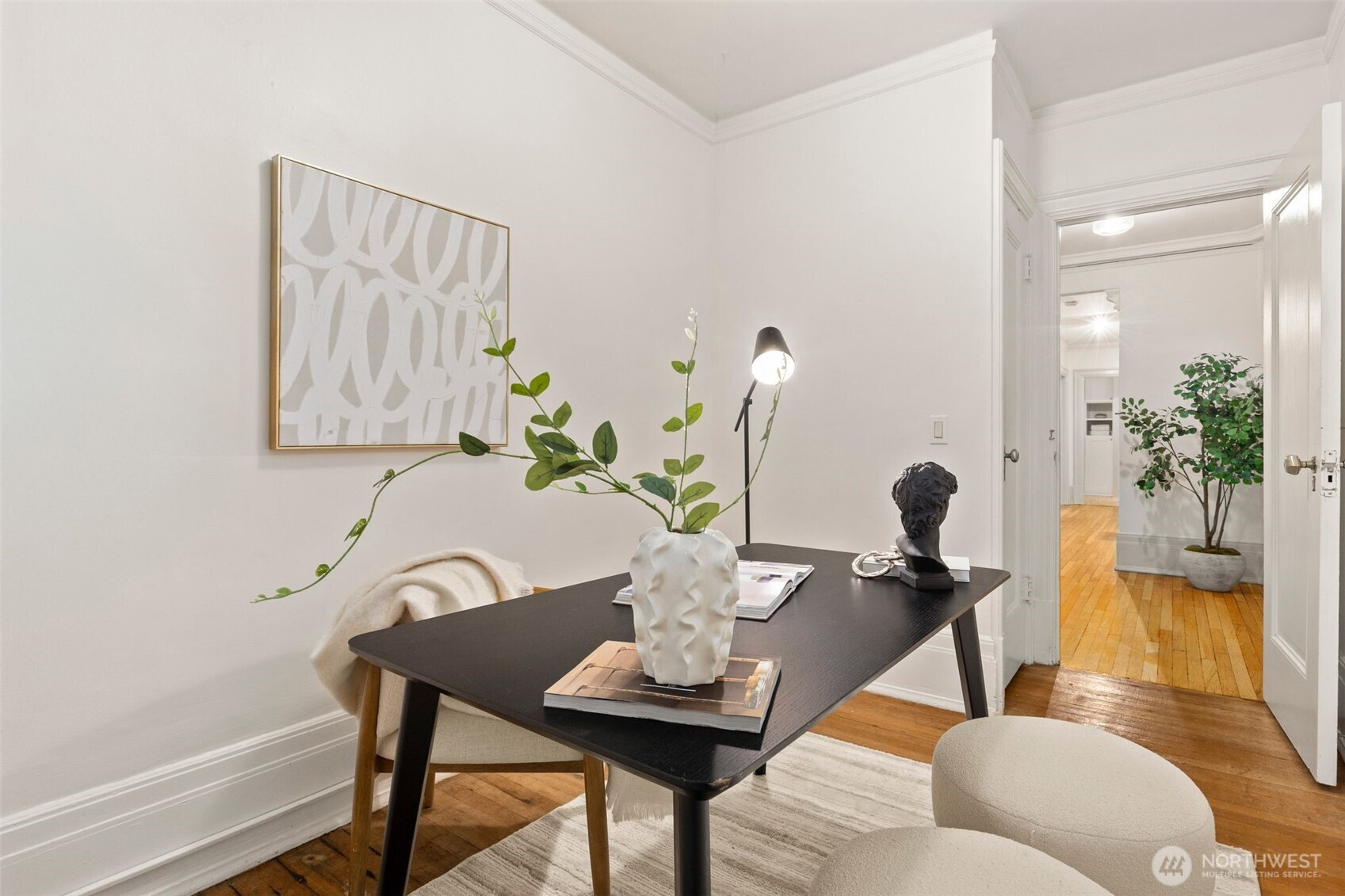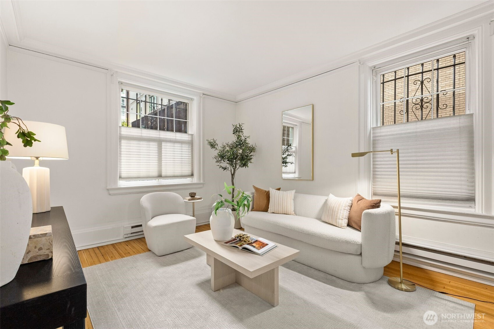 Step into a rare piece of Seattle’s past at Old Colony Condominiums, where timeless elegance meets modern living. Built in 1909, this expansive 1,050 -square-foot residence showcases the craftsmanship of a bygone era—soaring 9.5-foot ceilings, dramatic 12-inch baseboards, intricate molding, original oak floors, and beautifully preserved solid wood pocket doors. Designed for both everyday comfort and memorable gatherings, the generous living room flows into a formal dining space ideal for entertaining. The thoughtfully updated kitchen adds modern convenience with a gas cooktop, while the rest of the home offers two serene bedrooms, an updated bath, in-unit washer and dryer, double-paned windows, and abundant storage throughout. Perfectly positioned near vibrant eateries, boutique shops, theaters, museums, Seattle University, and major hospitals (Harborview, Swedish & Virginia Mason), this historic gem also offers effortless access to public transportation and main arterials. A home with soul, scale, and story—this is Seattle living at its most authentic.