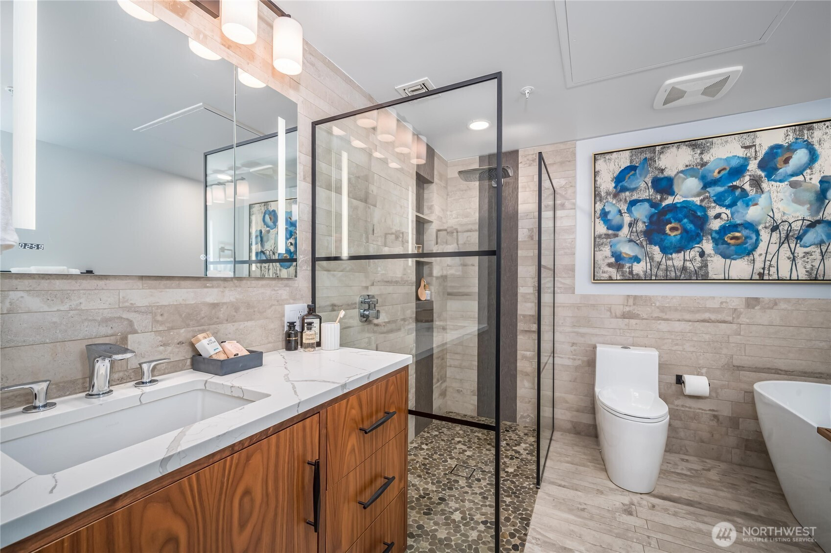 Strategically updated with three fully remodeled bathrooms, this two-story condo offers a detail-led retreat in the heart of Capitol Hill. The renovation was executed holistically, with reconfigured layouts, upgraded plumbing and electrical, and custom millwork throughout. Ten-foot ceilings and floor-to-ceiling windows frame the main living space with city views. The expanded primary suite features a custom walnut floor-to-ceiling closet system, private balcony, and a fully rebuilt bath with double vanity, curbless shower, and freestanding soaking tub. Additional highlights include custom pantry storage, architectural lighting, a rooftop deck, and two parking spaces. Blocks to light rail, grocery, downtown, and Capitol Hill dining.