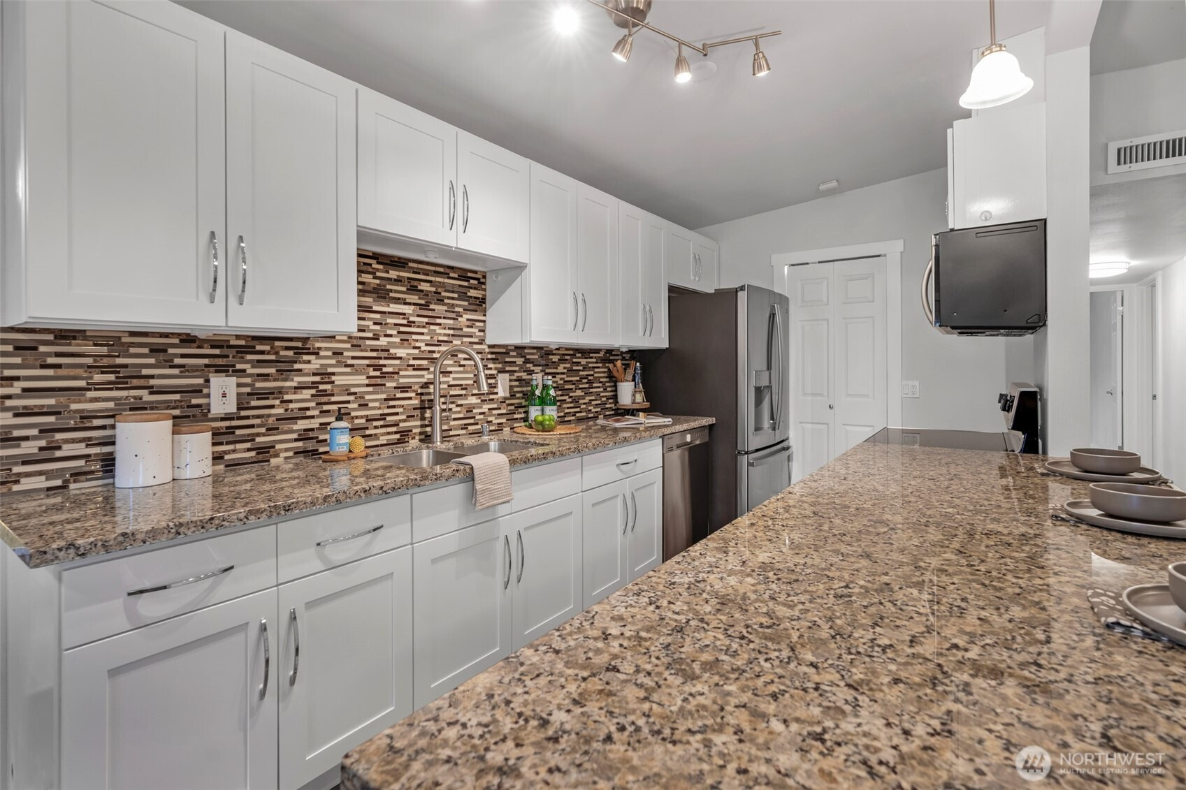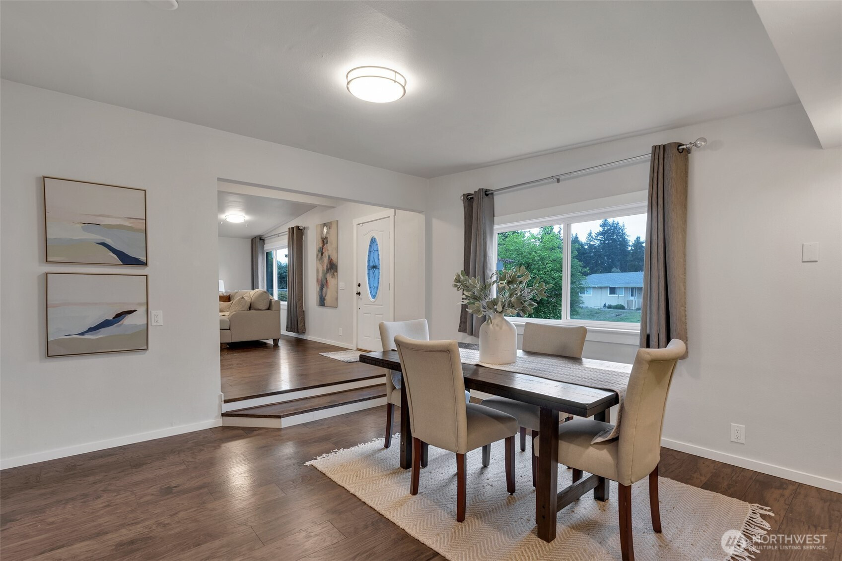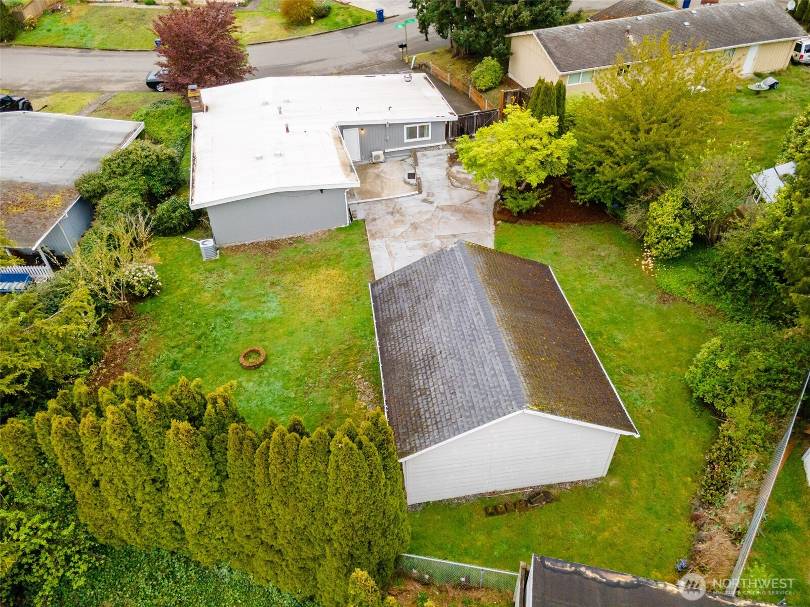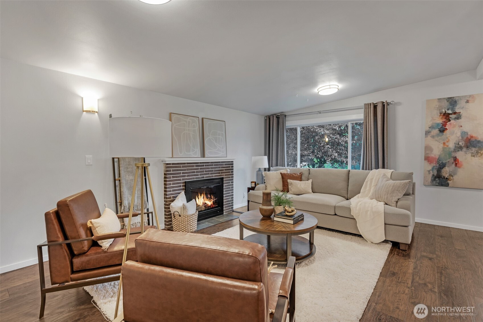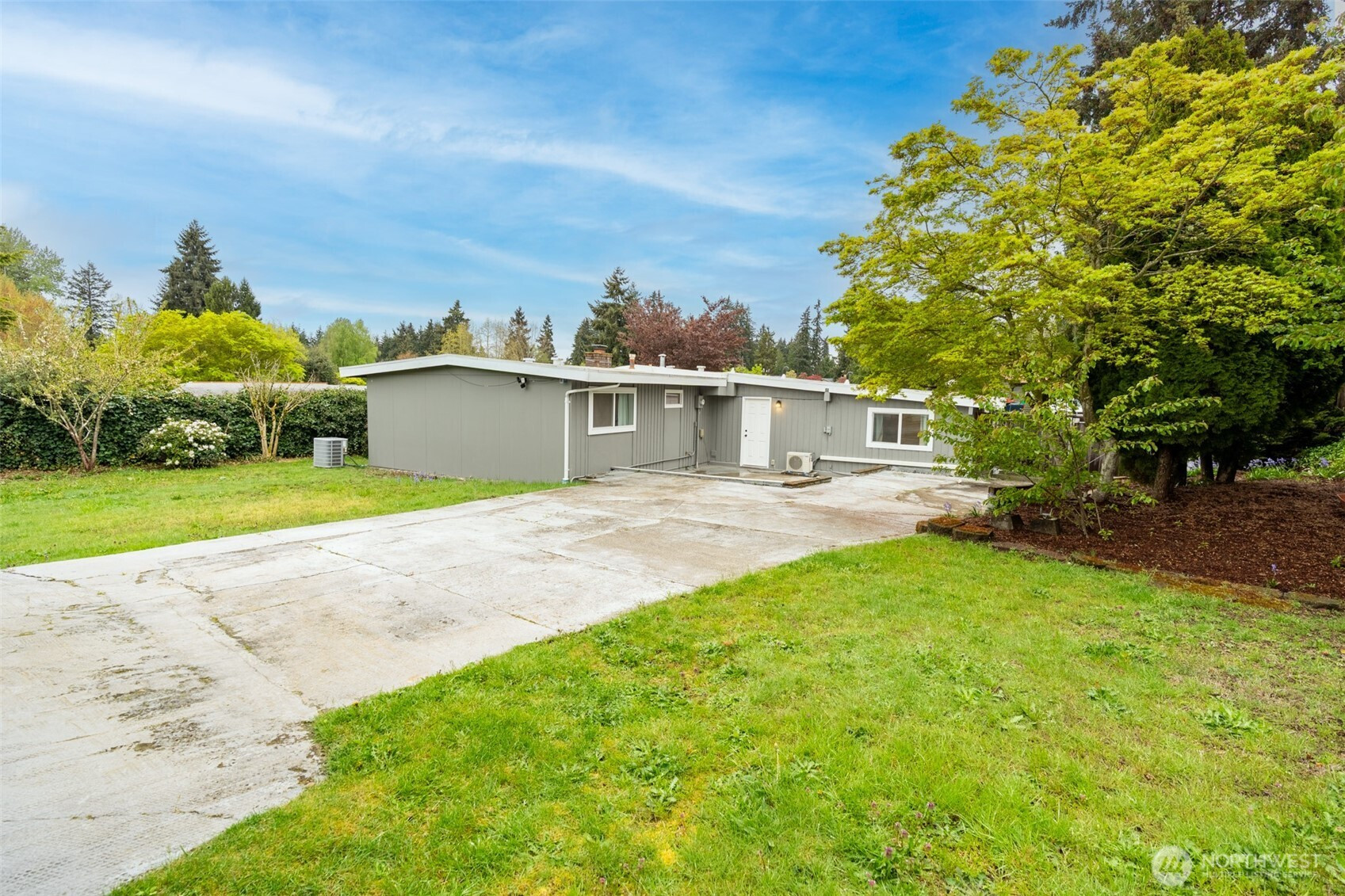 Charming, well-maintained turn-key rambler in the heart of Federal Way! Inviting living room with vaulted ceilings and cozy brick-surround fireplace. Thoughtful layout offers seamless flow between two living areas, dining, and kitchen-ideal for everyday living and entertaining. Kitchen features quartz counters, tile backsplash, white cabinetry, stainless appliances, pantry, peninsula with eating bar, and newer fridge. Primary suite includes a spacious closet, updated ¾ bath, and new mini-split. Three additional bedrooms and full bath complete the home. Enjoy year-round comfort with A/C. Updates include newer water heater and exterior paint (2–3 yrs). Spacious dual-level patio is perfect for entertaining or relaxing by the fire pit. Mature landscaping provides a private backyard setting. Large driveway plus detached two-car garage with potential shop space. Prime location near shopping, parks, and the new light rail station!