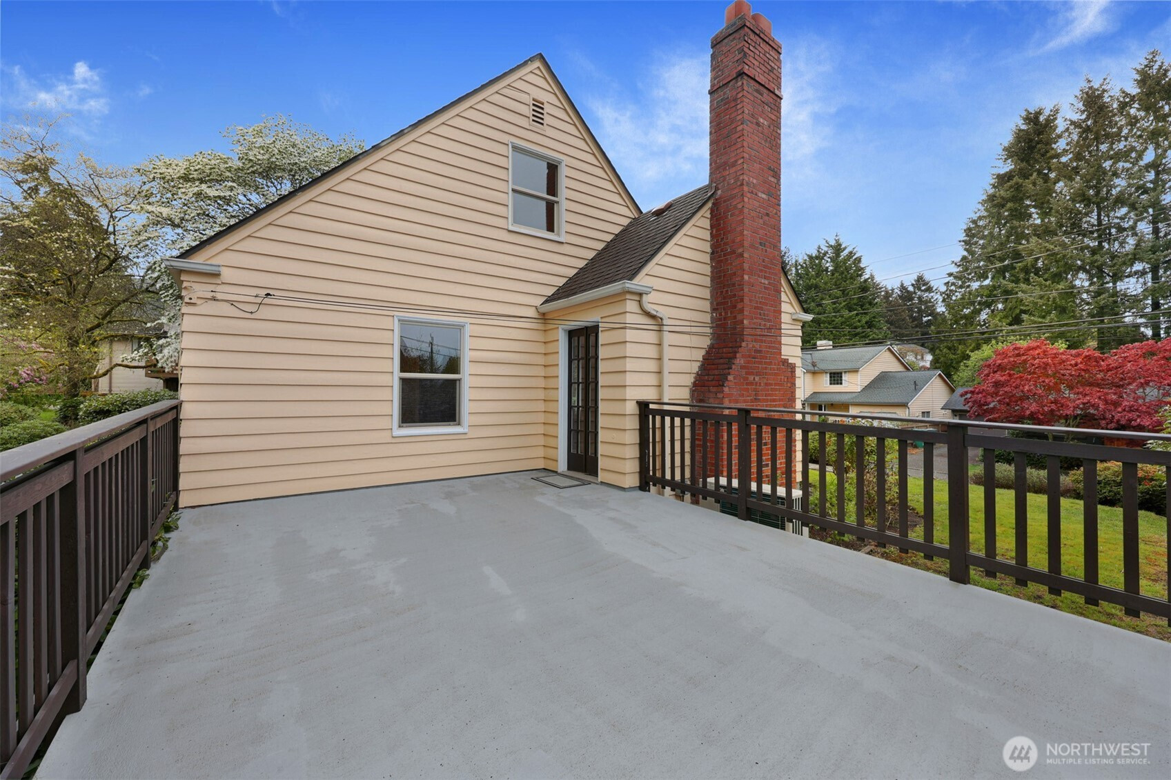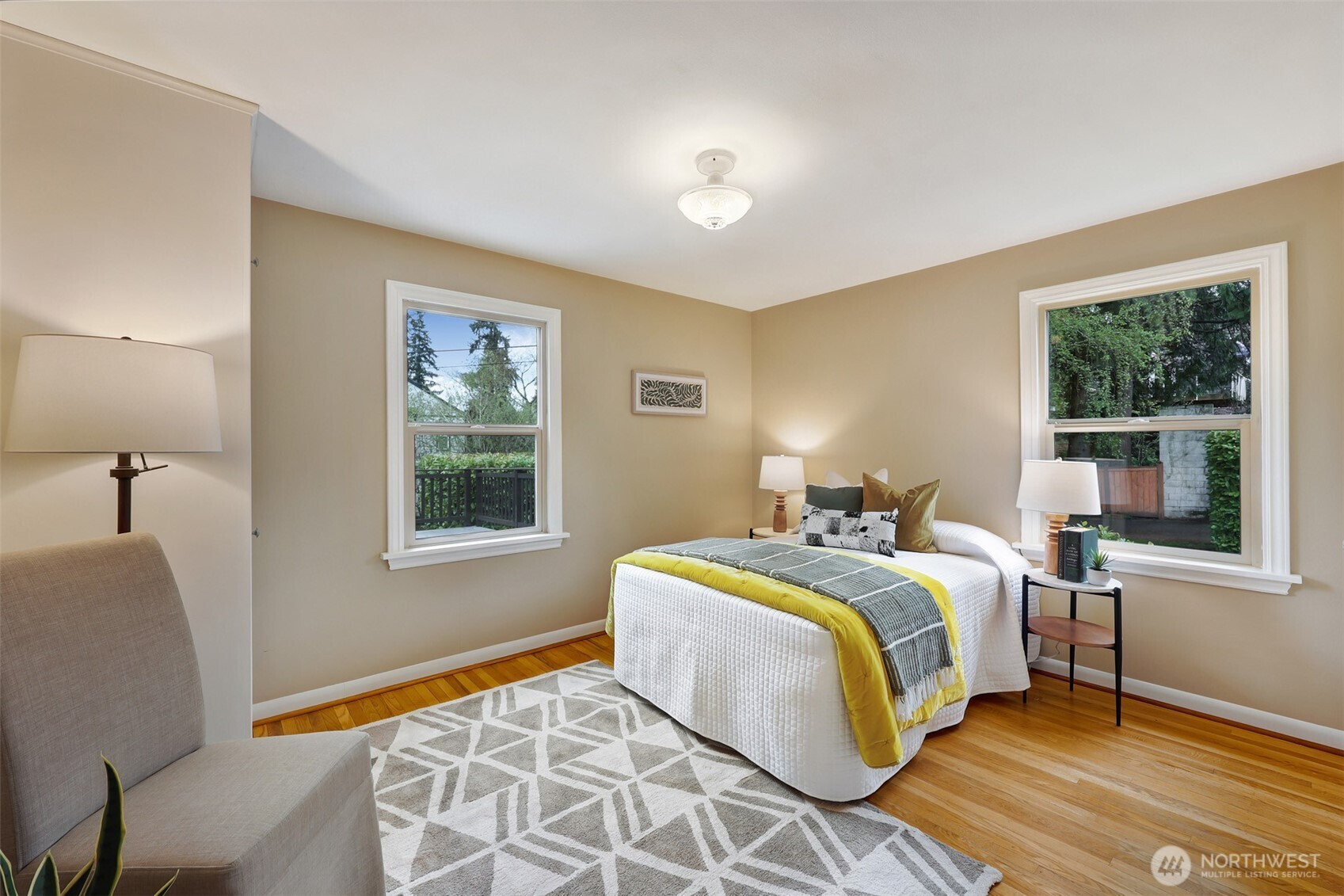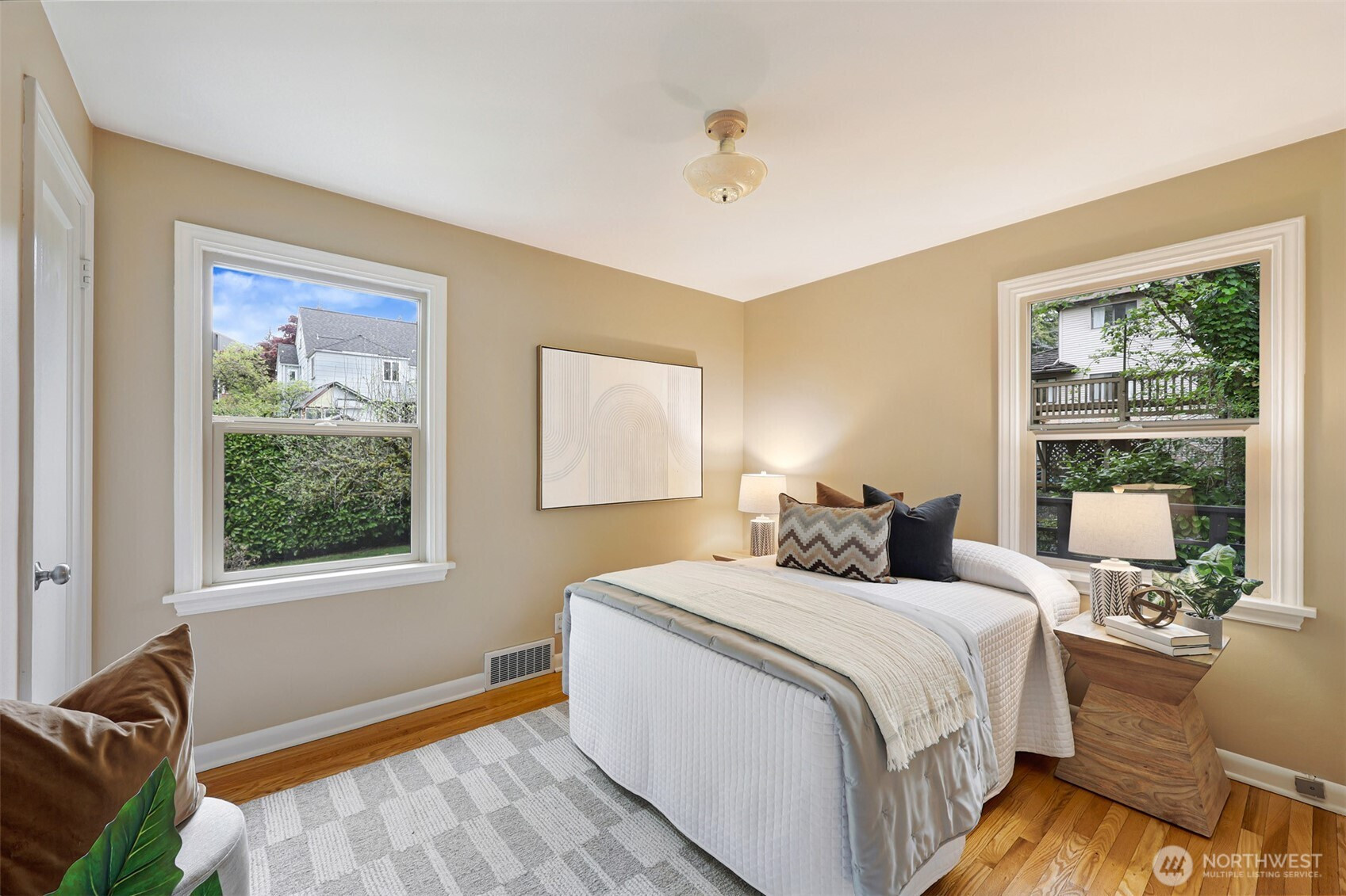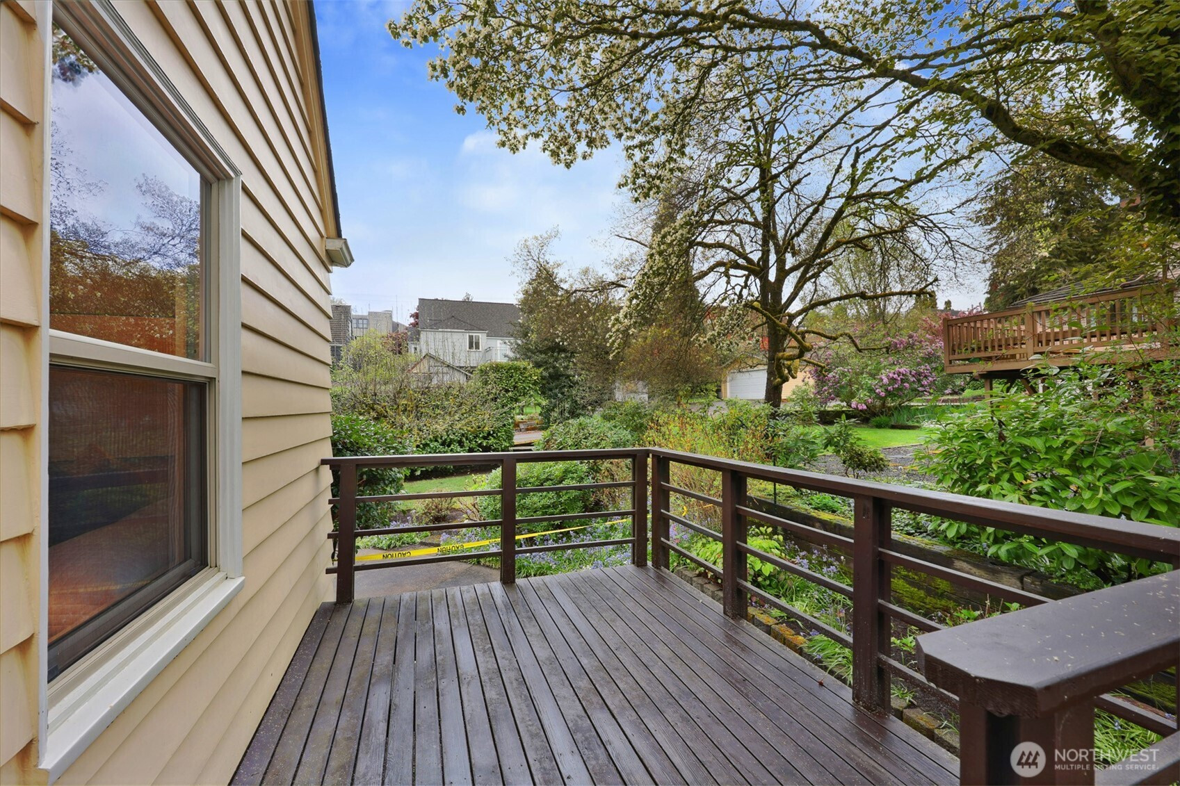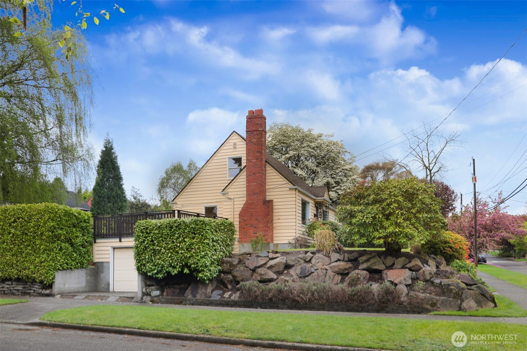 Updated copy per seller requests: Thoughtfully maintained Bryant home situated on a corner lot with elegant, mature landscaping. A gracious living room bathed in natural light and featuring a fireplace and hardwoods welcomes you at the front door. Chefs will love the newly updated kitchen with all new appliances and cabinets. Entertainers will enjoy the dining room adjoining the kitchen and living room, as well as the two outdoor decks for year-round pleasure. The first, accessible right off the kitchen's breakfast nook, offers ample shade for outdoor relaxation. The second is a south-facing rooftop deck off the living room, ideal for enjoying sunny PNW days. Two bedrooms and a full bath are on the main level. Upstairs features a newly updated primary bedroom with an ensuite bath. Lower level flex room, laundry area, non-conforming fourth bedroom, storage space, and a large attached garage. New heat pump HVAC system with central heat and AC. Ideally located on a quiet residential street near popular amenities, including University Village, PCC, Bryant Playground Park, and more. Welcome home!