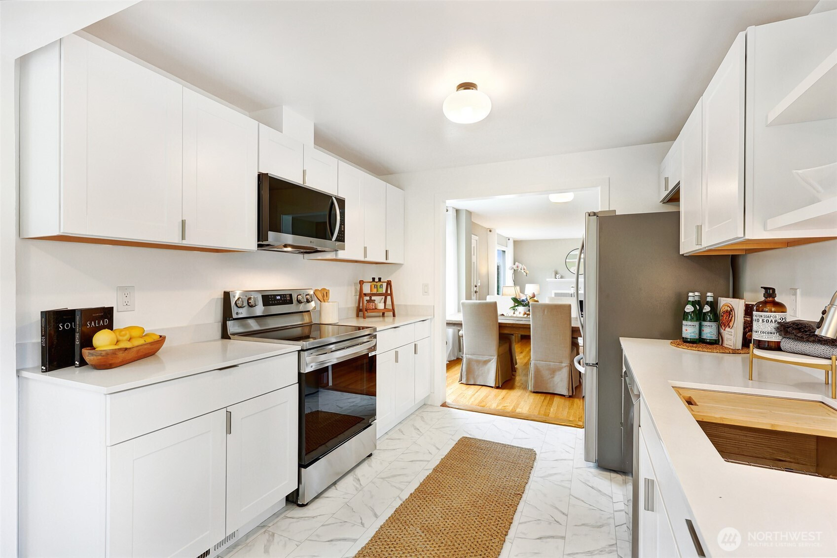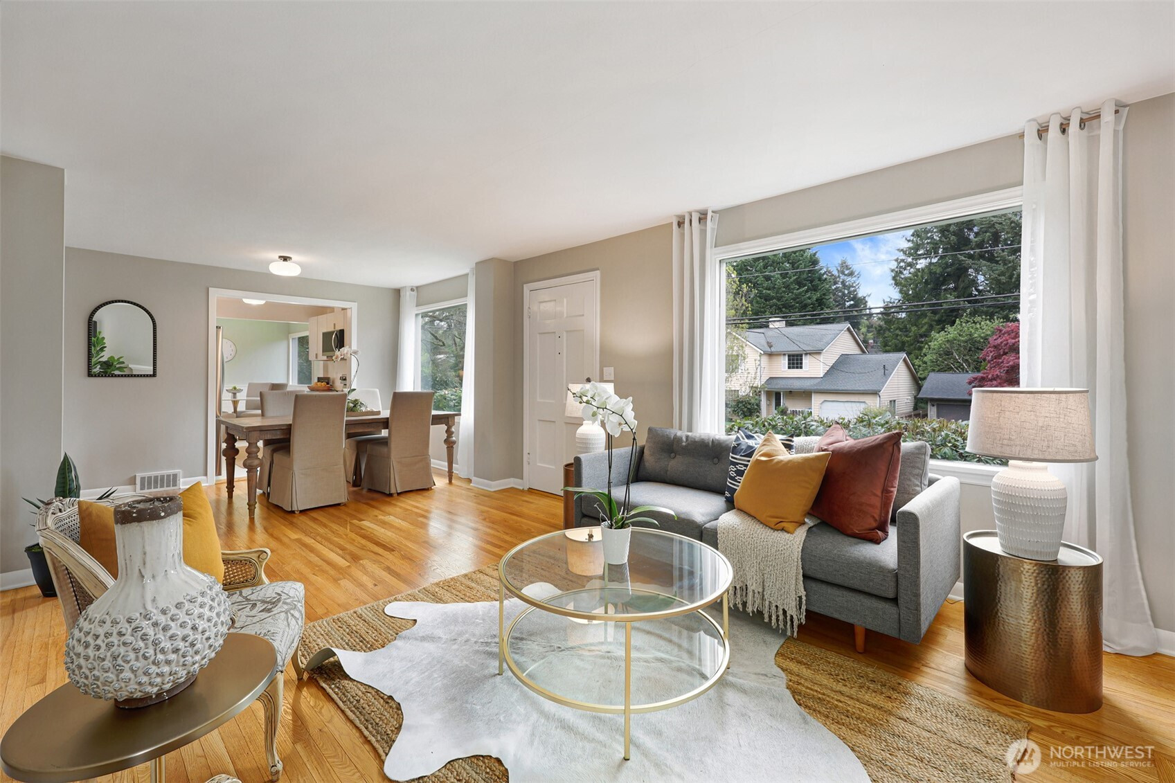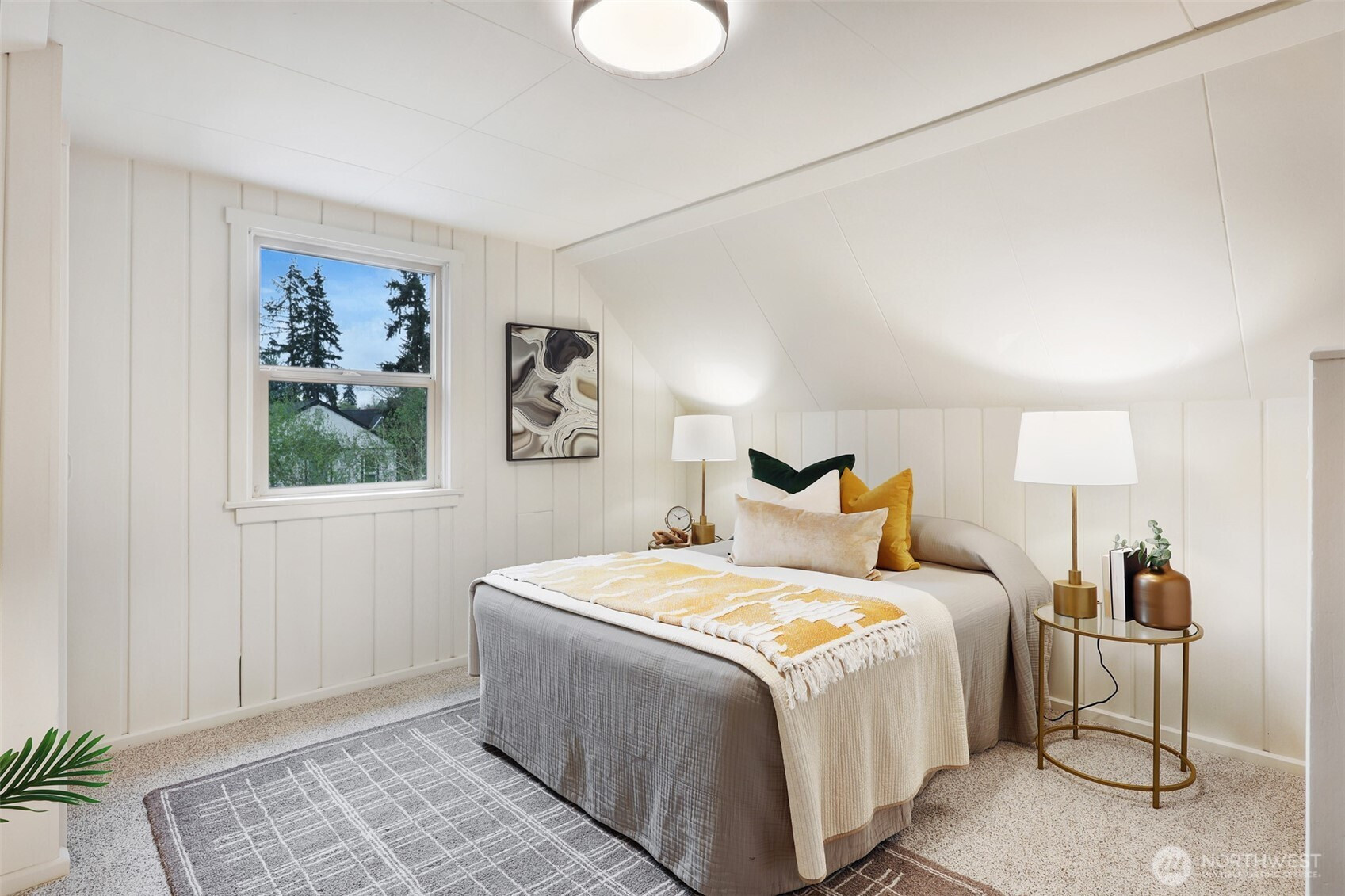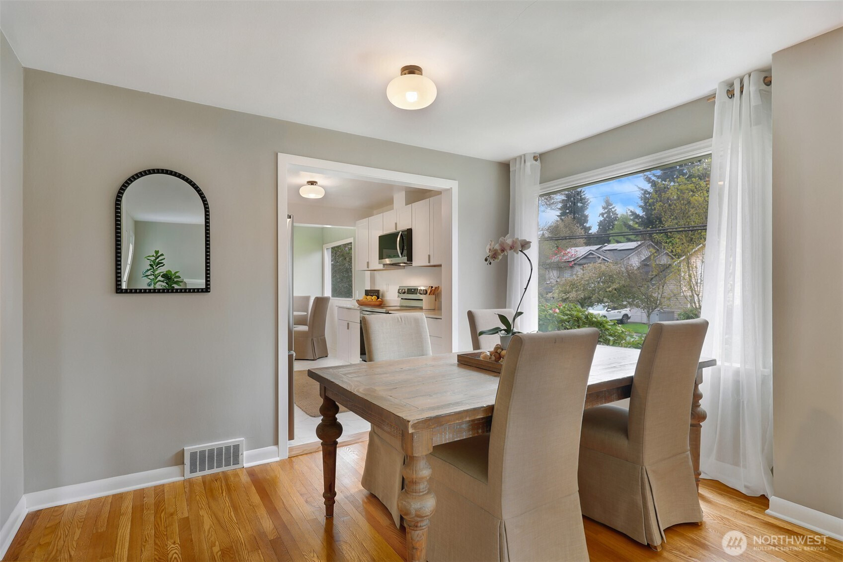 Updated copy per seller requests: Thoughtfully maintained Bryant home situated on a corner lot with elegant, mature landscaping. A gracious living room bathed in natural light and featuring a fireplace and hardwoods welcomes you at the front door. Chefs will love the newly updated kitchen with all new appliances and cabinets. Entertainers will enjoy the dining room adjoining the kitchen and living room, as well as the two outdoor decks for year-round pleasure. The first, accessible right off the kitchen's breakfast nook, offers ample shade for outdoor relaxation. The second is a south-facing rooftop deck off the living room, ideal for enjoying sunny PNW days. Two bedrooms and a full bath are on the main level. Upstairs features a newly updated primary bedroom with an ensuite bath. Lower level flex room, laundry area, non-conforming fourth bedroom, storage space, and a large attached garage. New heat pump HVAC system with central heat and AC. Ideally located on a quiet residential street near popular amenities, including University Village, PCC, Bryant Playground Park, and more. Welcome home!