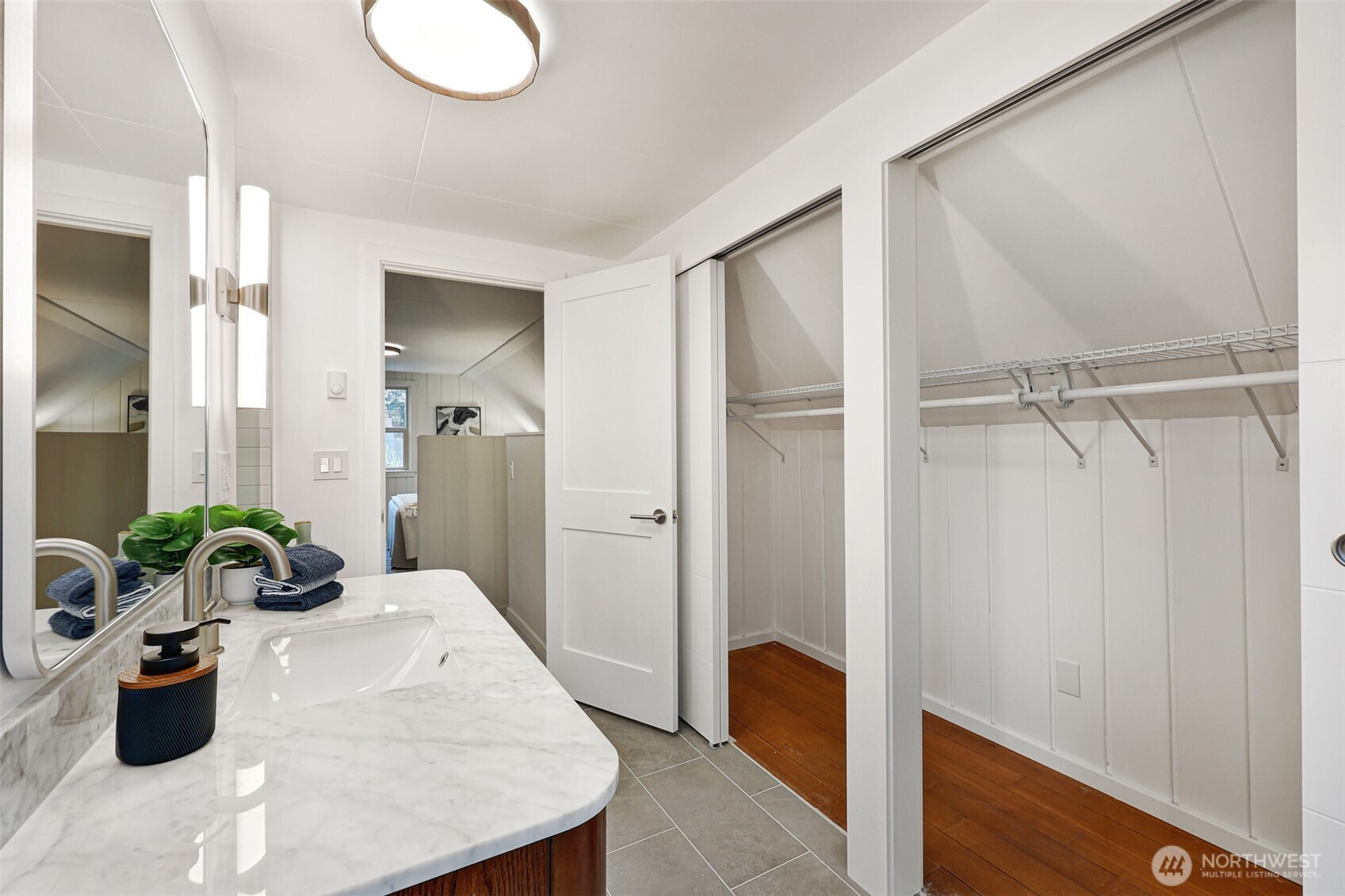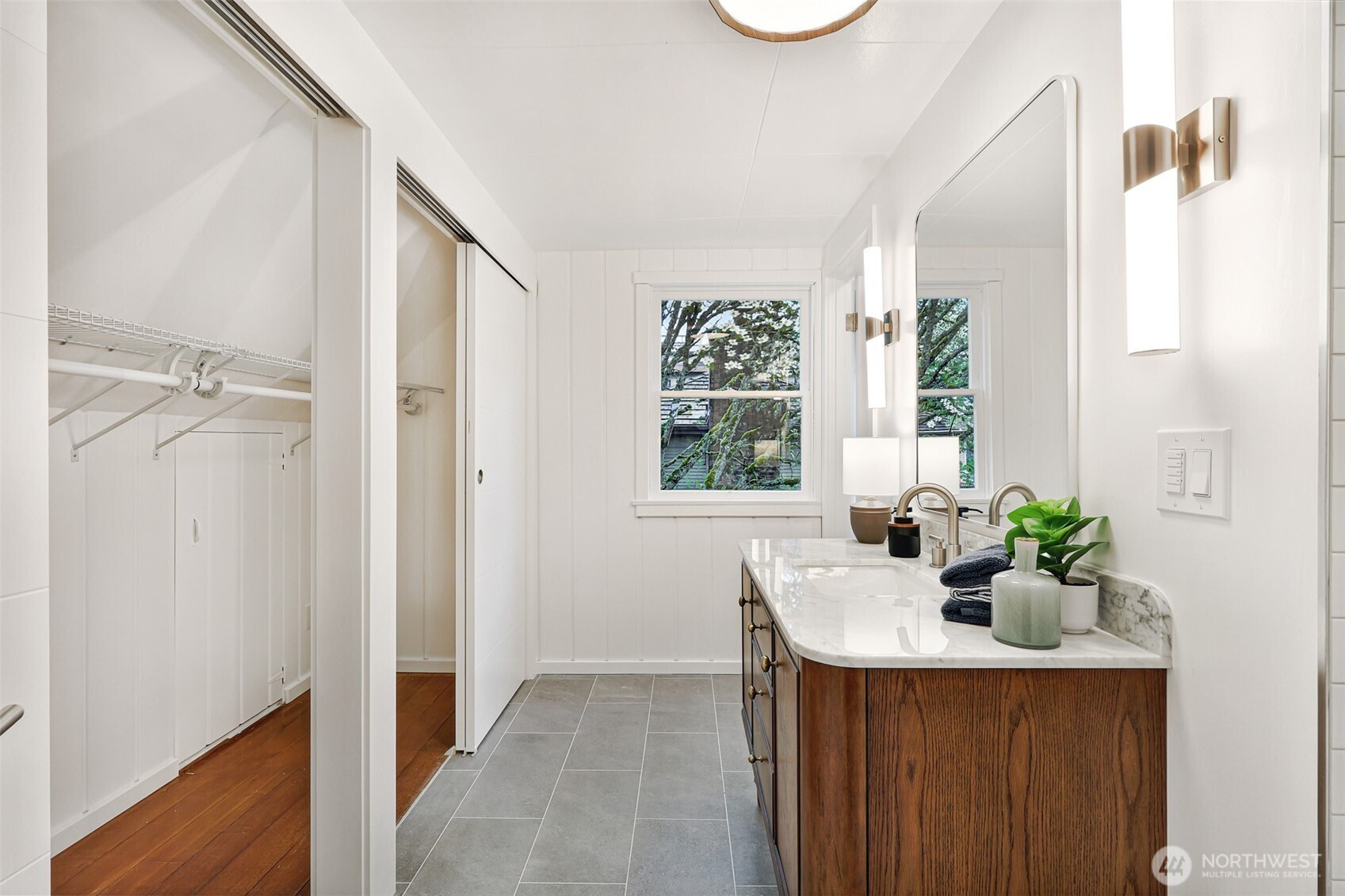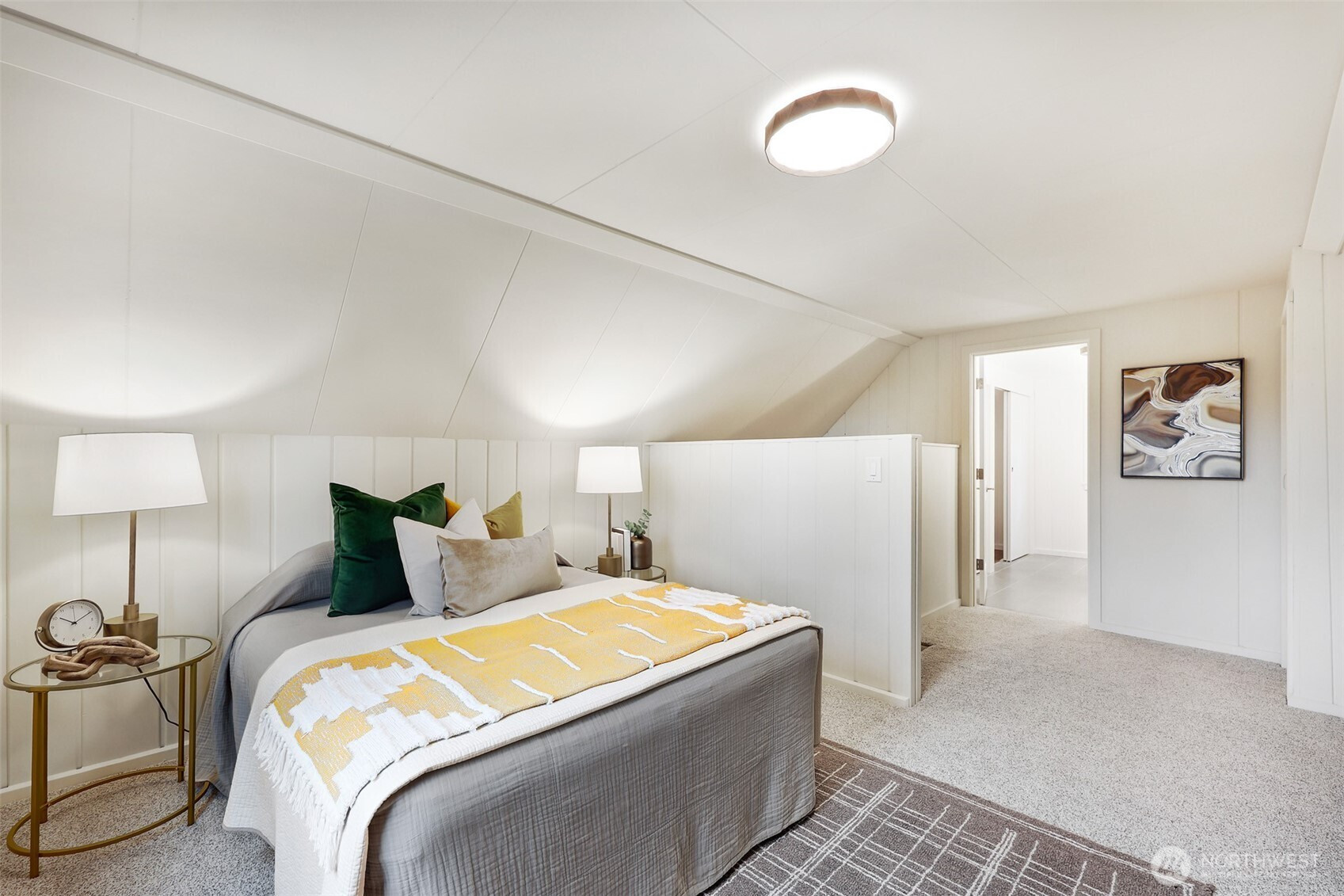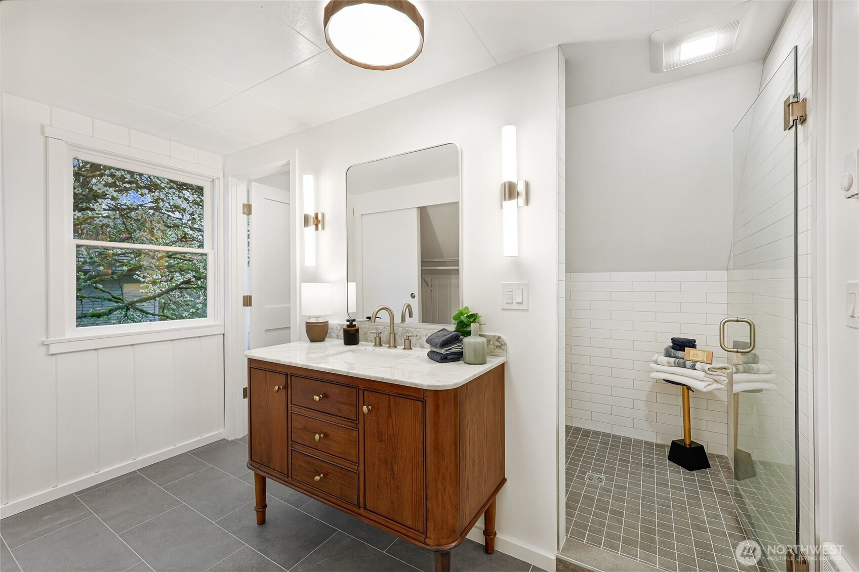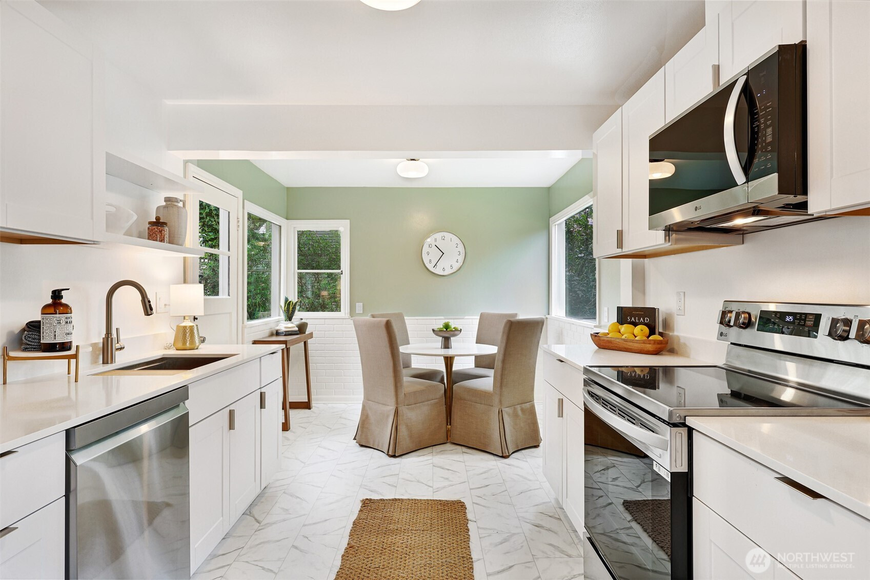 Updated copy per seller requests: Thoughtfully maintained Bryant home situated on a corner lot with elegant, mature landscaping. A gracious living room bathed in natural light and featuring a fireplace and hardwoods welcomes you at the front door. Chefs will love the newly updated kitchen with all new appliances and cabinets. Entertainers will enjoy the dining room adjoining the kitchen and living room, as well as the two outdoor decks for year-round pleasure. The first, accessible right off the kitchen's breakfast nook, offers ample shade for outdoor relaxation. The second is a south-facing rooftop deck off the living room, ideal for enjoying sunny PNW days. Two bedrooms and a full bath are on the main level. Upstairs features a newly updated primary bedroom with an ensuite bath. Lower level flex room, laundry area, non-conforming fourth bedroom, storage space, and a large attached garage. New heat pump HVAC system with central heat and AC. Ideally located on a quiet residential street near popular amenities, including University Village, PCC, Bryant Playground Park, and more. Welcome home!