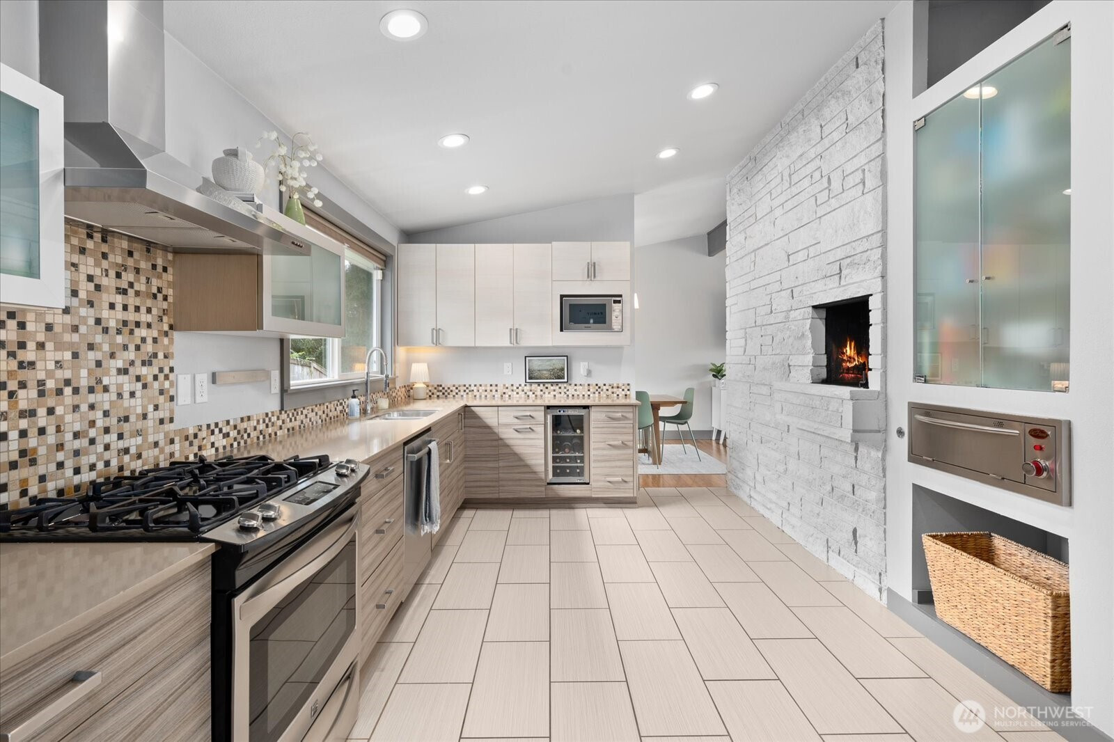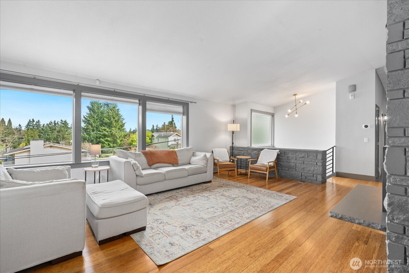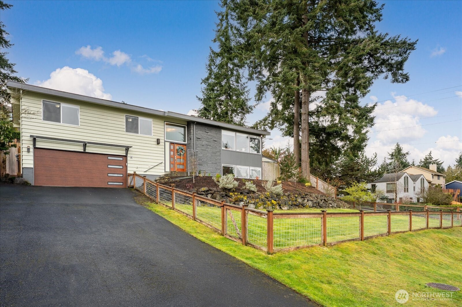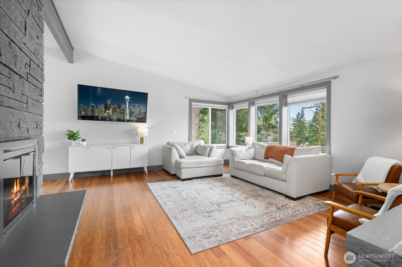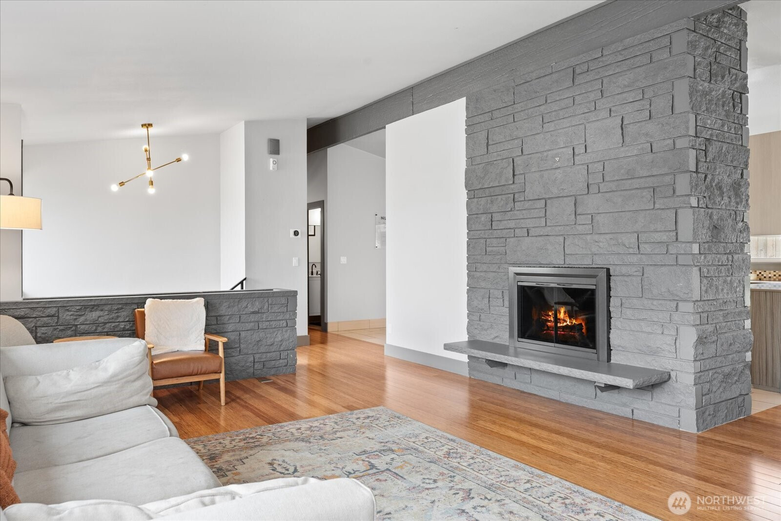 Move in ready! This 4-bedroom, 3-bath home sits on a spacious corner lot, elevated above the street for added privacy and curb appeal. The fully fenced, low-maintenance yard and expansive deck create the perfect setting for outdoor living and entertaining. Inside, vaulted ceilings and abundant natural light highlight the home’s warm, Northwest contemporary style. Stunning bamboo hardwood floors flow throughout the main living areas, while the living room is anchored by a striking stone gas fireplace. The dining area seamlessly connects to the outdoors through a sliding door, opening to a full-length deck that extends your living space. The contemporary kitchen features sleek quartz countertops, large-format tile flooring, and stainless steel appliances—designed for everyday living and hosting. The serene primary suite offers a private retreat with its own sliding door access to the deck, primary bath with heated floors. Downstairs, the lower level boasts a spacious family room with a second gas fireplace, a large laundry room with ample storage, a study/work alcove, and a versatile fourth bedroom with a Murphy bed alongside a ¾ bath. Additional highlights include a garage with built-in sink and work areas, and a location that’s hard to beat—just a short walk to the park and minutes from downtown Kenmore. Fully remodeled in 2015, including a new gas furnace and hot water heater, this home blends modern updates with timeless comfort. Coveted Northshore school district!