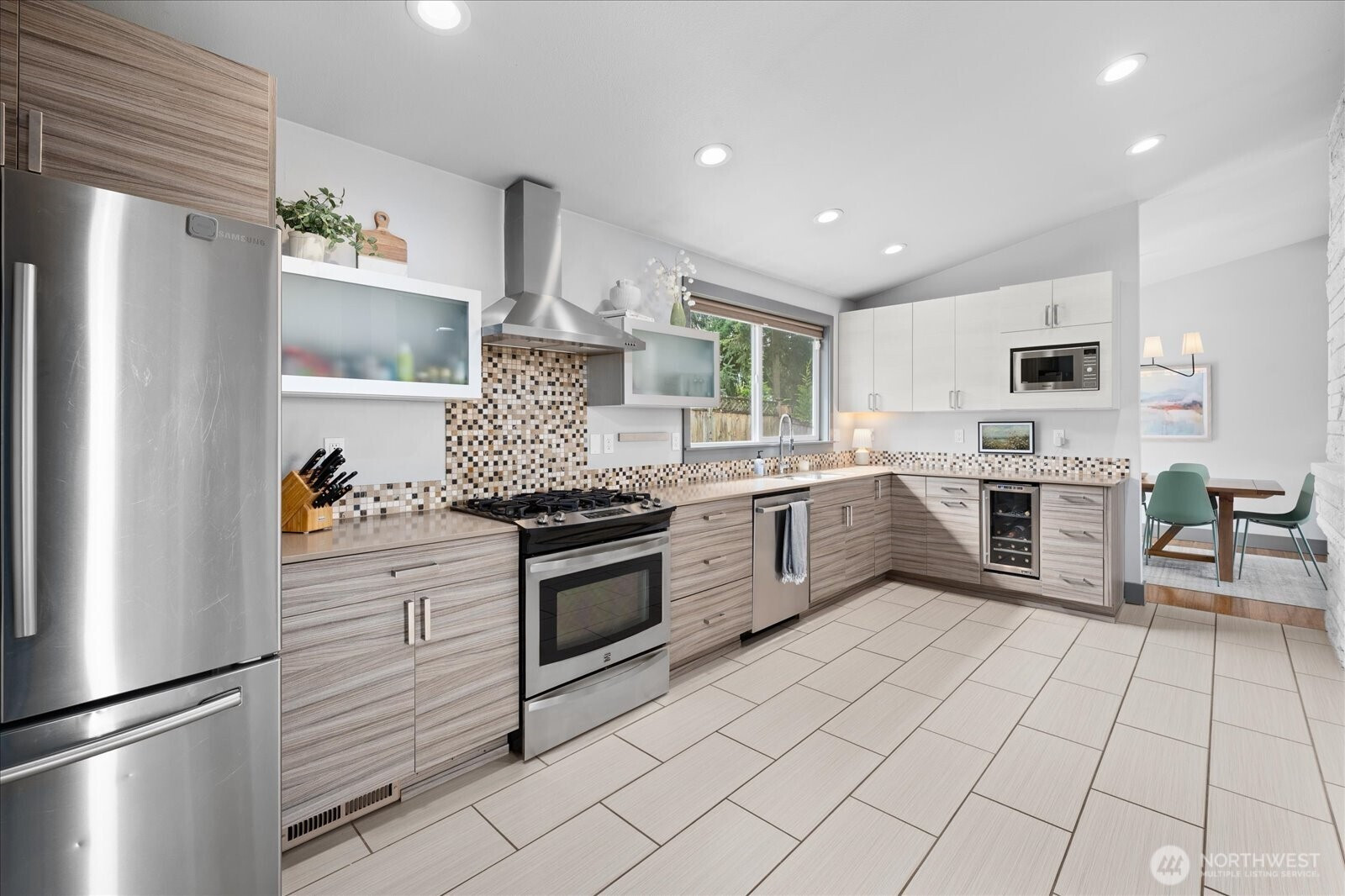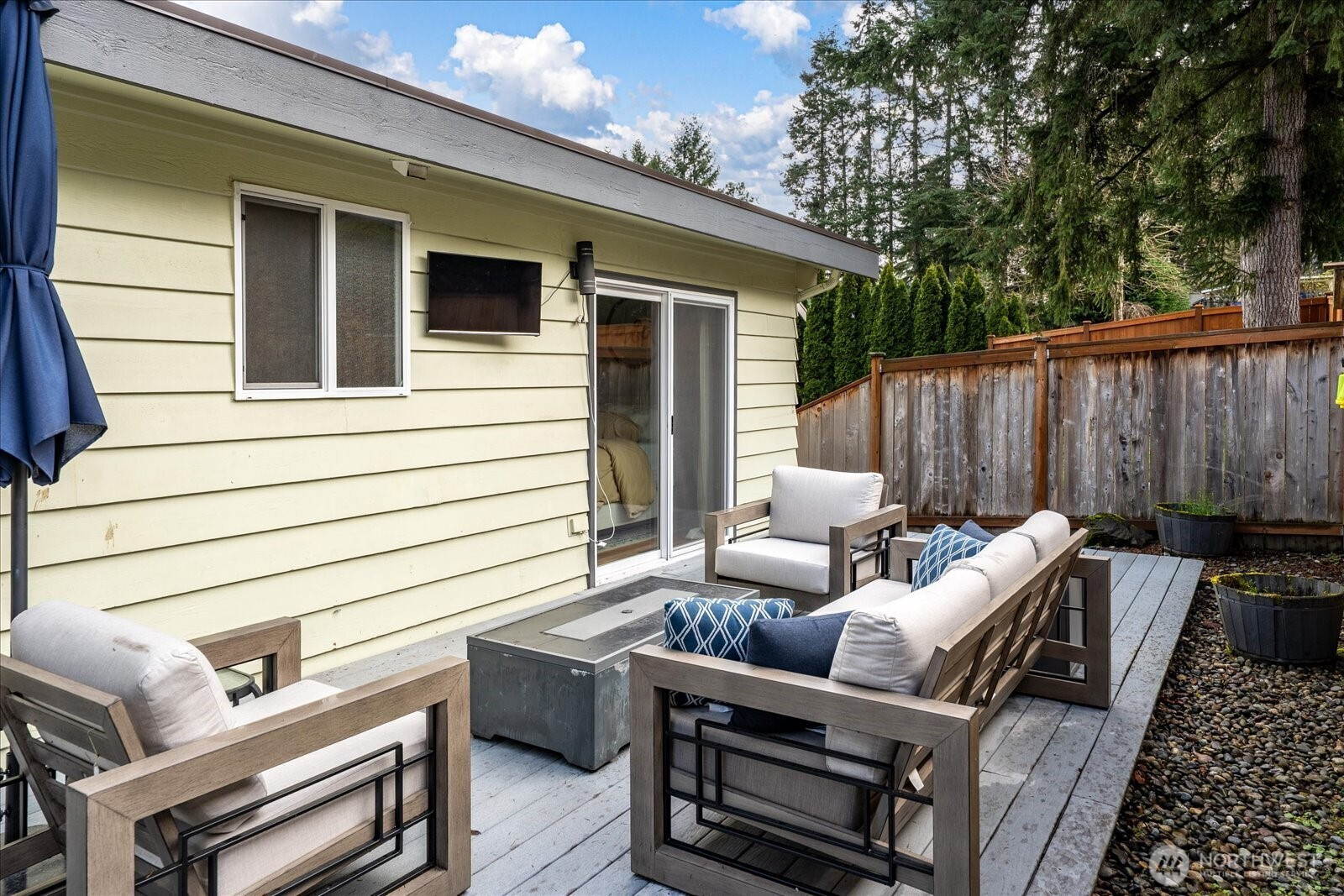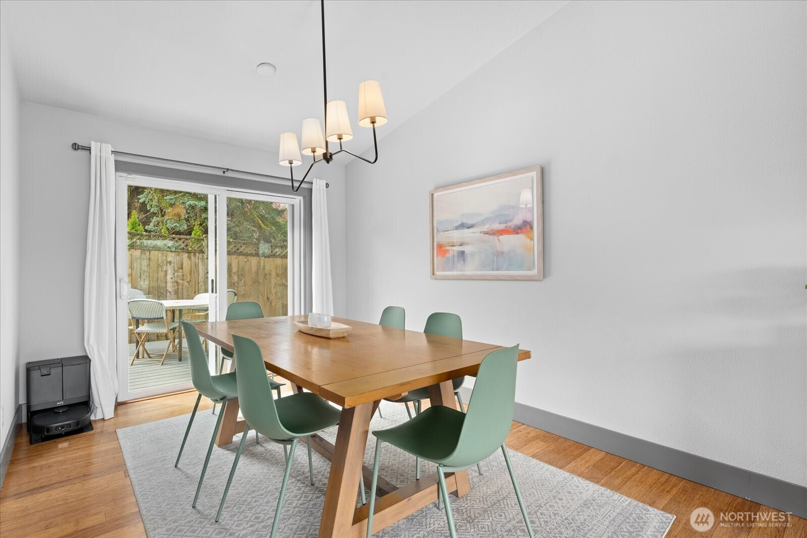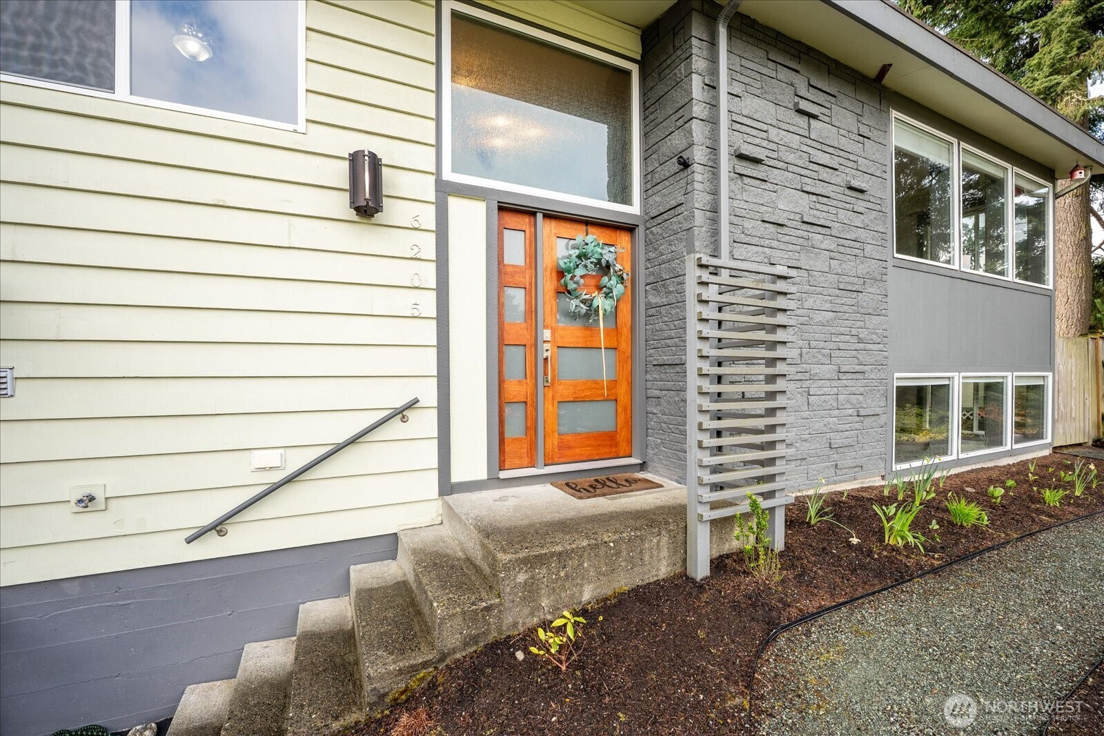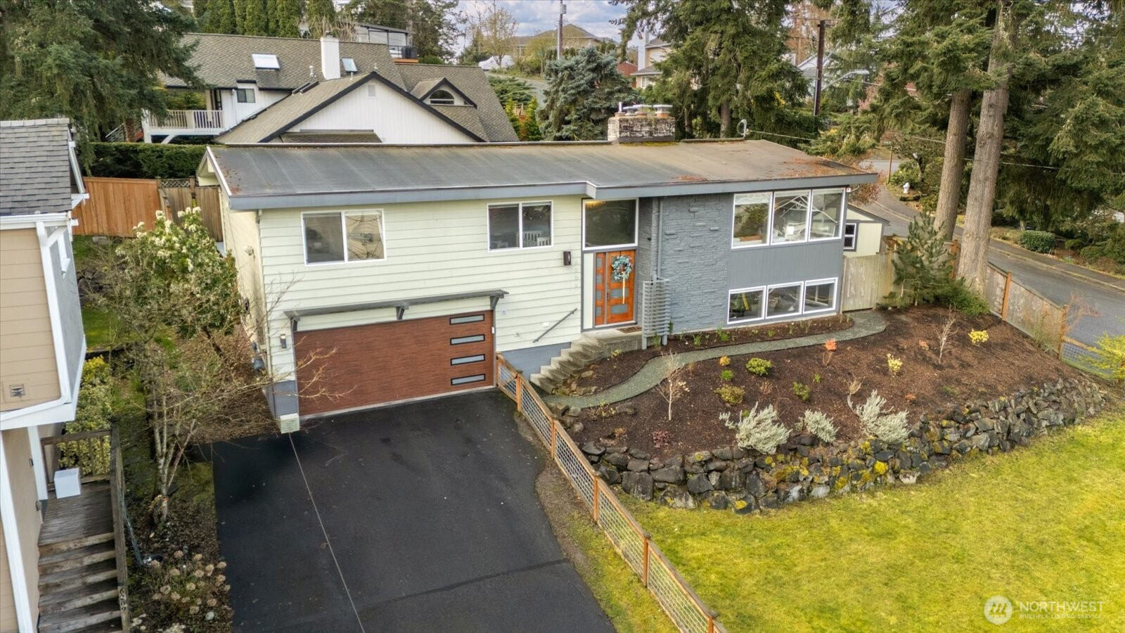 Move in ready! This 4-bedroom, 3-bath home sits on a spacious corner lot, elevated above the street for added privacy and curb appeal. The fully fenced, low-maintenance yard and expansive deck create the perfect setting for outdoor living and entertaining. Inside, vaulted ceilings and abundant natural light highlight the home’s warm, Northwest contemporary style. Stunning bamboo hardwood floors flow throughout the main living areas, while the living room is anchored by a striking stone gas fireplace. The dining area seamlessly connects to the outdoors through a sliding door, opening to a full-length deck that extends your living space. The contemporary kitchen features sleek quartz countertops, large-format tile flooring, and stainless steel appliances—designed for everyday living and hosting. The serene primary suite offers a private retreat with its own sliding door access to the deck, primary bath with heated floors. Downstairs, the lower level boasts a spacious family room with a second gas fireplace, a large laundry room with ample storage, a study/work alcove, and a versatile fourth bedroom with a Murphy bed alongside a ¾ bath. Additional highlights include a garage with built-in sink and work areas, and a location that’s hard to beat—just a short walk to the park and minutes from downtown Kenmore. Fully remodeled in 2015, including a new gas furnace and hot water heater, this home blends modern updates with timeless comfort. Coveted Northshore school district!
