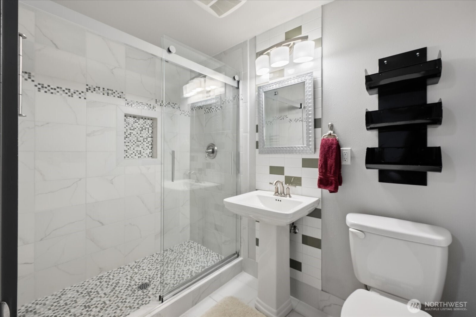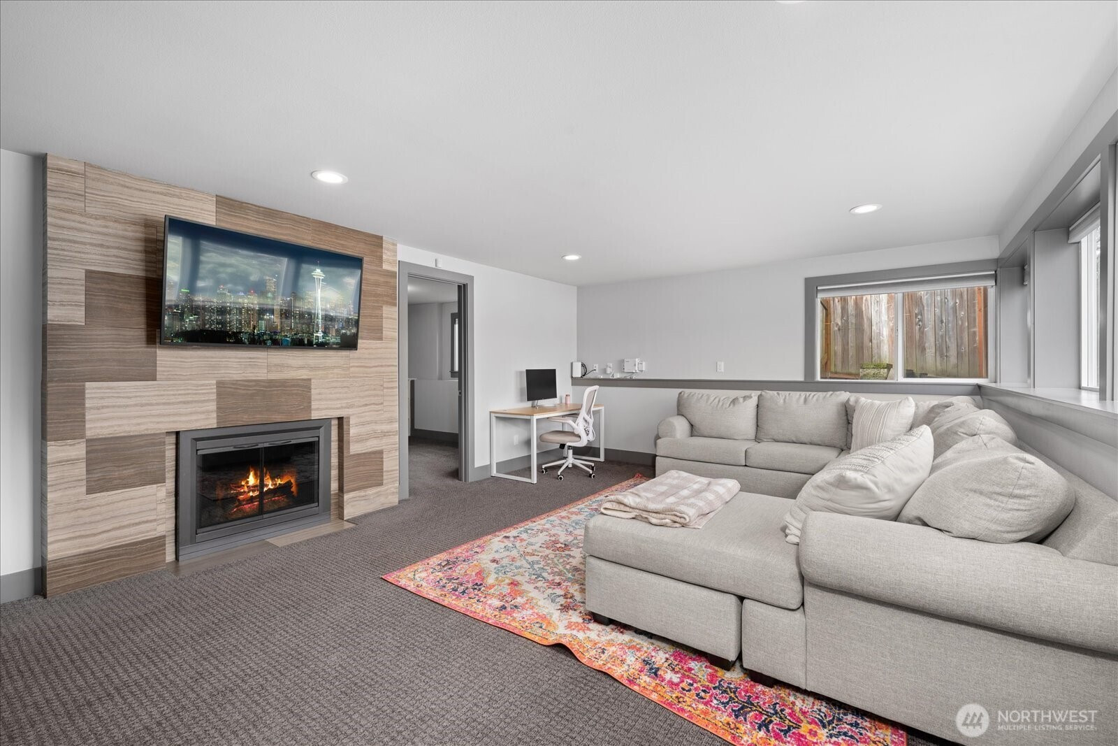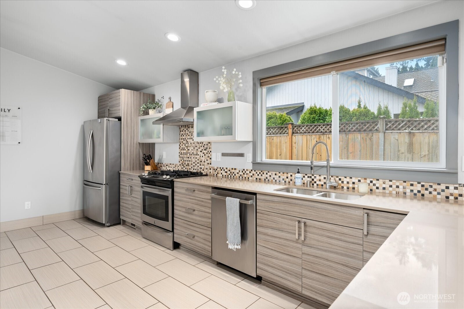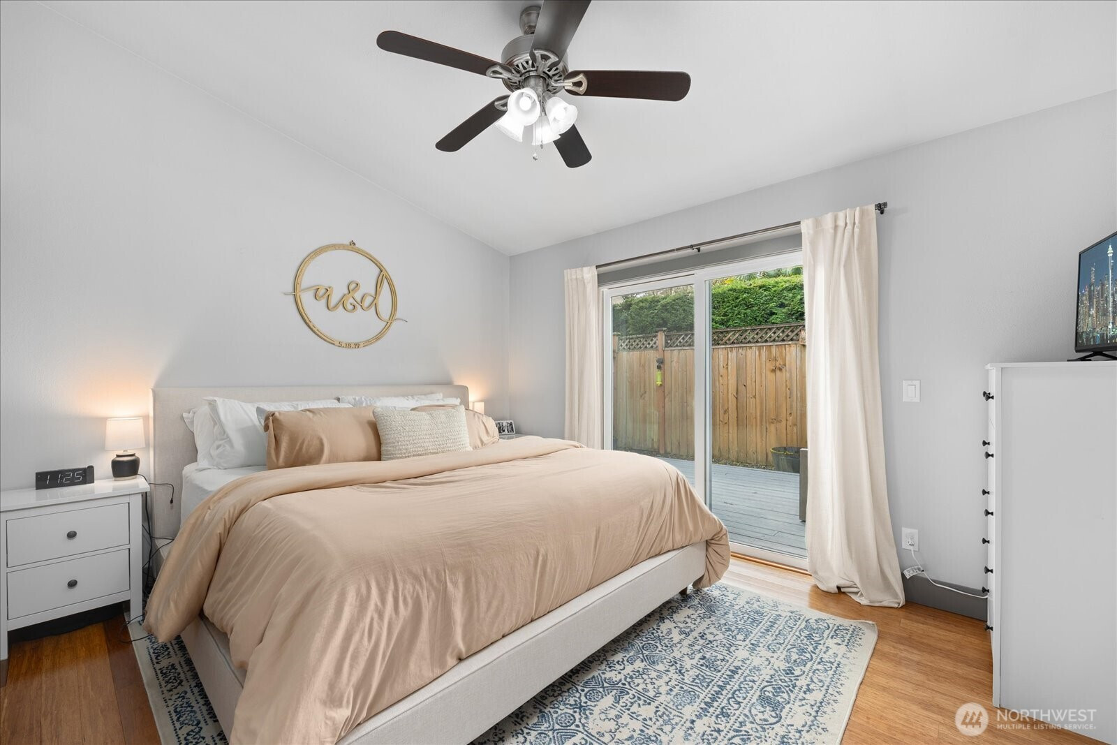Move in ready! This 4-bedroom, 3-bath home sits on a spacious corner lot, elevated above the street for added privacy and curb appeal. The fully fenced, low-maintenance yard and expansive deck create the perfect setting for outdoor living and entertaining. Inside, vaulted ceilings and abundant natural light highlight the home’s warm, Northwest contemporary style. Stunning bamboo hardwood floors flow throughout the main living areas, while the living room is anchored by a striking stone gas fireplace. The dining area seamlessly connects to the outdoors through a sliding door, opening to a full-length deck that extends your living space. The contemporary kitchen features sleek quartz countertops, large-format tile flooring, and stainless steel appliances—designed for everyday living and hosting. The serene primary suite offers a private retreat with its own sliding door access to the deck, primary bath with heated floors. Downstairs, the lower level boasts a spacious family room with a second gas fireplace, a large laundry room with ample storage, a study/work alcove, and a versatile fourth bedroom with a Murphy bed alongside a ¾ bath. Additional highlights include a garage with built-in sink and work areas, and a location that’s hard to beat—just a short walk to the park and minutes from downtown Kenmore. Fully remodeled in 2015, including a new gas furnace and hot water heater, this home blends modern updates with timeless comfort. Coveted Northshore school district!