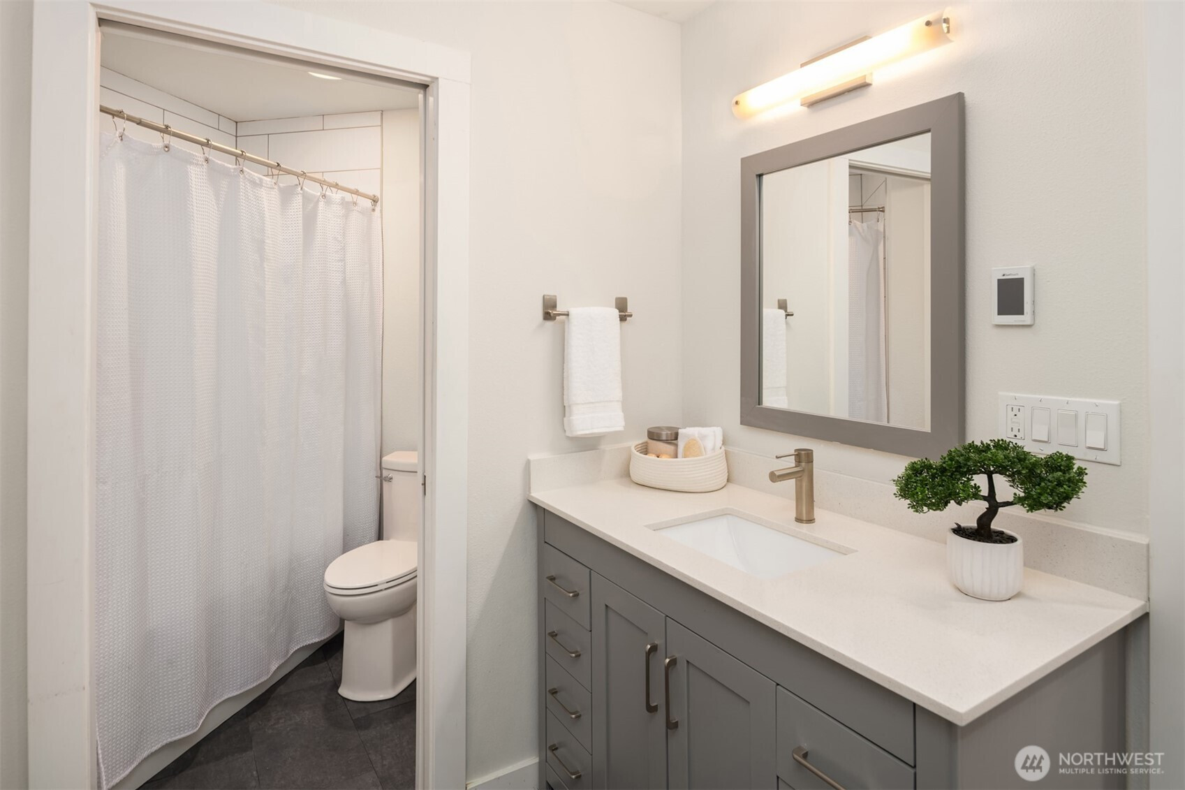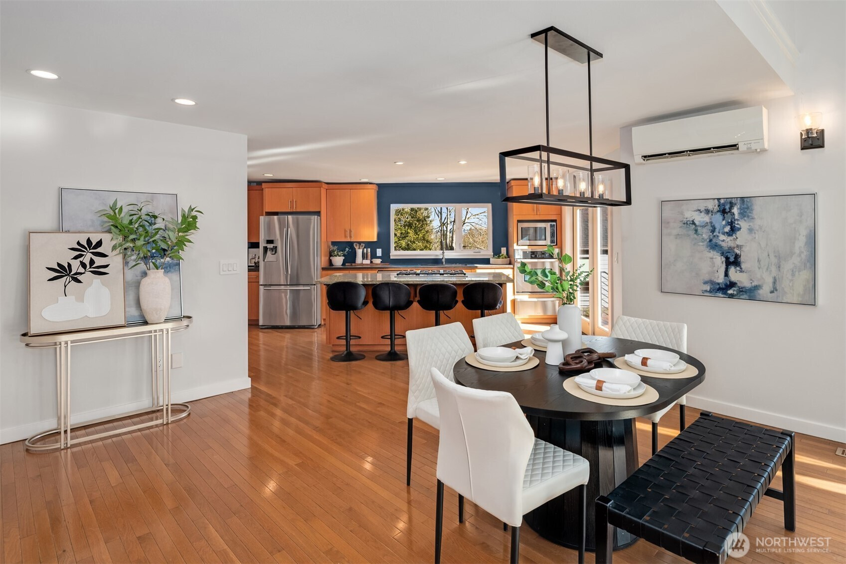 Welcome home to this beautifully appointed 4 bedroom, 2.5 bathroom residence offering elevated city living in Northeast Seattle. Vaulted ceilings and expansive windows create an airy feel, while the open concept main level flows seamlessly between the living, dining, and kitchen spaces, ideal for both everyday living and entertaining.The stylish kitchen features granite and concrete counters, stainless steel appliances, a wet bar, and a walk in pantry with utility space. Just off the kitchen, a spacious deck invites effortless indoor outdoor gatherings. Upstairs, the primary suite feels like a private retreat with a soaking tub, rain shower, and walk in closet. The lower level features three additional bedrooms, providing flexibility for guests to have a home office, or art room, along with a cozy bonus room that opens to a large patio, private yard, and salt water hot tub. The rooftop deck truly sets this home apart, complete with its own mini wet bar and gas BBQ hookup, perfect for sunset evenings and territorial views. Fresh paint and new carpet make this home move in ready. Located just minutes to Magnuson Park and University Village, with easy access to dining, shopping, recreation, and commuter routes, this is comfort and convenience at its finest.