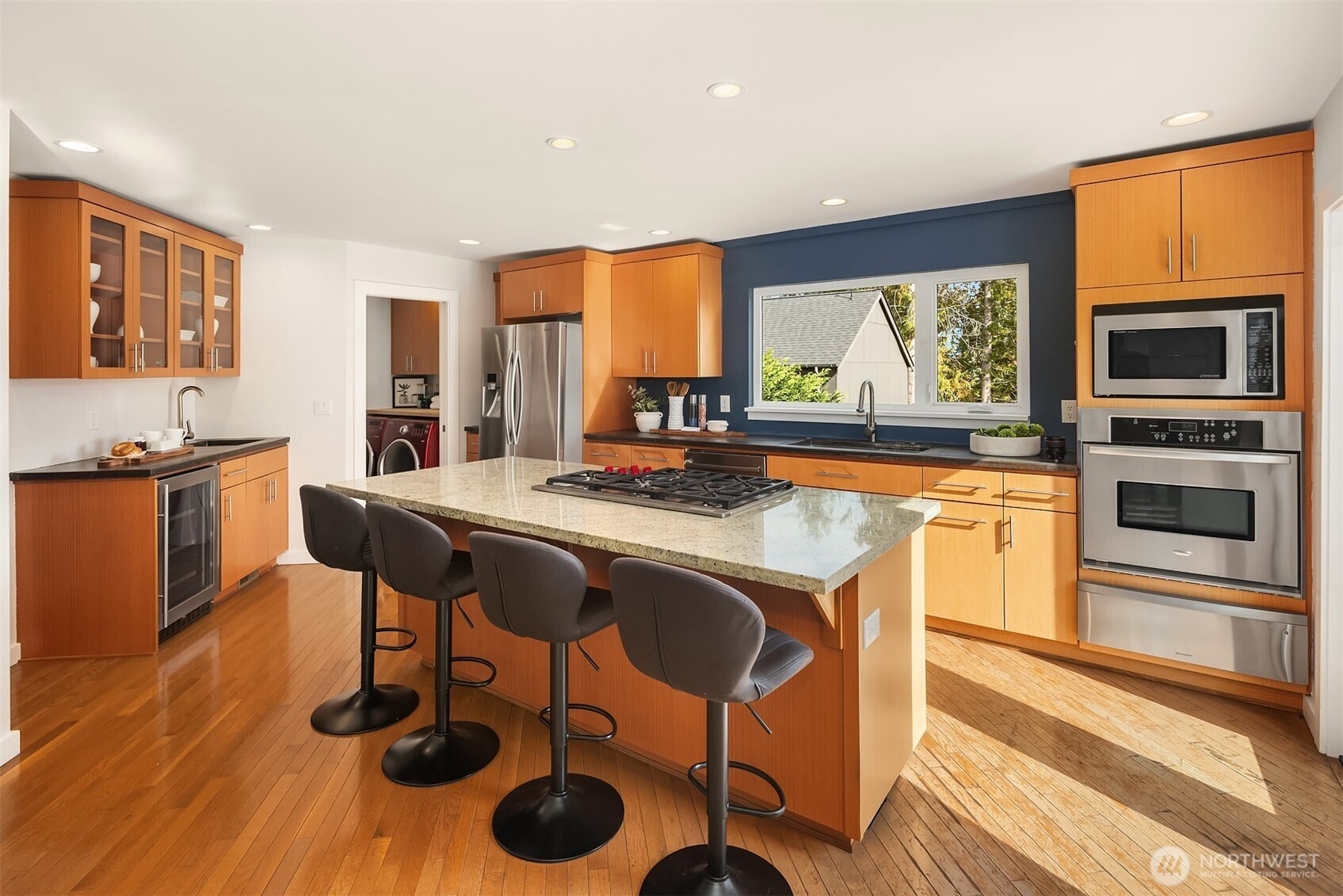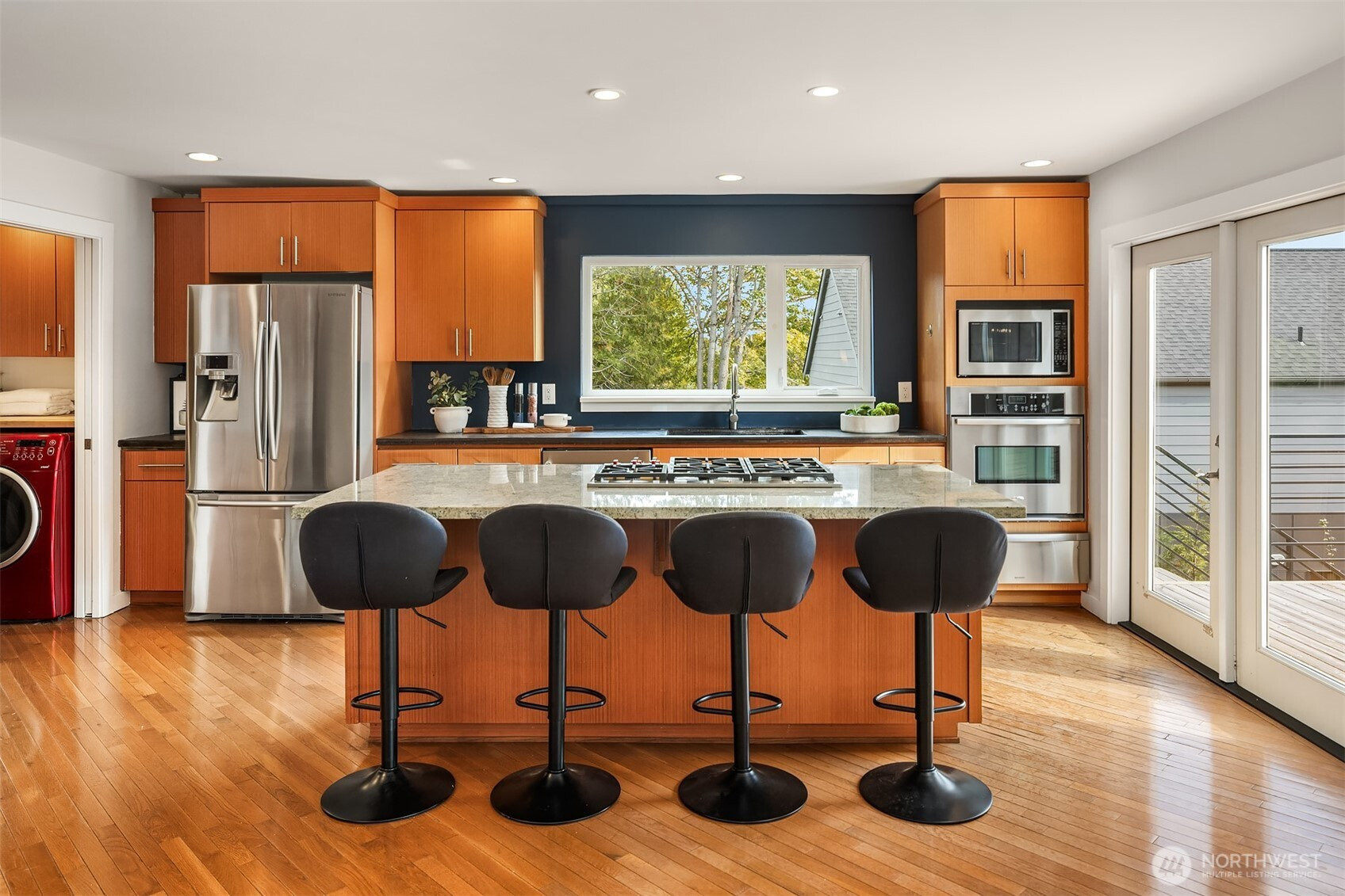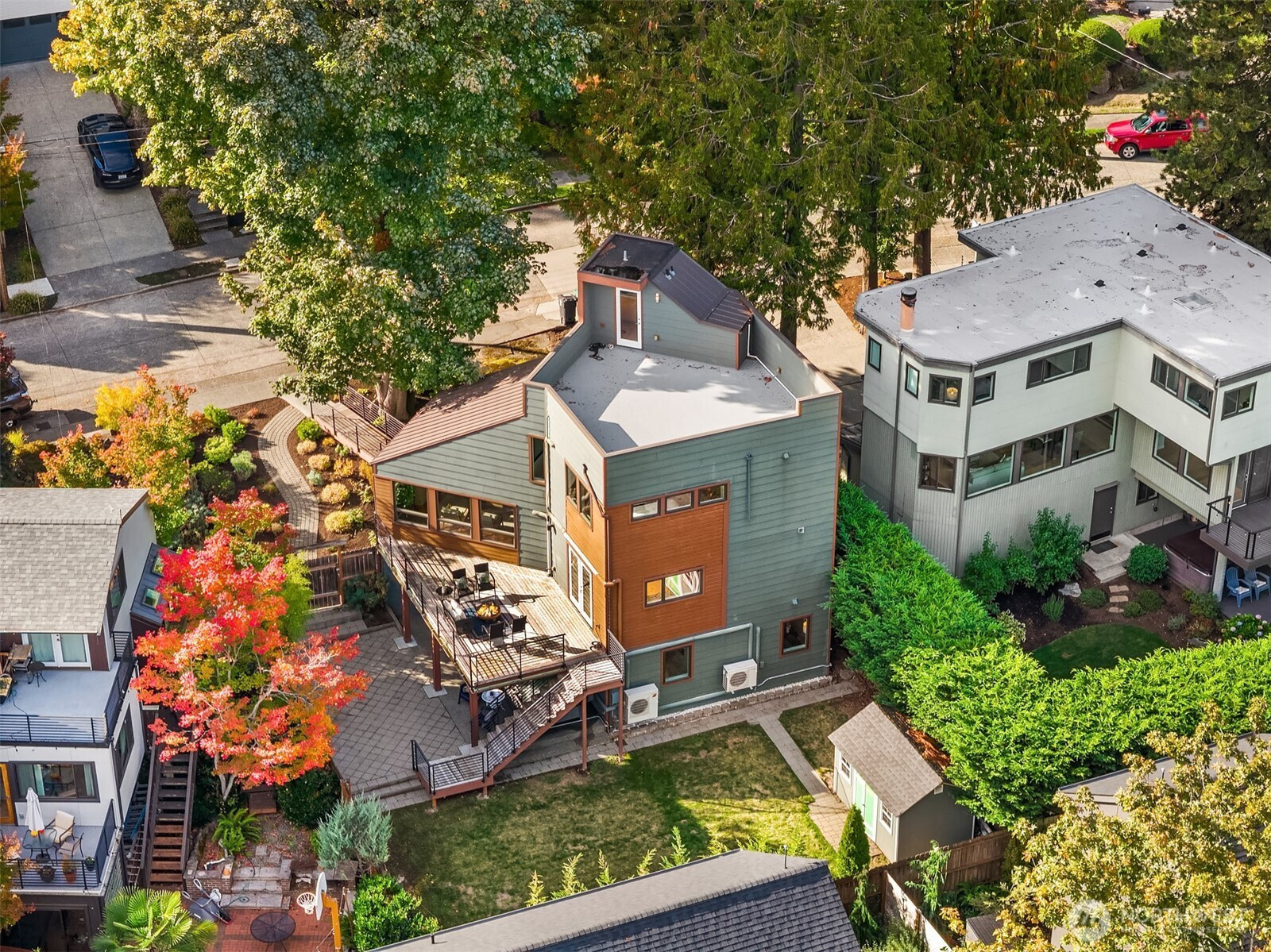 Cool, contemporary, and full of light. Vaulted ceilings, and lots of windows. This home offers open-concept living at its best. The stylish kitchen features granite and concrete counters, stainless appliances, a wet bar, and a walk-in pantry/utility room. Kitchen opens to a spacious deck made for entertaining. Upstairs, the primary suite feels like a retreat with its soaking tub, rain shower, and walk-in closet. The rooftop deck takes it up a notch with its own wet bar and gas BBQ hookup — perfect for sunset hangouts. Downstairs offers flexible space with 3 bedrooms, full bath, and a cozy rec room that opens to a large patio, private yard and newer salt water hot tub. Fresh paint, new carpet, beautifully staged — this home is a total gem.