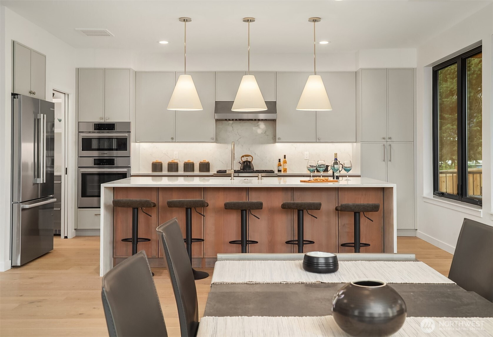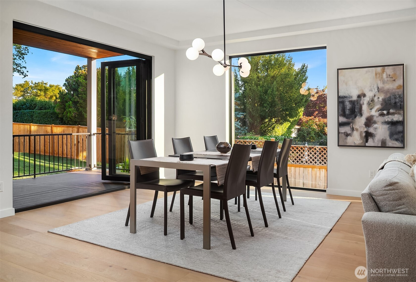 This gorgeous new NW Contemporary home has it all! Enjoy the gourmet kitchen with oversized quartz waterfall island, Bosch/Wolf appliances, and walk-in pantry. Find your focus in its sunlit office and relax in the large living room with fireplace, built-ins, and wide-plank hardwood floors. Entertain in the dining room with panoramic views and nano doors for seamless indoor/outdoor living onto the covered deck and huge backyard. Upstairs has 4 light-filled bedrooms including a primary suite with a five-piece heated-floor bath. The lower level contains a 1 bed/1 bath suite, 2nd full kitchen, living room, and separate entry, plus a rec room, 2-car garage, and mudroom. Perfectly located near Bryant Park, PCC, Seattle Children’s, and U-Village.